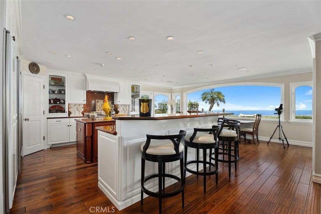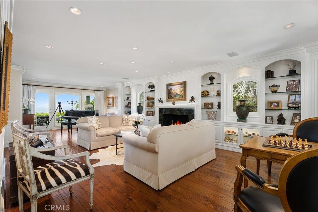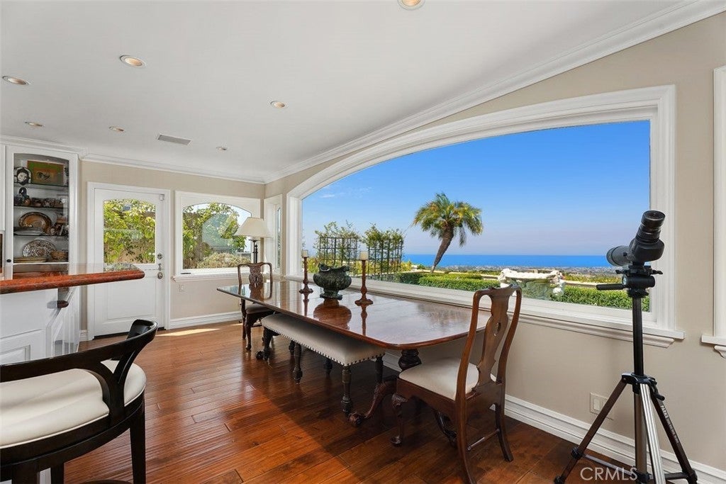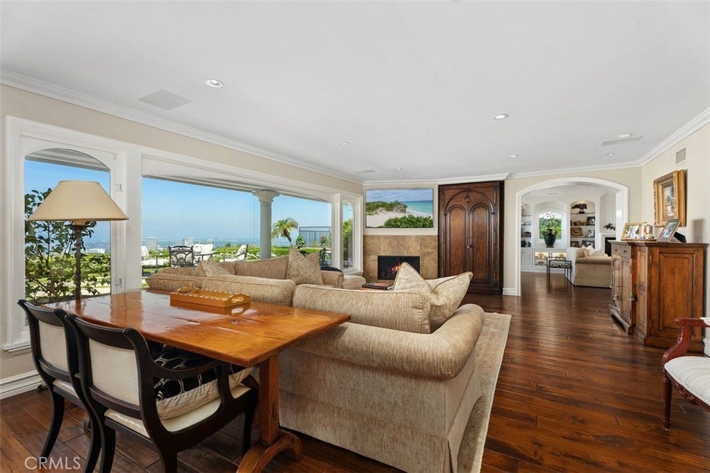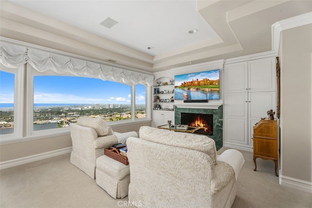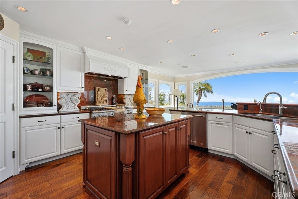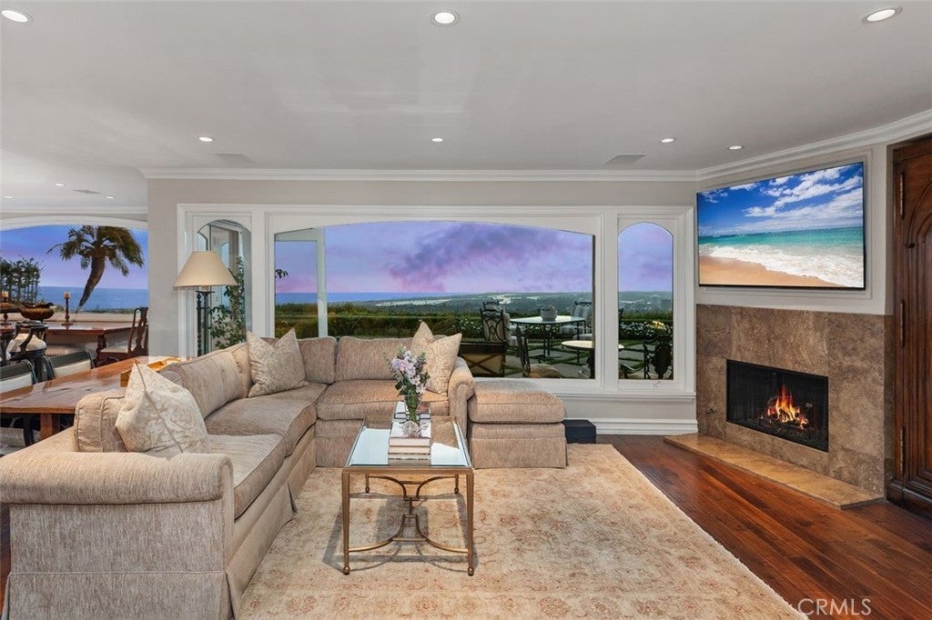 This stunning custom home boasts absolutely breathtaking, panoramic 180-degree views of the coastline featuring dramatic views of Catalina, the Newport Harbor, Palos Verdes, and Los Angeles. Extensively renovated in 2019 , the impeccable quality craftsmanship is evident throughout. The dramatic entry has cathedral ceilings and features a formal dining room to the left with custom wood paneling and a formal living room to the right with marble fireplace, custom cabinetry, and beautiful walnut hardwood floors throughout. The great room concept features a gourmet kitchen that is a chef's dream, featuring Rosso Levanto marble countertops, a full-size Subzero refrigerator and freezer, and Thermador appliances, including a six-burner stove with a griddle, double ovens, and a microwave with a heating drawer and delightful barstool seating and dining table. The kitchen also opens to a wet bar area complete with a Subzero wine fridge, two GE drink drawers, a GE Monogram wine fridge, a KitchenAid ice machine, and a spacious family room perfect for entertaining. The downstairs level also includes a guest bedroom en-suite with a marble shower and Carrera marble accents, a dedicated laundry area with a Maytag washer and dryer. Upstairs, you'll find three bedrooms, an office, bonus room, a gym, and a luxurious primary suite with a sitting area, marble fireplace, and incredible views. Other features include a large walk-in closet and a lavish bathroom featuring Crema Marfil marble floors and countertops. The home is in pristine condition, offering modern luxury, timeless elegance, and exceptional views, three car garage, gated entry, and lush gardens is ideal for those seeking a move-in-ready residence in the highly sought-after community of Spyglass Hill in Corona Del Mar.