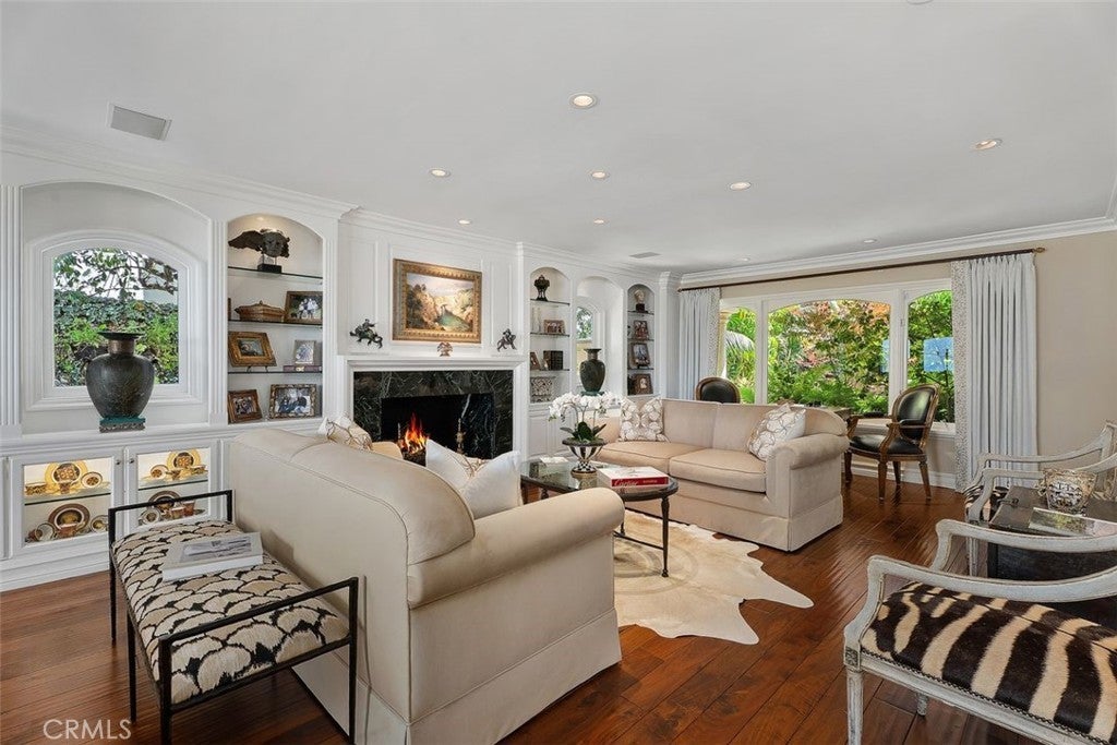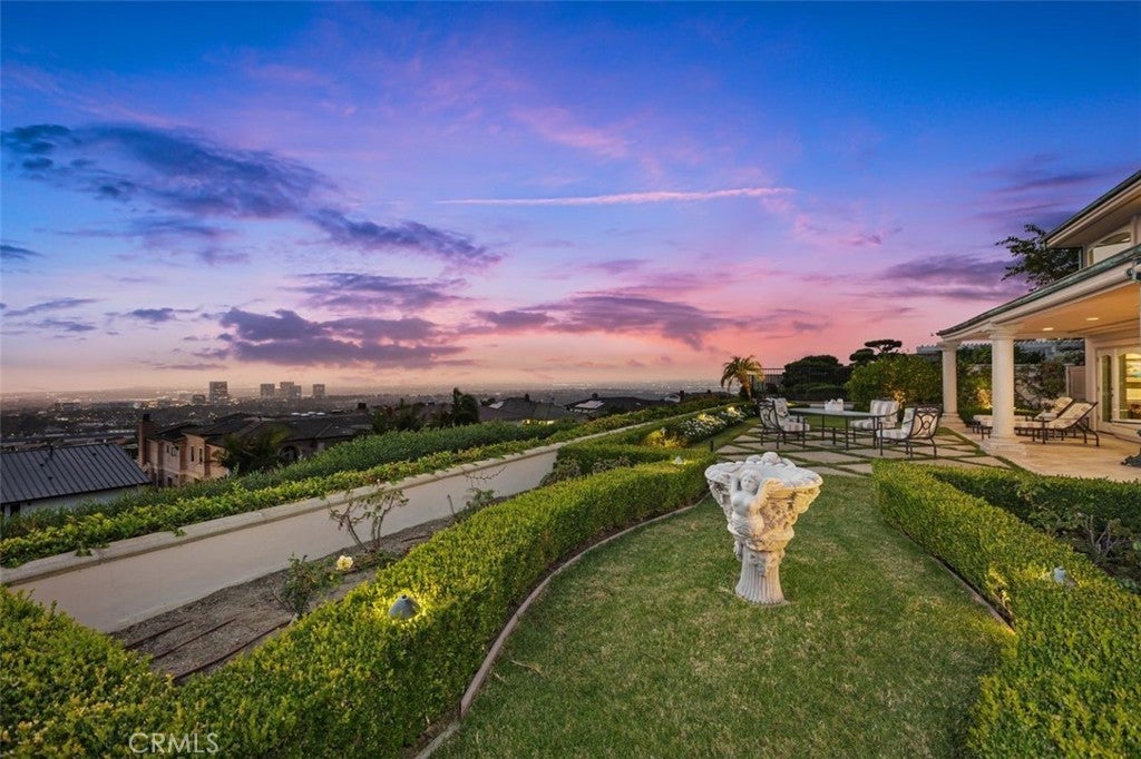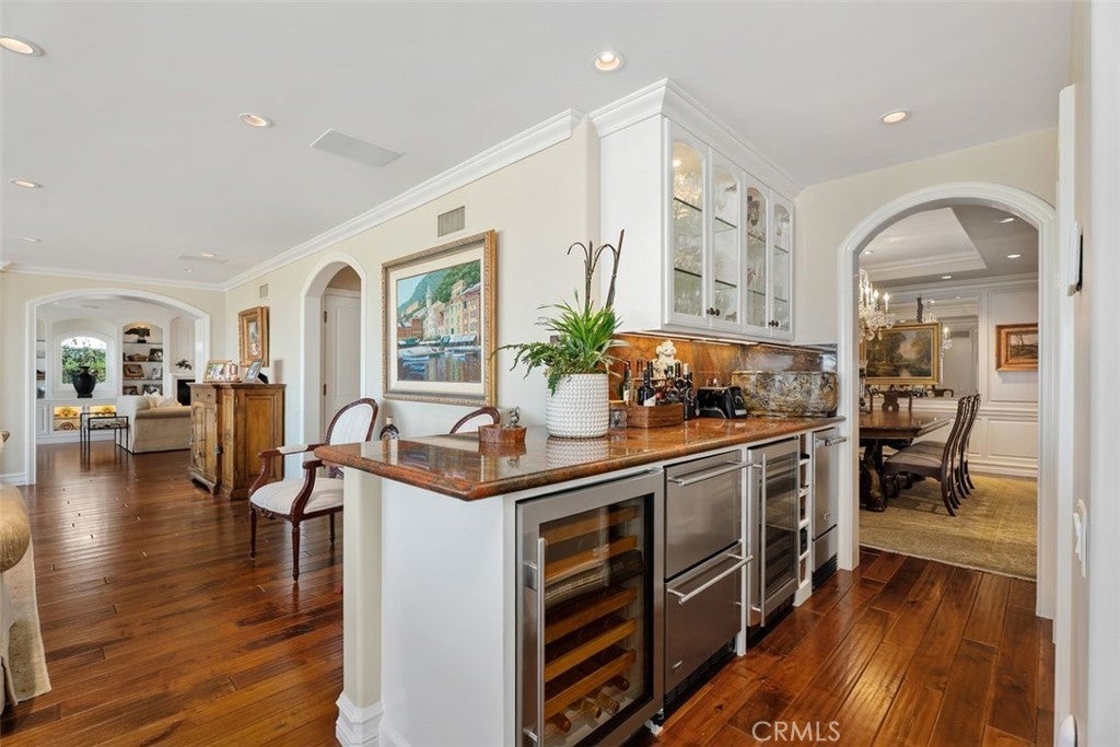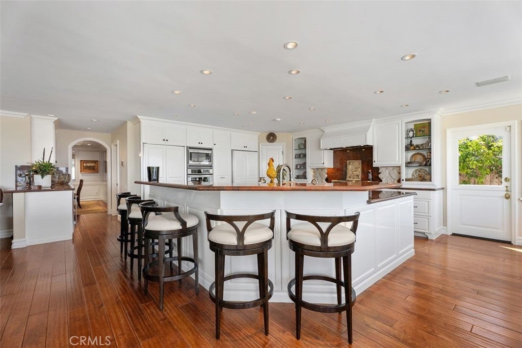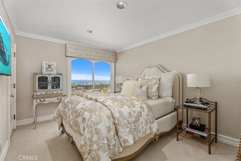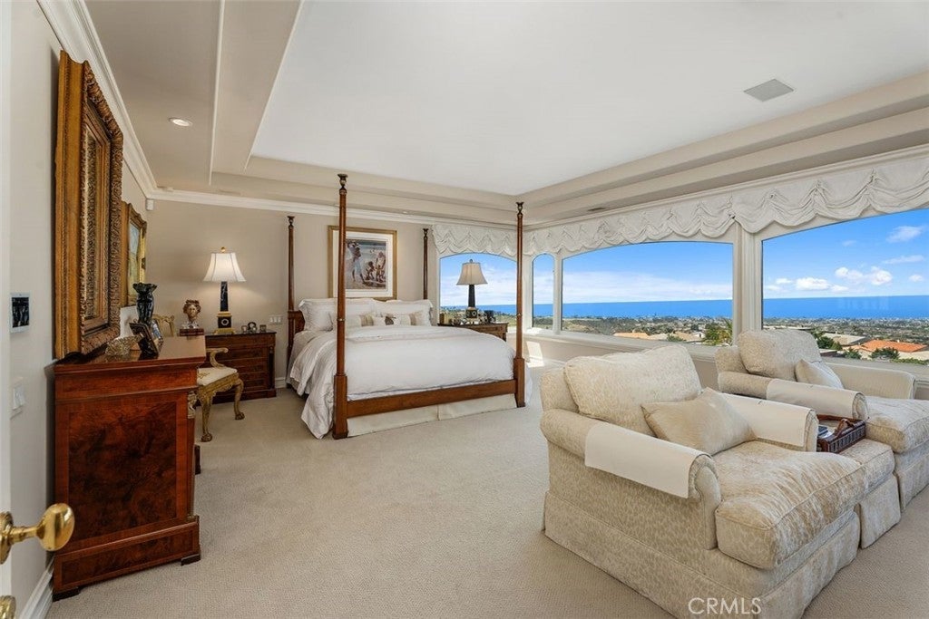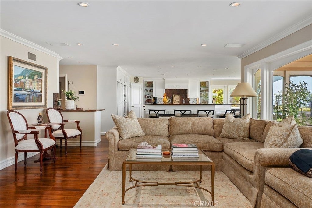 This stunning custom home boasts absolutely breathtaking, panoramic 180-degree views of the coastline featuring dramatic views of Catalina, the Newport Harbor, Palos Verdes, and Los Angeles. Extensively renovated in 2019 , the impeccable quality craftsmanship is evident throughout. The dramatic entry has cathedral ceilings and features a formal dining room to the left with custom wood paneling and a formal living room to the right with marble fireplace, custom cabinetry, and beautiful walnut hardwood floors throughout. The great room concept features a gourmet kitchen that is a chef's dream, featuring Rosso Levanto marble countertops, a full-size Subzero refrigerator and freezer, and Thermador appliances, including a six-burner stove with a griddle, double ovens, and a microwave with a heating drawer and delightful barstool seating and dining table. The kitchen also opens to a wet bar area complete with a Subzero wine fridge, two GE drink drawers, a GE Monogram wine fridge, a KitchenAid ice machine, and a spacious family room perfect for entertaining. The downstairs level also includes a guest bedroom en-suite with a marble shower and Carrera marble accents, a dedicated laundry area with a Maytag washer and dryer. Upstairs, you'll find three bedrooms, an office, bonus room, a gym, and a luxurious primary suite with a sitting area, marble fireplace, and incredible views. Other features include a large walk-in closet and a lavish bathroom featuring Crema Marfil marble floors and countertops. The home is in pristine condition, offering modern luxury, timeless elegance, and exceptional views, three car garage, gated entry, and lush gardens is ideal for those seeking a move-in-ready residence in the highly sought-after community of Spyglass Hill in Corona Del Mar.