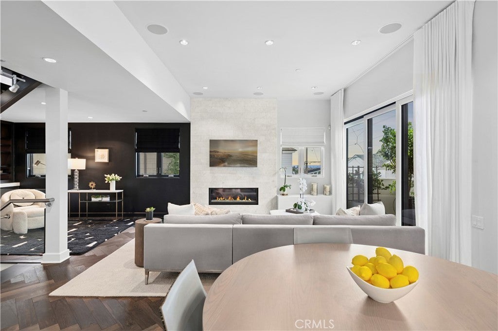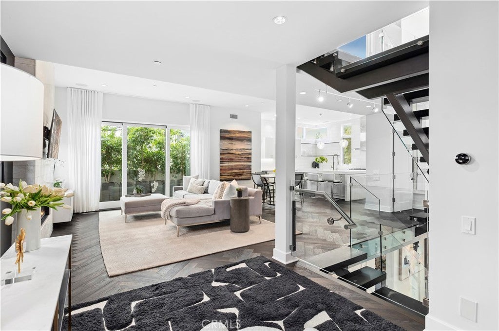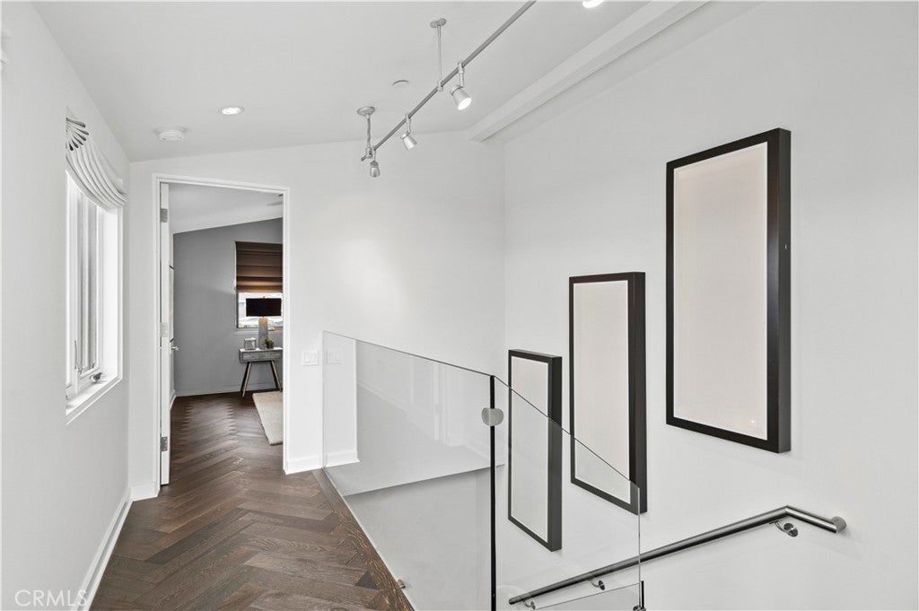 In the coveted Flower Streets, this custom 3-bedroom, 3.5-bath residence crowns an idyllic 45-foot-wide corner lot with sweeping views of the Pacific Ocean, Fashion Island, and the Pelican Hill Golf Course. An architectural showpiece, the home is defined by its dramatic 3-story steel, wood, and frameless glass staircase, a striking centerpiece that sets the tone for refined living throughout. Hardwood herringbone flooring carries a timeless elegance across each level. The main living level unfolds into a spectacular great room with 10-foot ceilings, anchored by a floor-to-ceiling marble fireplace. Host in the custom serving area complete with ice maker, wine and mini-fridge, or a chef’s kitchen with impressive marble and limestone countertops, a glass tile backsplash, a professional Thermador range refrigerator/freezer. Expansive sliding glass doors open to a private balcony, blending indoor and outdoor living. Also on this level are a sunlit guest suite and a designer powder room. The upper level is devoted to a grand primary retreat, where walls of closets and a spa-inspired bath evoke luxury at every turn. A spacious deck offers a private jacuzzi and unrivaled panoramic vistas. On the entry level, a guest suite with full bath, a large laundry area, and a garage plus double carport add both comfort and convenience. Smartly designed with Nest-controlled climate, integrated iPhone-controlled speakers, and thoughtful details throughout, this home offers the perfect balance of modern sophistication and timeless coastal style.