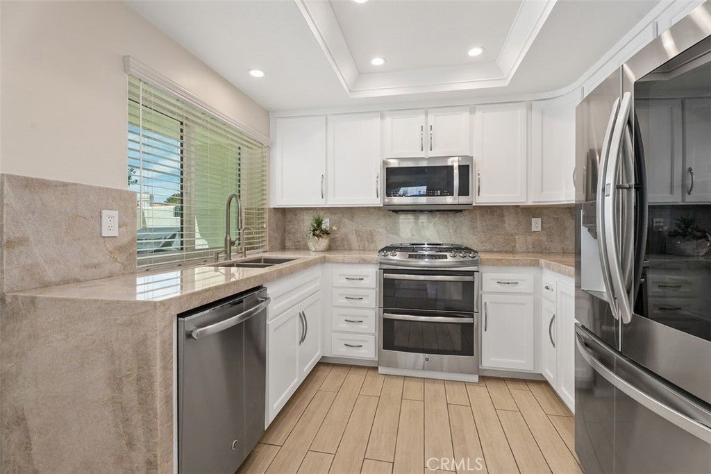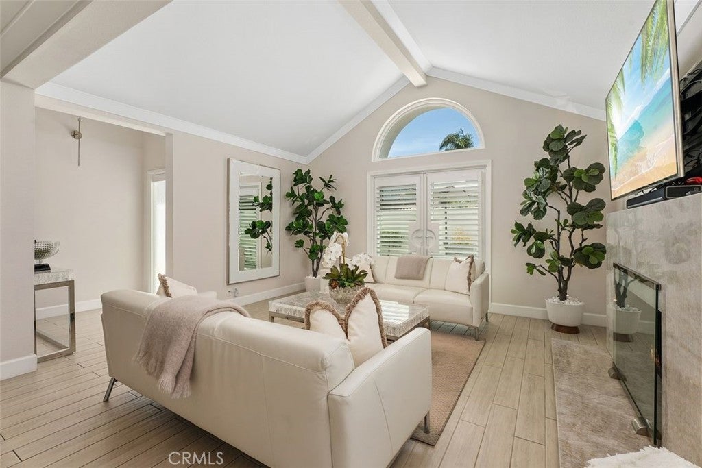 Completely remodeled and turnkey, this 3 bedroom, 2.5 bathroom, 1,601 sq. ft. home is located in the private gated community of Bayview Terrace. Set within a very private compound, the residence showcases custom paint, molding, floorboards, triple-pane windows, wood shutters, LED lighting, porcelain tile flooring throughout, and a stunning Quartzite stone fireplace. The gourmet kitchen features premium finishes, stainless steel appliances, and excellent flow for entertaining. The primary suite includes new window shutters and LED lighting. The spa-inspired primary bath offers Quartzite counters, a full Quartzite slab shower with bench, Toto toilet, porcelain tile, built-in vanity with lighting, custom closet doors, and a cabinet above the vanity. The secondary bedrooms are equally impressive, with new windows, wood shutters, mirrored closet doors, and porcelain tile flooring. One features a chandelier and a custom closet drawer setup, while the other offers a bright, open feel with updated finishes. Additional highlights include hidden under-stair storage, internet readiness, newer water heater, custom landscaping, and unmatched curb appeal. Outdoor living is enhanced with porcelain hardscaping that matches the interior, an outdoor TV, and a private setting. The two-car garage is complete with epoxy floors, cabinets, and a new garage door opener. Community amenities include pool, spa, and tennis courts. Conveniently located near Fashion Island, world-class beaches, scenic trails, and top-rated schools.