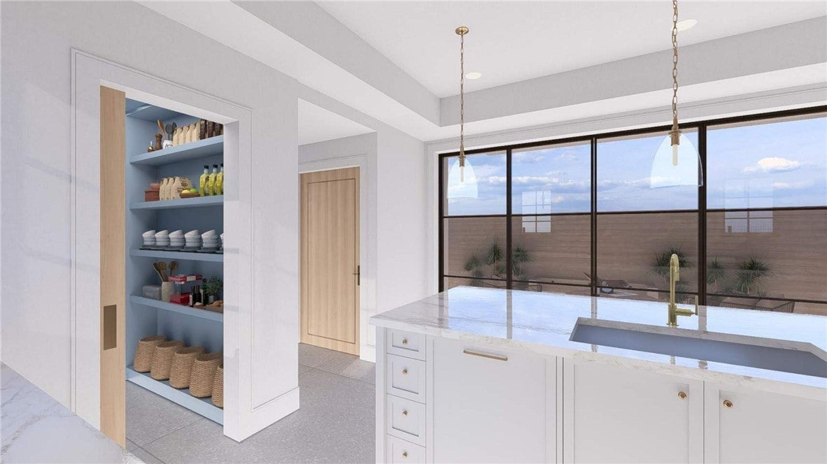 Built-in Features, High Ceilings, Open Floorplan, Bedroom on Main Level, Primary Suite, Walk-In Closet(s), Elevator, Stone Counters, Walk-In Pantry