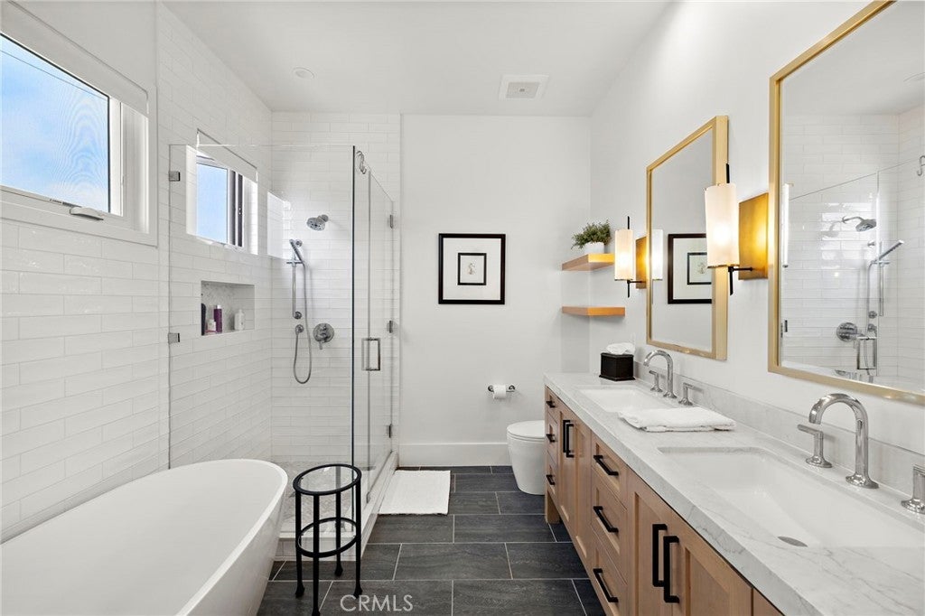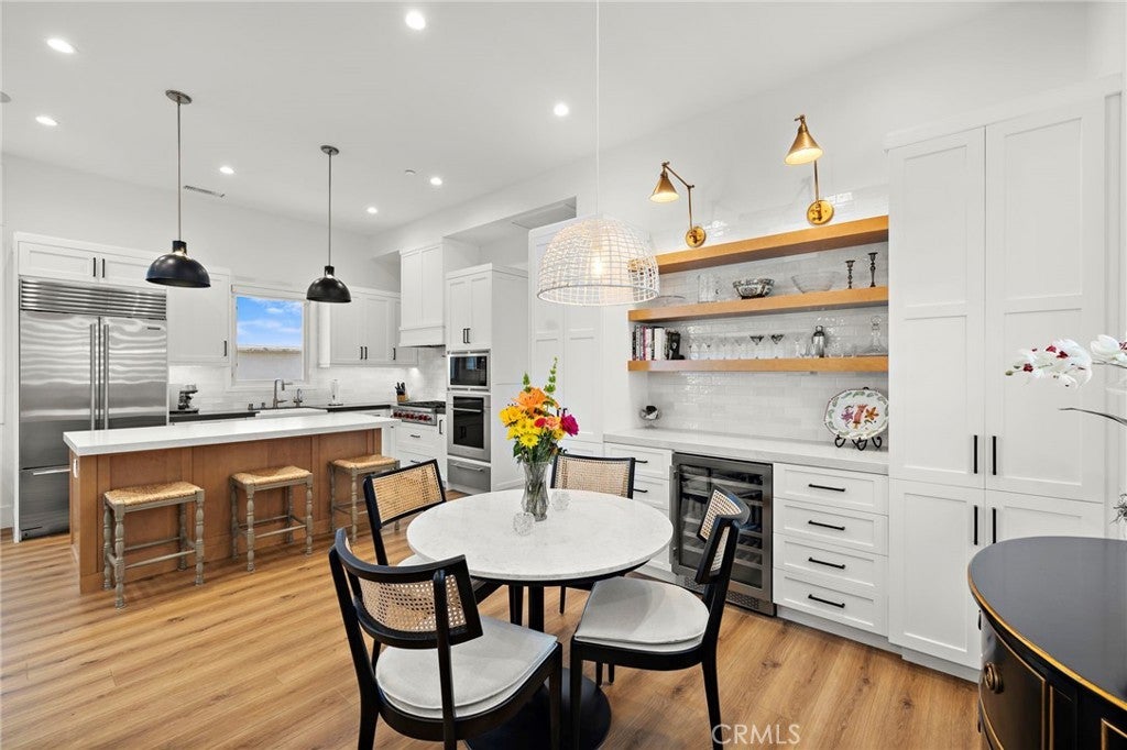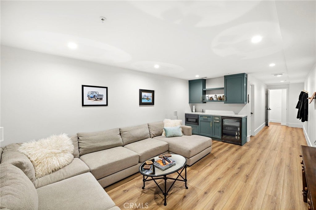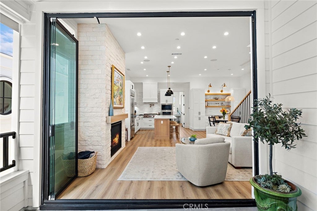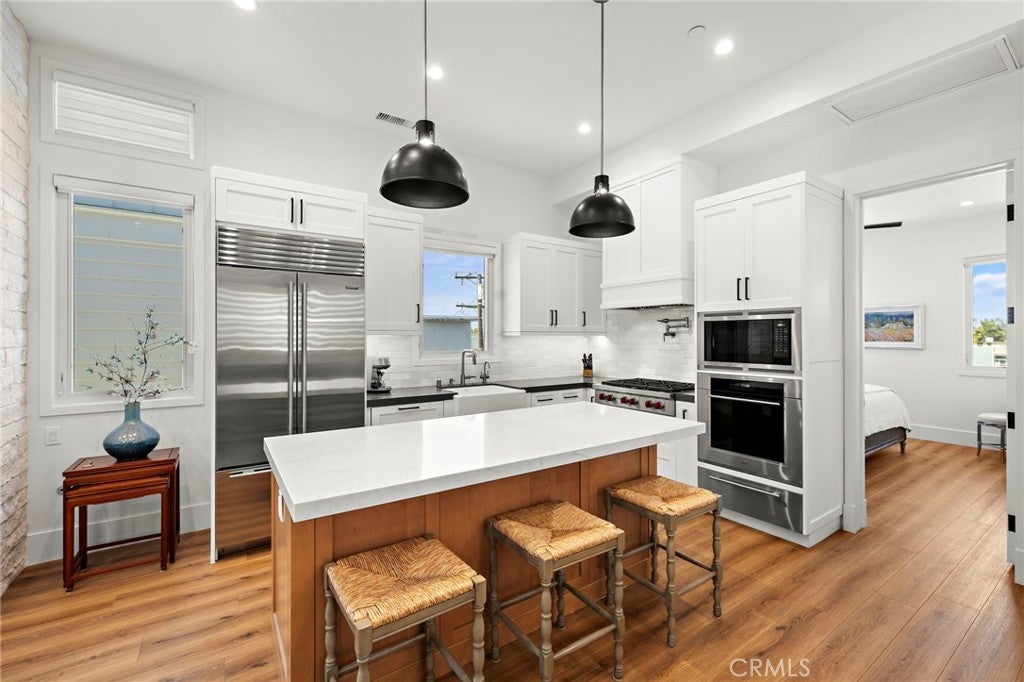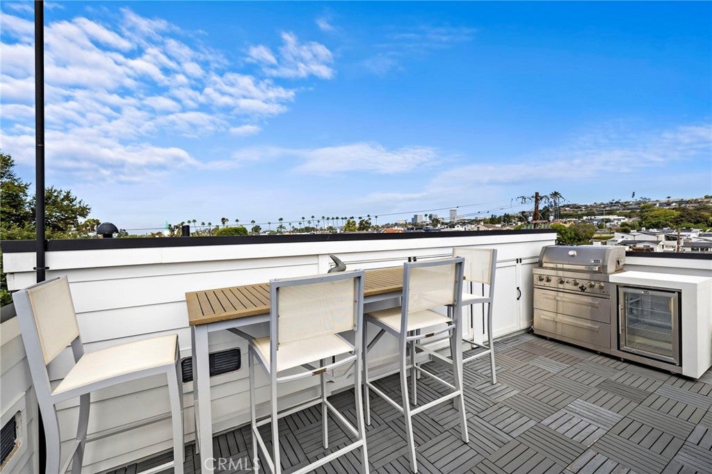 SPECTACULAR ROOFTOP SUNSETS AWAIT YOU! Located on the highest point of Jasmine in the Corona Del Mar village flower streets, 611 1/2 Jasmine is a newer construction modern farmhouse back unit that's larger than many front units. You’ll love the 700sf of bonus space that has been transformed into three separate rooms --perfect as a gym and massive closet/storage, or a theater/ family room with office and storage! An elevator transports you from the garage to the main entry level, great for groceries, luggage and easy accessibility. The airy living room is flooded with light, and centers around a stone fireplace, and opens to an outdoor terrace with sliding glass panels, effortlessly bringing the outdoors in! Luxury vinyl plank flooring throughout. A sleek kitchen with farmhouse sink, custom cabinetry and pendants makes entertaining easy with a Wolf range, custom hood, and a Sub-Zero refrigerator. The ample kitchen island provides extra seating, while a custom peninsula bar area with tons of storage, a pantry, wine refrigerator, and floating shelves make this both home functional and stylish. The primary suite includes automated shades, a spacious shower, soaking tub, Brizo fixtures and a dual vanity. The spacious bedroom suites are the epitome of style with white oak, custom built vanities, custom mirrors and top-of-the line Brizo fixtures. A finished garage, elevator, and gorgeous sunset views await you on the rooftop deck where a barbecue, built-in speaker and extra storage add to this home's tremendous appeal.