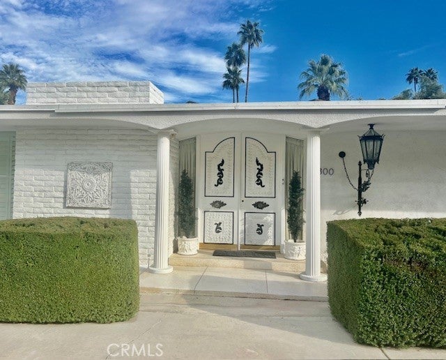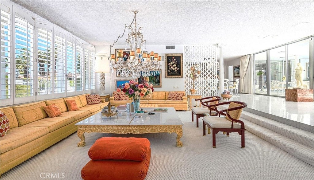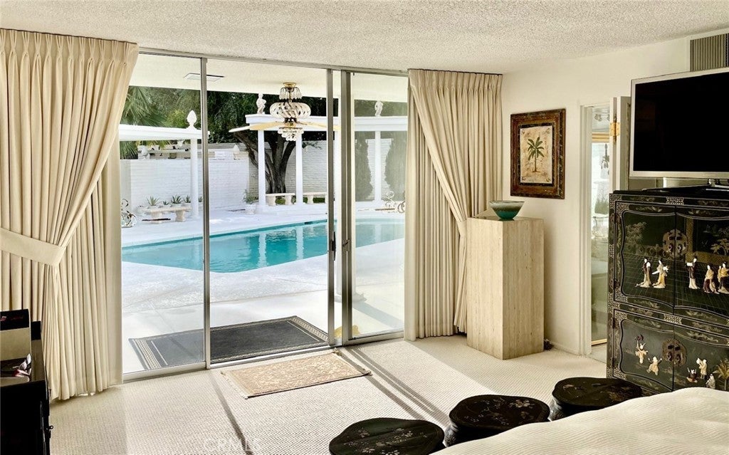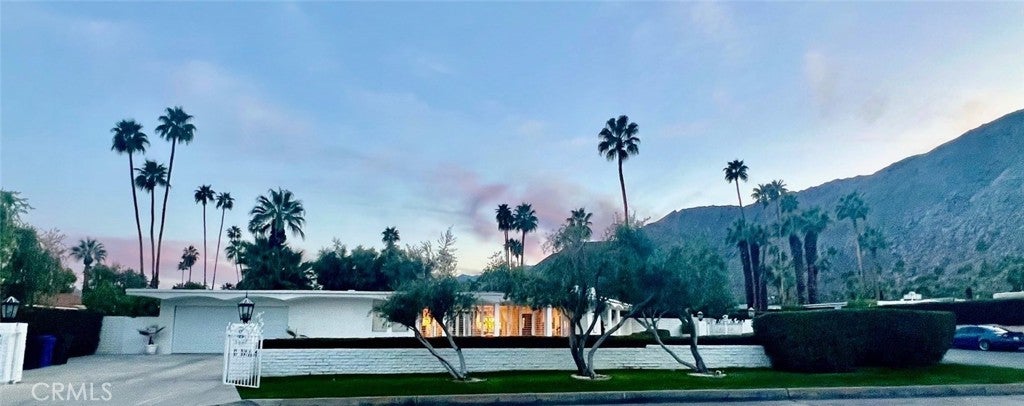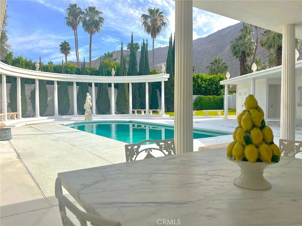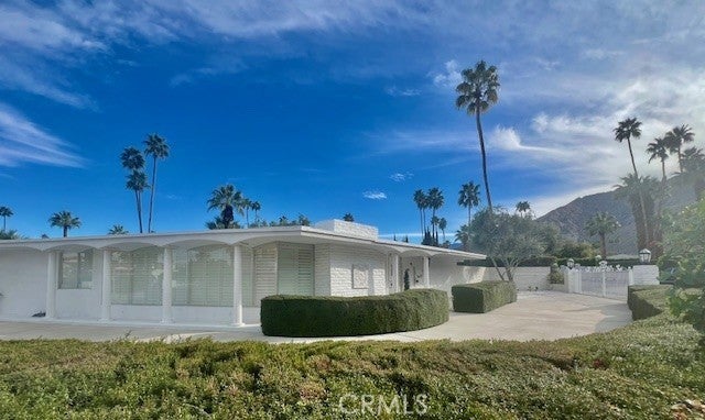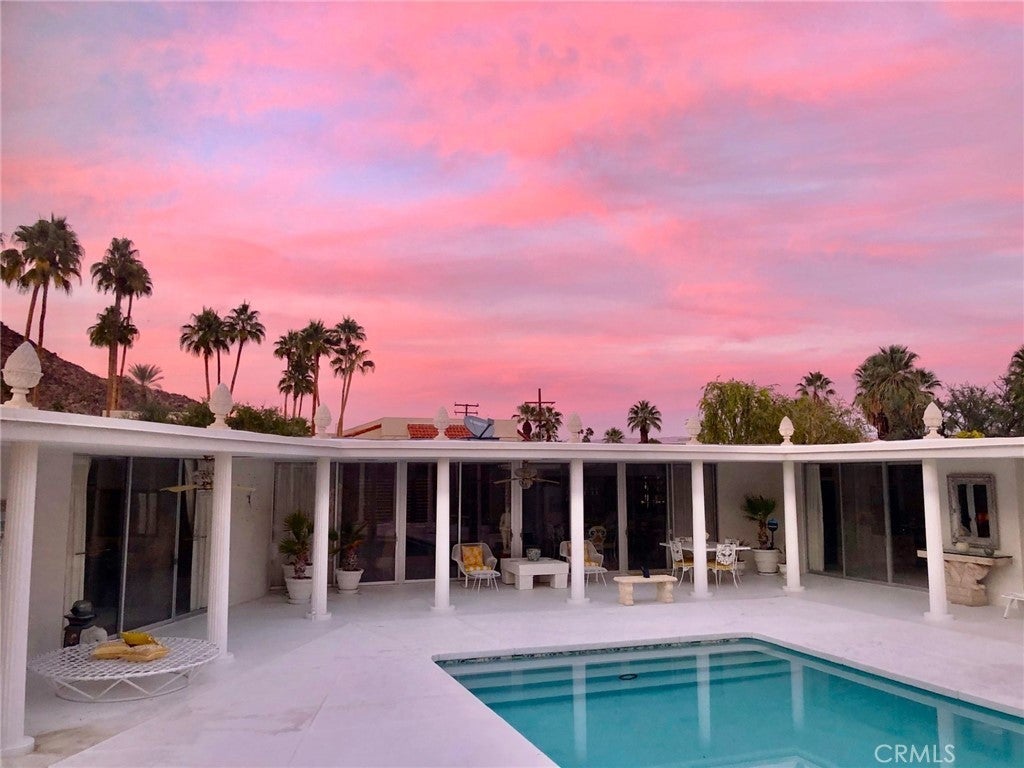 Step into a time capsule of mid-century modern perfection in the heart of Palm Springs! Designed by renowned architect John Outcalt, this 1965 gem on a 14,000 s.f. lot blends retro sophistication with seamless indoor-outdoor living. Just three blocks from downtown in the coveted Historic Tennis Club district, it offers stunning views of the San Jacinto Mountains. Beyond the double-door entry, an extra-large sunken living room welcomes you with a dramatic floor-to-ceiling marble fireplace, higher ceilings, and walls of glass. Original terrazzo flooring leads to the dining area, perfectly positioned next to a fabulous vintage wet bar. The adjacent kitchen features a walk-in pantry and a separate laundry area. Two oversized primary suites offer vintage luxury with terrazzo-clad baths, sunken tubs, and private patios. A third bedroom—ideal as a media room or guest retreat—includes twin beds, a desk area, and its own terrazzo shower/tub combo. Sliding glass doors in every bedroom open to the sun-drenched pool deck, where a sparkling pool, lounge space, and breathtaking mountain views create a dreamy retreat. Private patios, an attached two-car garage, 3 cabanas and an unbeatable location near top restaurants, the Agua Caliente spa, Palm Springs Art Museum, and the famous Thursday night street fair complete this timeless escape. Select furnishings are available for purchase to keep the vintage vibes alive. Furnishings available for purchase.