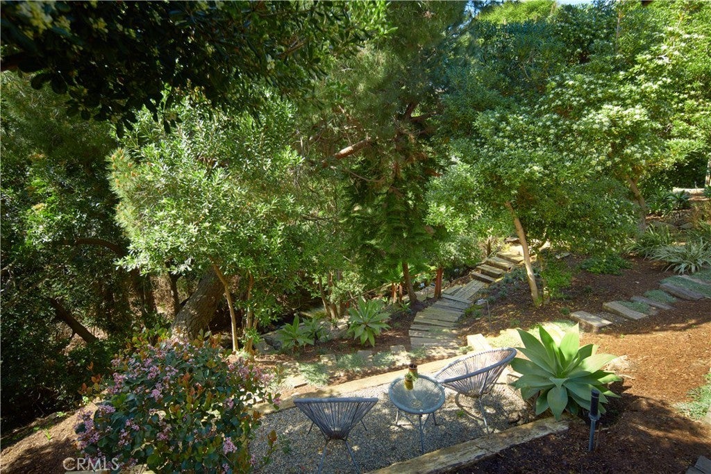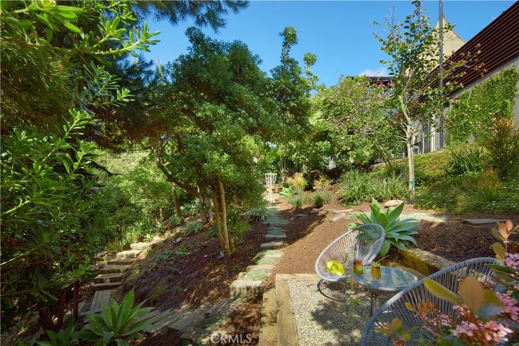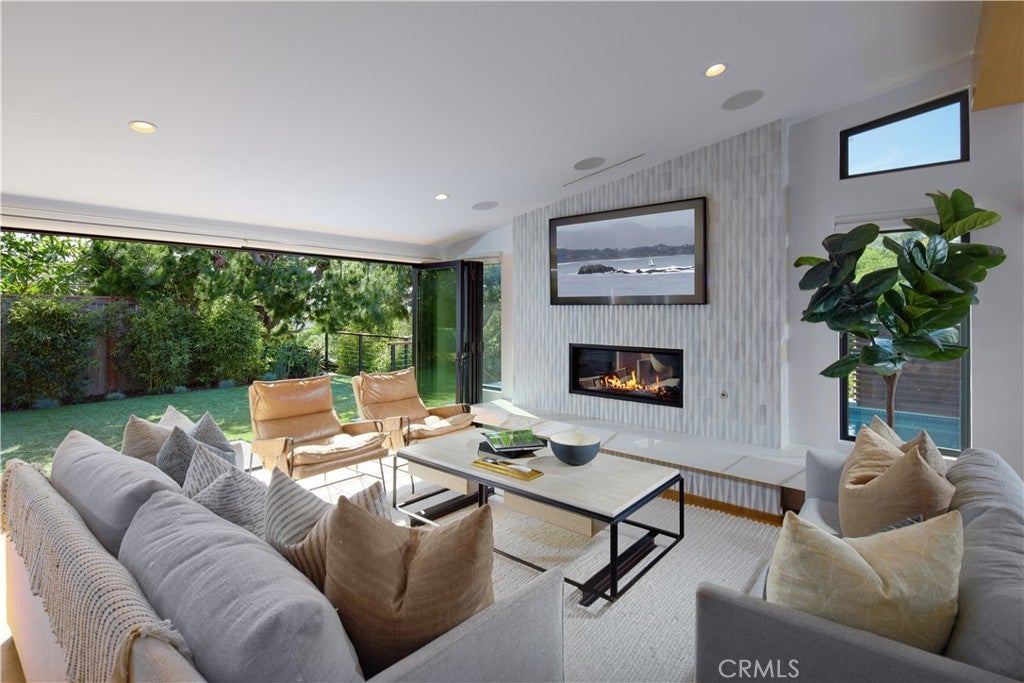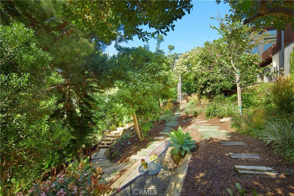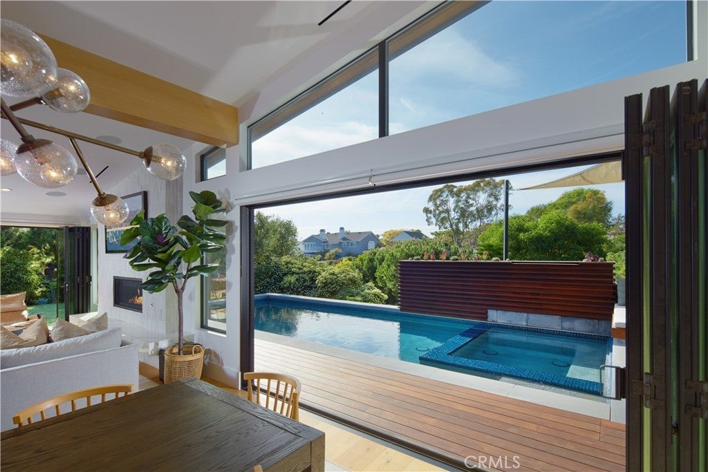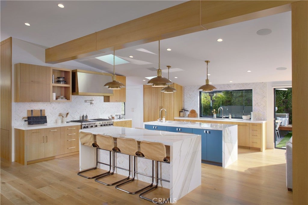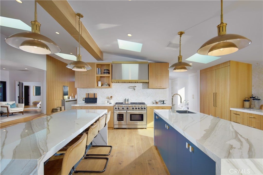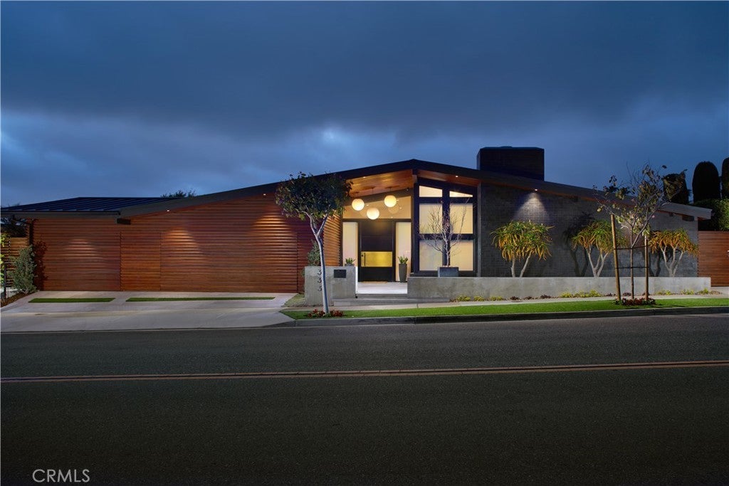 Located within the prestigious Cameo Shores enclave and featuring scenic creek and peek-a-boo ocean views, this magnificent Mid-Century Modern home maintains its original character while incorporating today’s preferred design aesthetic. Reflecting an extensive 2020 remodel designed by Lindye Galloway with Principle Design & Construction as contractor, the home is warm, inviting and an ideal match for a wide variety of lifestyles. A custom glass-framed door provides passage to the extra-open and light-filled interior, which spans approximately 3,647 square feet on one impressive level. Four en suite bedrooms and four- and one-half baths offer their own unique style while providing comfort and privacy from main living areas. Vaulted open-beam ceilings, clerestory windows, and several sets of fold-away glass doors combine to infuse the home with an indoor/outdoor flow. Main public spaces include a living room warmed by a fireplace with floor-to-ceiling surround and a floating stone hearth, while the dining room opens to the outdoors. Anchored by two islands, one for prep and another for casual dining, the stunning kitchen shines with porcelain-slab countertops, waterfall edges, custom tile backsplash, custom contemporary cabinetry, a pass-thru to the patio for easy serving, a butler’s pantry, and top-tier appliances from Sub-Zero, Wolf and Miele. On-trend design continues in the exclusive primary suite, where a book-matched stone fireplace wall, high ceiling, floor-to-ceiling windows, and a private bath with marble countertop, oversized shower and freestanding tub are on display. The casually upscale home also features wood and tile flooring, new Milgard windows and doors, designer accent tile throughout, quartz counters in secondary baths, and an attached three-car garage. High-tech systems include owned solar power, Nest thermostats, Luma security cameras, and Savant Home Automation. Terraced grounds extend almost .34 acres and reveal a pool and spa with waterfall and automatic cover, lifelike turf, and a dining patio for outstanding outdoor entertaining.