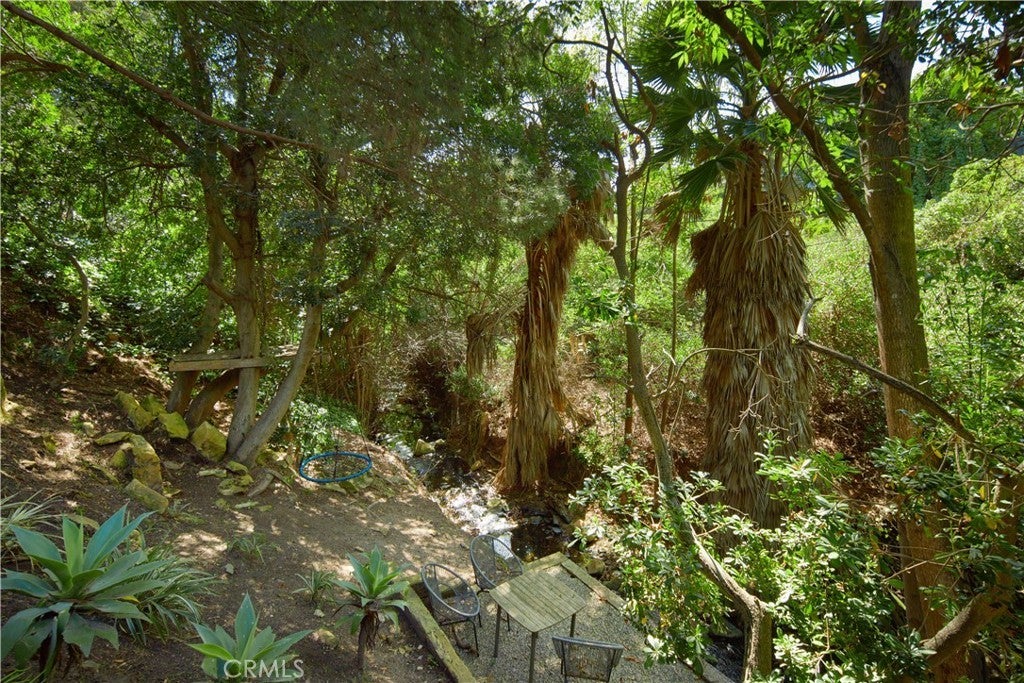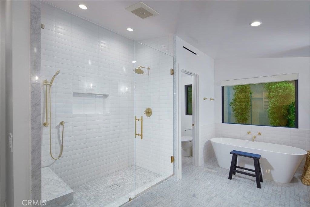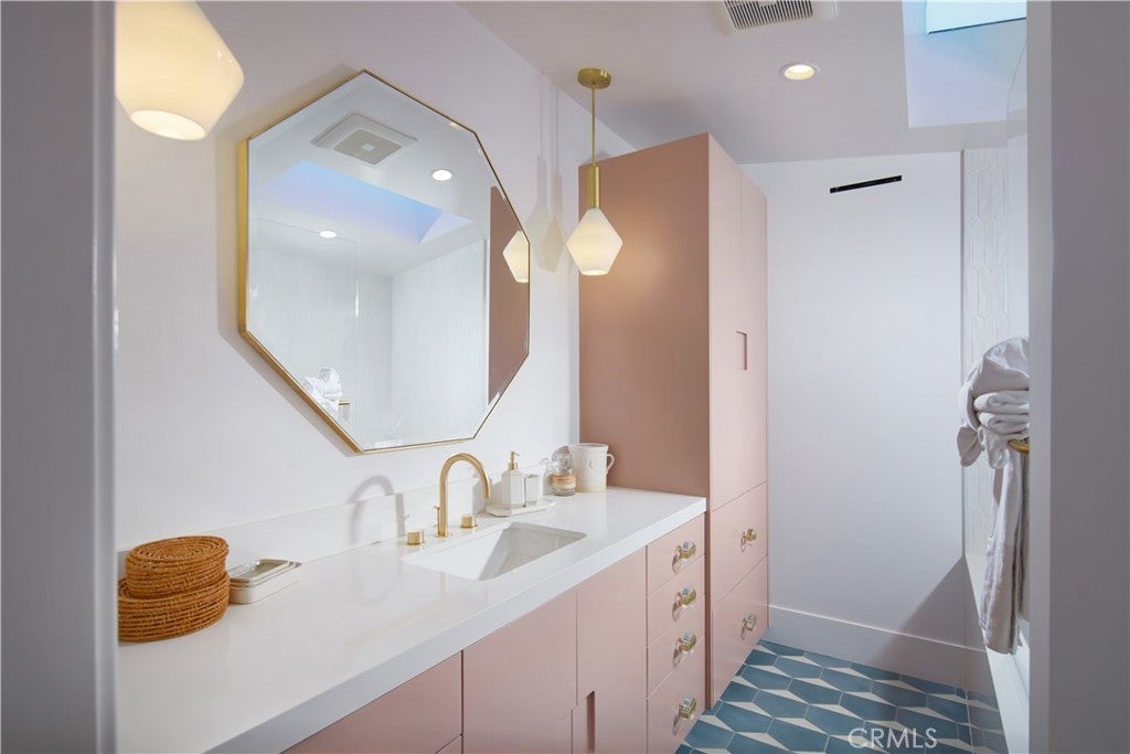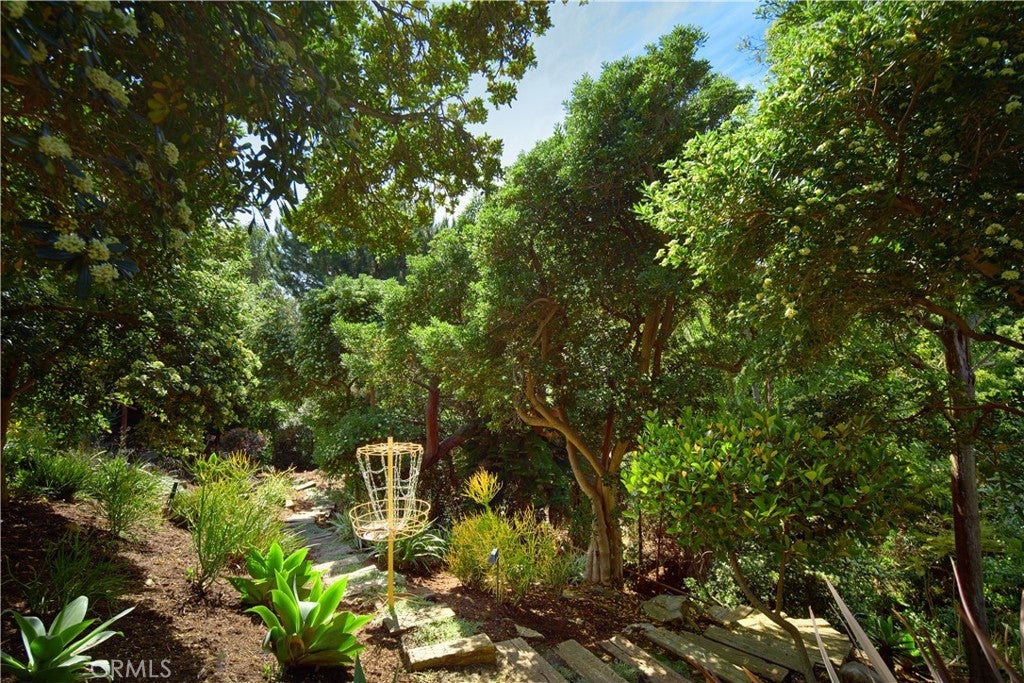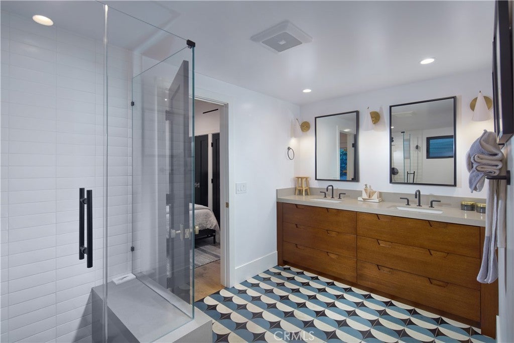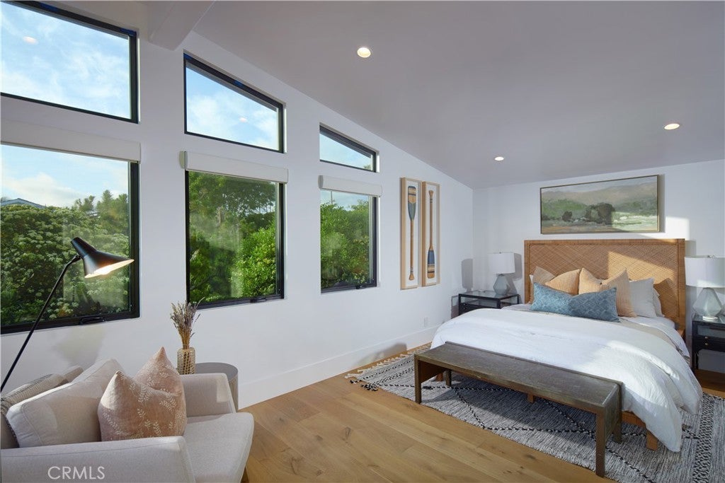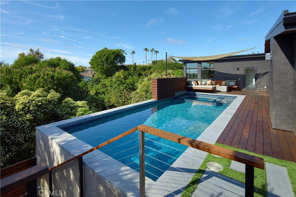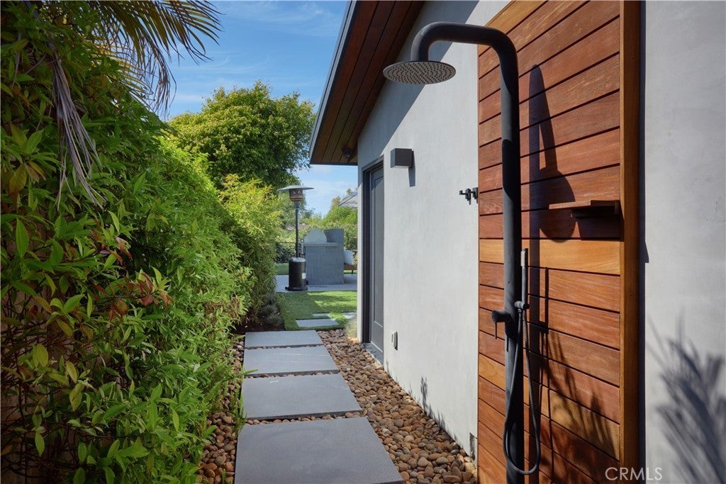 Located within the prestigious Cameo Shores enclave and featuring scenic creek and peek-a-boo ocean views, this magnificent Mid-Century Modern home maintains its original character while incorporating today’s preferred design aesthetic. Reflecting an extensive 2020 remodel designed by Lindye Galloway with Principle Design & Construction as contractor, the home is warm, inviting and an ideal match for a wide variety of lifestyles. A custom glass-framed door provides passage to the extra-open and light-filled interior, which spans approximately 3,647 square feet on one impressive level. Four en suite bedrooms and four- and one-half baths offer their own unique style while providing comfort and privacy from main living areas. Vaulted open-beam ceilings, clerestory windows, and several sets of fold-away glass doors combine to infuse the home with an indoor/outdoor flow. Main public spaces include a living room warmed by a fireplace with floor-to-ceiling surround and a floating stone hearth, while the dining room opens to the outdoors. Anchored by two islands, one for prep and another for casual dining, the stunning kitchen shines with porcelain-slab countertops, waterfall edges, custom tile backsplash, custom contemporary cabinetry, a pass-thru to the patio for easy serving, a butler’s pantry, and top-tier appliances from Sub-Zero, Wolf and Miele. On-trend design continues in the exclusive primary suite, where a book-matched stone fireplace wall, high ceiling, floor-to-ceiling windows, and a private bath with marble countertop, oversized shower and freestanding tub are on display. The casually upscale home also features wood and tile flooring, new Milgard windows and doors, designer accent tile throughout, quartz counters in secondary baths, and an attached three-car garage. High-tech systems include owned solar power, Nest thermostats, Luma security cameras, and Savant Home Automation. Terraced grounds extend almost .34 acres and reveal a pool and spa with waterfall and automatic cover, lifelike turf, and a dining patio for outstanding outdoor entertaining.
