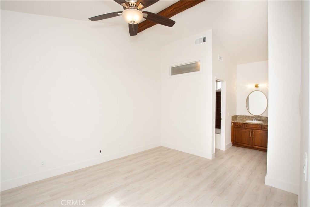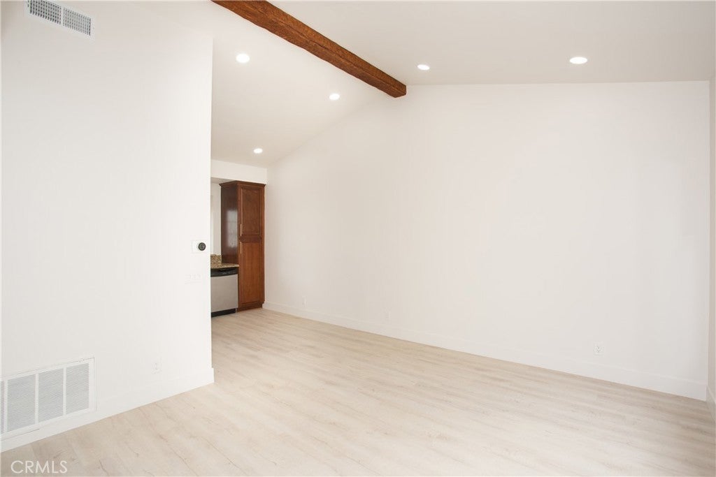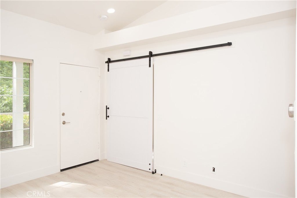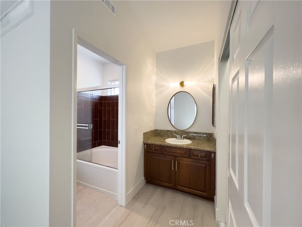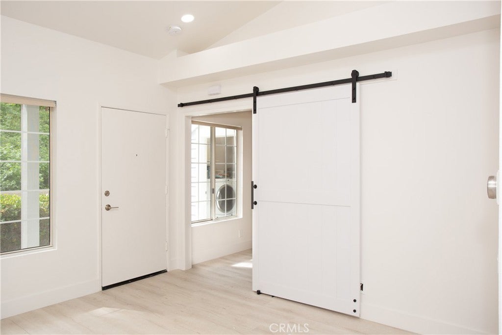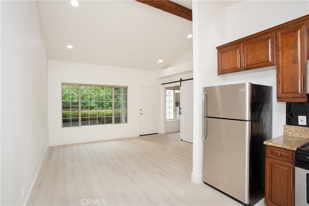 Comfort, style, and convenience unite to create the perfect sanctuary, this delightful carriage unit condo in the desirable, gated community of Canyon Villas. Ascend one flight of stairs where a private and serene patio welcomes you. Once inside, enjoy an open floorplan bathed in natural light, creating an inviting and refreshing ambiance. Adjacent to the living room, the updated kitchen features stainless steel appliances, granite countertops, and a farmhouse sink. Tucked behind a stylish barn door, is the spacious bedroom featuring an ensuite bathroom and walk-in closet, providing ample storage space. Recently remodeled with attention to detail, this unit boasts tasteful vinyl flooring throughout, recessed lighting, updated hardware, and doors. Additional features include beamed ceilings, A/C, a 1-car garage with storage space (no direct access), and a private laundry room complete with a full-size washer and dryer, conveniently located off the patio. Indulge in the luxury of Canyon Villas' exceptional amenities, which include two pools, spas, fitness center, and clubhouse for social gatherings. The 73 freeway, parks, scenic trails, and Aliso Viejo Town Center with shopping, dining, and a movie theater is just moments away.