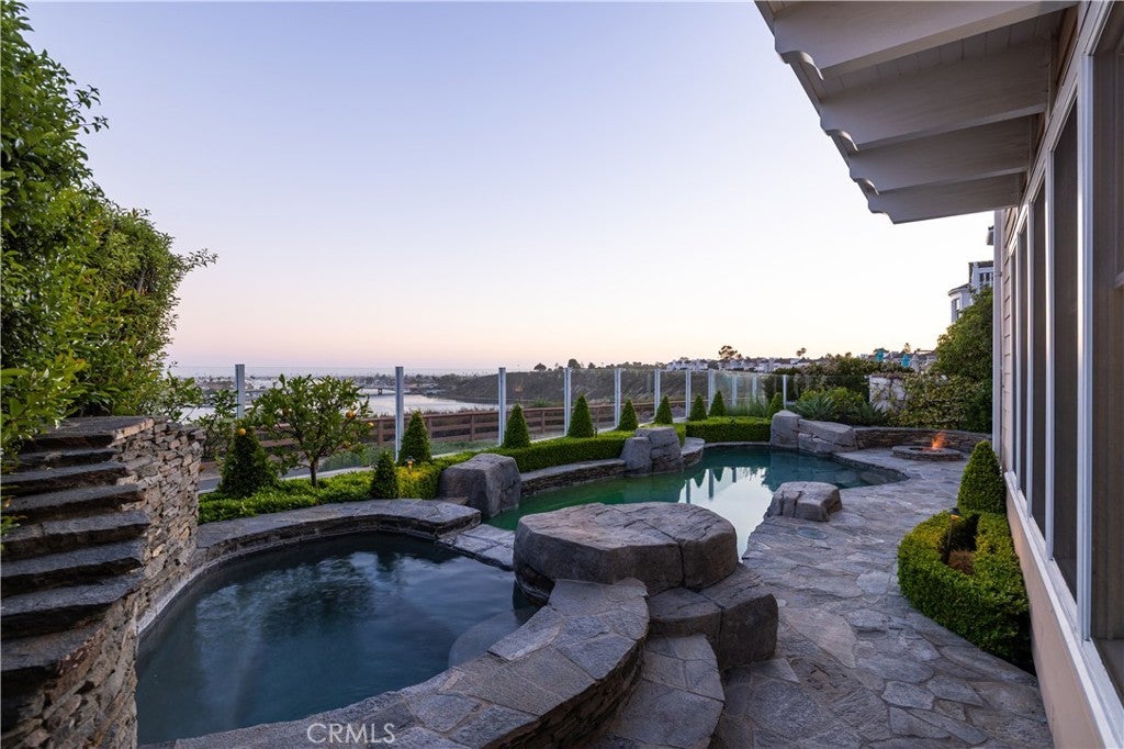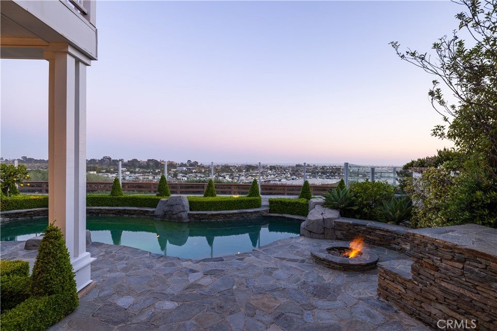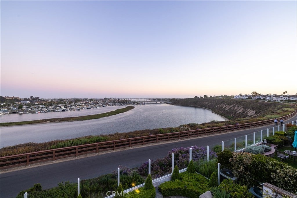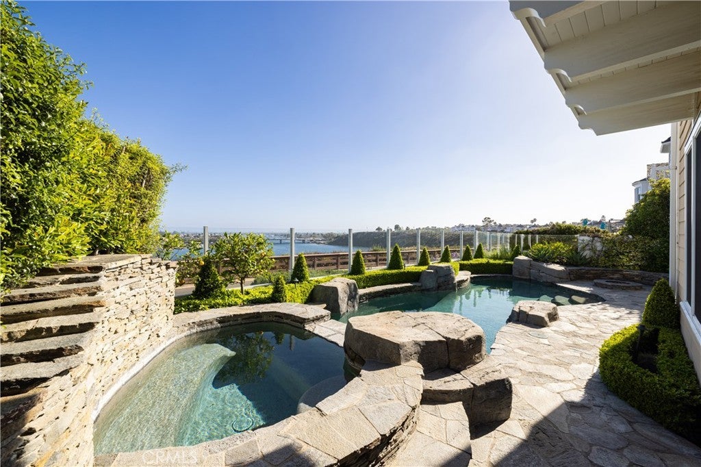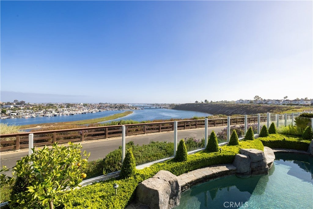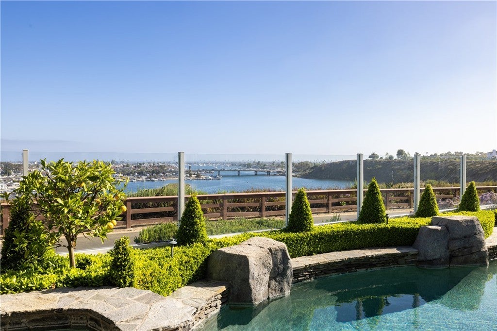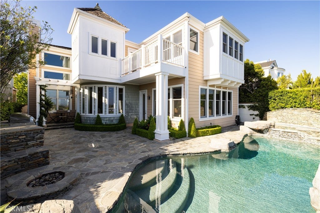Perched blufftop, front row center in the coveted guard-gated Castaways community, this stunning Cape Cod-style residence showcases breathtaking, unobstructed vistas of the harbor, bay, Pacific Ocean, Catalina Island, city lights, and back bay. Behind a timeless coastal façade, a grand two-story entry welcomes guests with soaring ceilings, a dramatic staircase, and an open-concept layout designed to frame the views at every turn. The sunlit great room flows seamlessly into the formal dining area and a chef’s kitchen outfitted with professional-grade Viking appliances, custom cabinetry, quartz countertops, a large center island with 6-burner cooktop, and a built-in breakfast nook. Designed for effortless indoor-outdoor living, the entertainer’s backyard features a PebbleTec saltwater pool, elevated spa with waterfall, firepit, built-in BBQ, and expansive stone patio—all set against a striking ocean backdrop. Upstairs, the spacious primary suite captures panoramic ocean views and offers a cozy fireplace, private view deck, and a spa-inspired bath with free-standing tub, double-headed Carrara marble shower, dual vanities, and custom walk-in closet. Two additional upstairs guest bedrooms share a jack-and-jill bath and a versatile den can easily serve as a fourth bedroom. An adjacent loft office provides the ideal work-from-home space with tasteful built-ins and captivating water views. Additional highlights include an elevator, three fireplaces, newer wide-plank oak flooring, epoxy-coated garage floors with built-in cabinetry, and a brick-accented driveway. With direct access to scenic hiking and biking trails and just minutes from world-class beaches, shopping, and dining, this home embodies the best of Newport living.