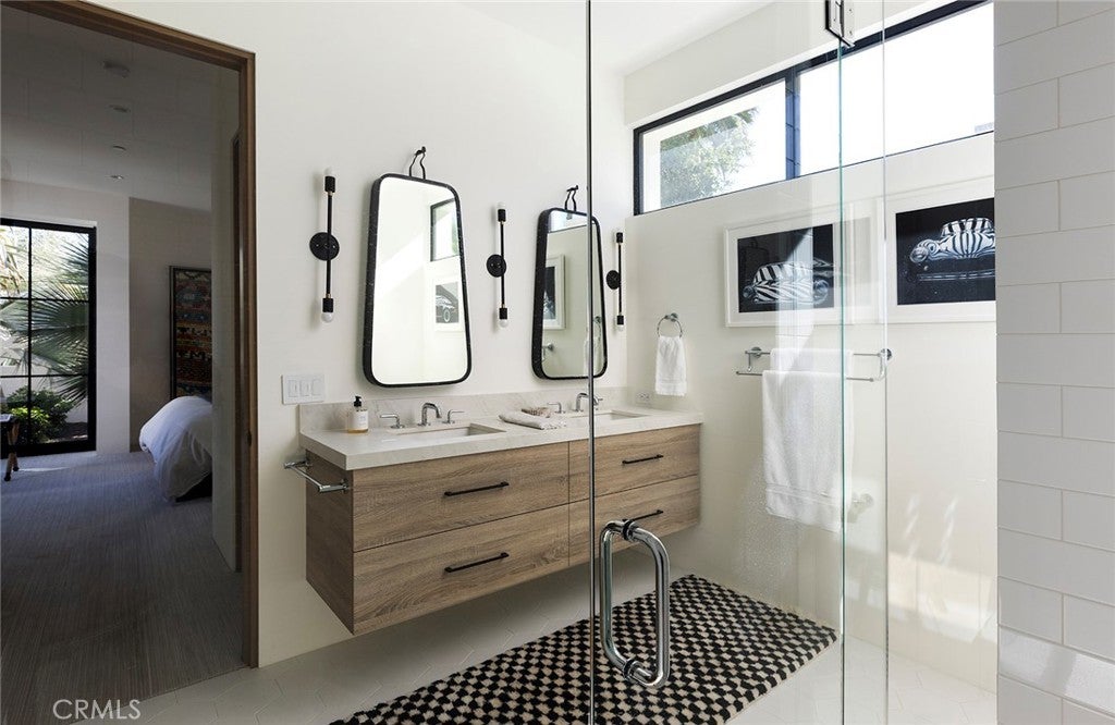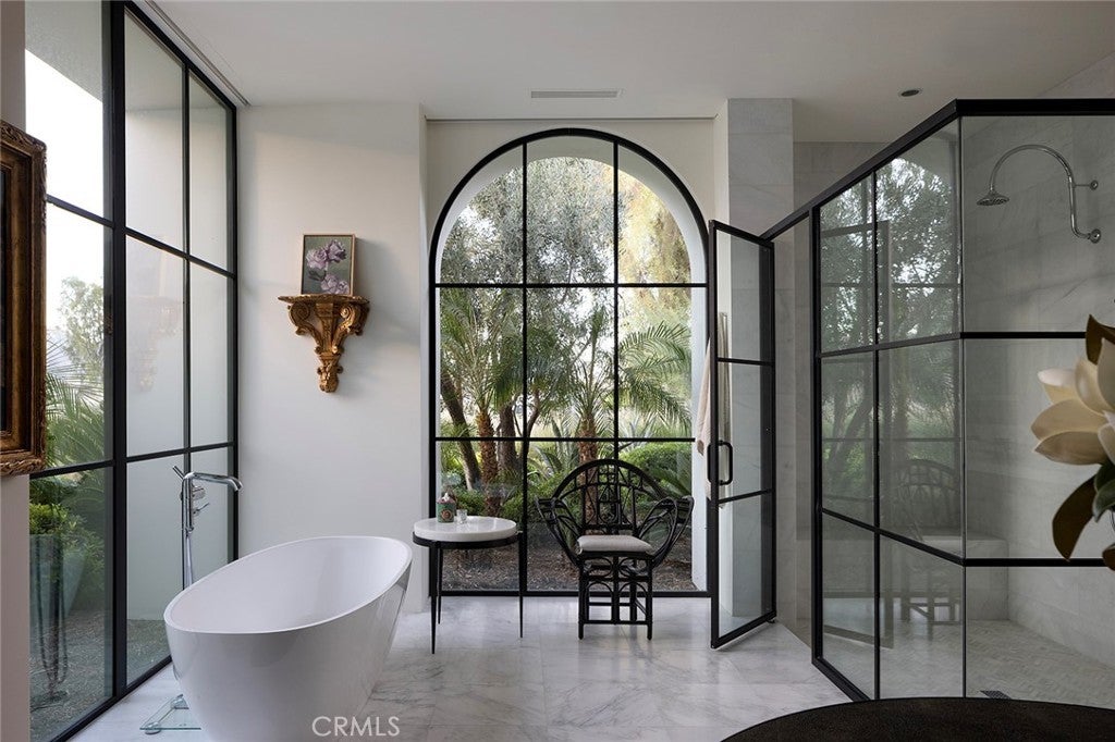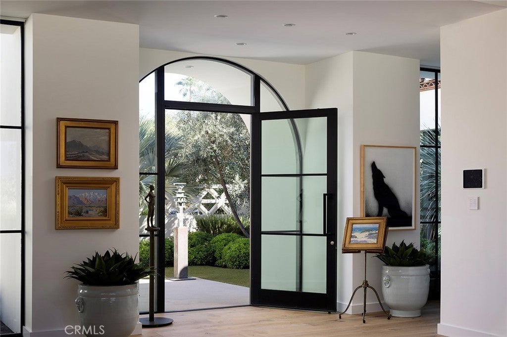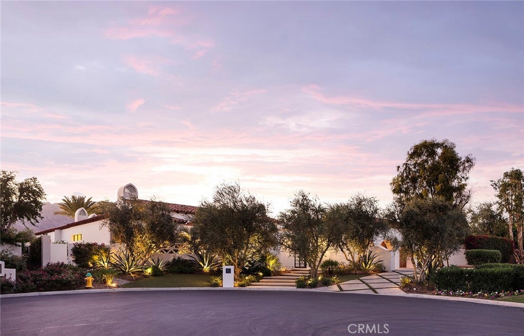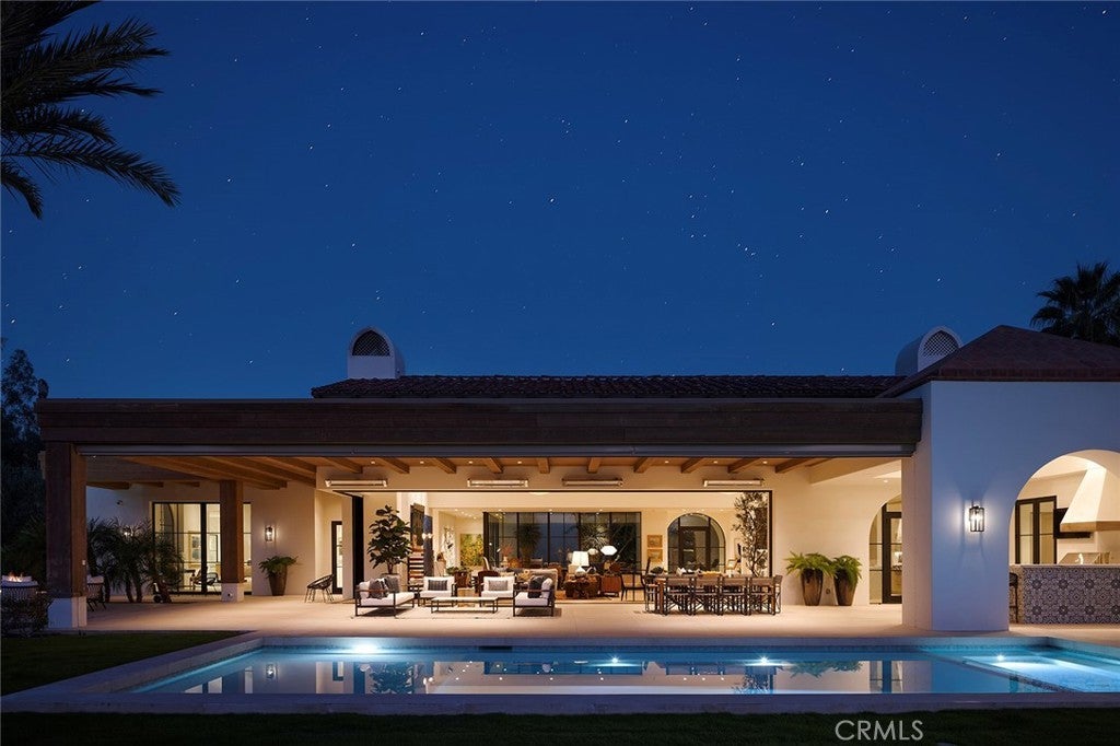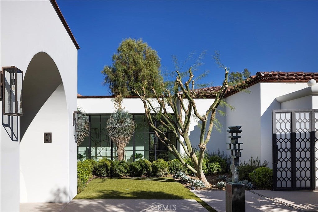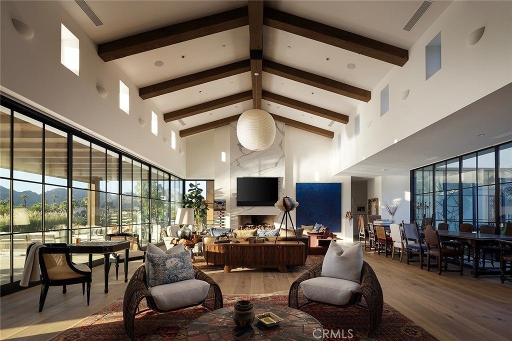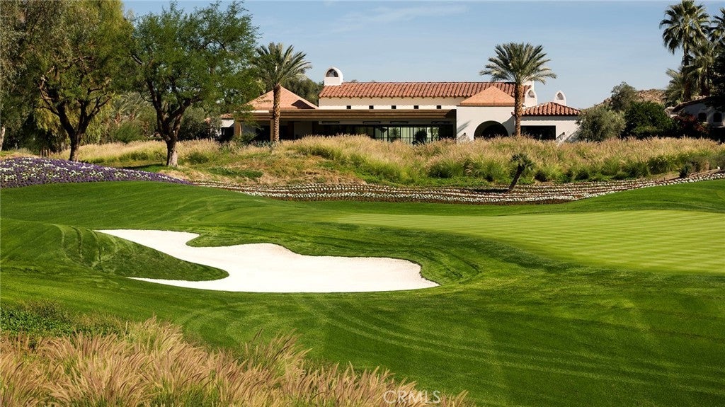 An extraordinary opportunity to own a residence of rare distinction within the prestigious Tradition Golf Club. Perfectly positioned at the end of a serene cul-de-sac, this modern hacienda commands sweeping mountain vistas from its expansive and exceptionally private homesite. Designed by acclaimed architect Gordon Stein, this architectural gem harmonizes bold modern lines with warm, organic materials to create a timeless desert sanctuary. Dramatic glass walls and cathedral beam ceilings frame captivating views and bathe the interiors in natural light. Automated sliding doors blur the boundaries between indoors and out, opening to a covered patio complete with a full outdoor bar, built-in grill, fire pit, and an upgraded surround sound system - perfect for elegant entertaining or tranquil evenings beneath the desert sky. The resort-style pool and large grass area overlook holes four and five of Tradition's golf course. Throughout the home, wide-plank oak floors, contemporary designer lighting, and refined natural textures establish a sense of understated luxury and cohesion. The chef’s kitchen features a porcelain waterfall island, bespoke cabinetry, and top-of-the-line appliances. Adjacent to the great room, an office alcove and exquisitely designed powder room reflect the home’s meticulous attention to detail. The primary suite serves as a serene retreat, with floor-to-ceiling windows and pocket doors that dissolve the boundary between comfort and scenery. The spa-inspired bath exudes tranquility with curated finishes, while a motorized TV lift allows seamless transitions between cinematic viewing and unobstructed mountain panoramas. Two guest suites in the main residence offer stylish accommodations, while a detached casita - complete with a private living area, kitchenette, and ensuite bedroom - welcomes visitors with the utmost privacy and comfort. Enhanced by a state-of-the-art smart home system, this 2020-built residence is both technologically advanced and effortlessly livable. Distinguished among the community’s finest homes, this property epitomizes modern desert elegance - a flawless fusion of architecture and sophistication within one of La Quinta's most coveted enclaves. This is more than a home; it’s an opportunity to live the Tradition Golf Club lifestyle, where world-class golf, stunning natural beauty, and architectural excellence converge.