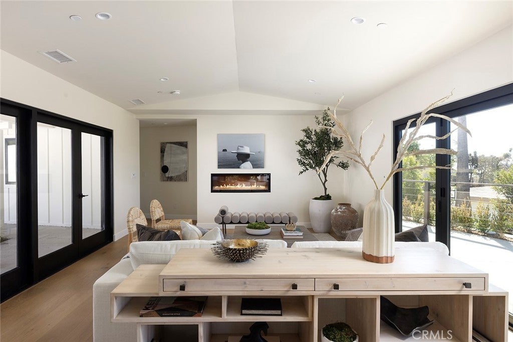 Perched on an approximately quarter-acre lot, this stunning 4-bedroom, 3.5-bathroom San Clemente home has been completely reimagined from the studs up, offering a seamless blend of coastal warmth and modern luxury throughout its approximately 2,978 sq. ft. of living space. Thoughtfully designed by Kaizon Interiors, every element has been curated to create an inviting yet sophisticated retreat. Upon entry, the large open-concept layout unfolds, revealing a spacious living room with a cozy fireplace, a dedicated dining area, and an elegantly designed kitchen, all flowing together effortlessly. Rich wide plank hardwood floors and high-end black accent hardware add warmth and contrast throughout the space. The kitchen is beautifully appointed with all-new Thermador appliances, quartz countertops, a stylish tile backsplash, pendant lighting, and a breakfast counter, balancing both form and function. The primary suite is a true sanctuary, featuring an ensuite bath with dual sinks, quartz countertops, a walk-in shower, and a freestanding soaking tub, as well as a custom-built dual closets for elevated organization. Three additional bedrooms provide flexibility, including one with a private entrance and ensuite bathroom, making it ideal for multi-generational living, an ADU, or a guest suite. Designed to embrace the indoor-outdoor lifestyle, the home’s horseshoe-shaped layout wraps around a central courtyard, creating a private and tranquil open-air retreat. Multiple access points seamlessly connect the home to this lushly landscaped space, where a cozy firepit provides the perfect gathering spot for relaxing under the stars. Beyond the courtyard, the backyard opens to stunning ocean views, offering a breathtaking backdrop to this exceptional coastal home. Positioned below street level for enhanced privacy, this home offers a rare combination of seclusion, architectural innovation, and luxury coastal living in the heart of San Clemente.