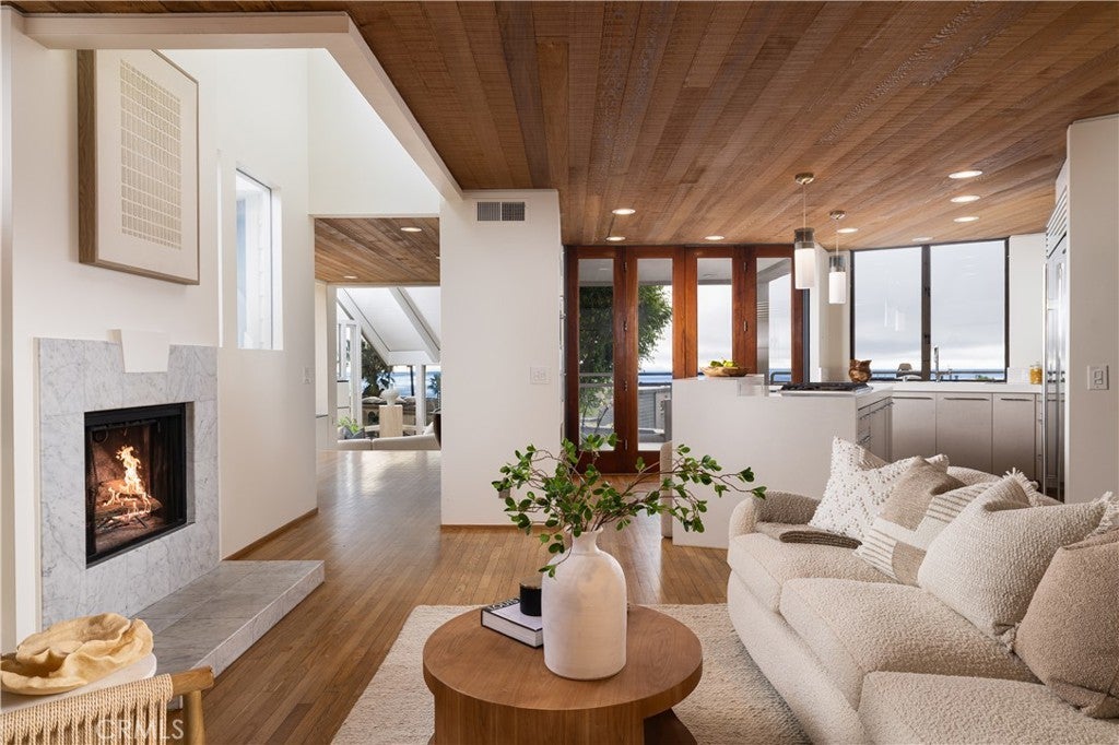 Modern Coastal Sanctuary with Ocean Views. Perched above the shimmering shoreline of Victoria Beach, this stunning Laguna Beach residence offers the perfect blend of contemporary design, comfort, and serenity. Nestled in the coveted Portafina neighborhood, this residence provides beautiful views of the Pacific, Catalina Island, and vibrant evening sunsets. Originally crafted by architect Timothy Wilkers, a student of the celebrated Chris Abel, this home reflects timeless California modernism, where glass, light, and natural materials come together in perfect balance. Enter through an inviting courtyard and walk into revealing sunlit interiors framed by walls of glass and high, airy ceilings. Open concept floor-plan from the designer kitchen to the dining and living areas. The gourmet kitchen features premium appliances, sleek cabinetry, and an oversized island ideal for gatherings. Step outside onto the expansive deck to take in the salty breeze and panoramic ocean backdrop. A guest suite with private courtyard access and a relaxing family room with fireplace, create flexible spaces for everyday living and unwinding. Upstairs, the primary suite captures the home’s full sense of tranquility, with skylights, a private ocean-view balcony, a spacious walk-in closet, and a spa-inspired bathroom with dual vanities. Two additional bedrooms share a beautifully updated bath, completing the upper level. Just moments from Laguna’s best beaches, scenic hiking trails, and the shops and restaurants of downtown, this property offers an exceptional coastal lifestyle, where modern design meets the relaxed rhythm of beachside living.