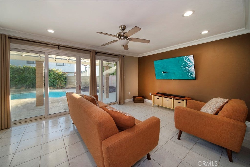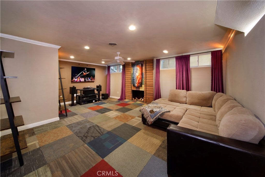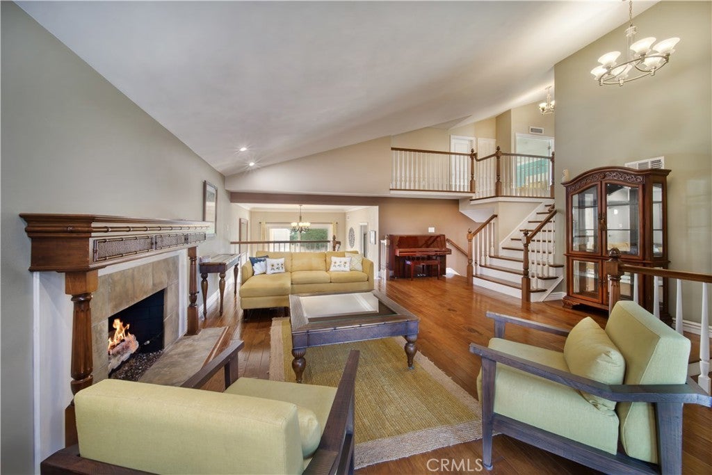 SOUTH HUNTINGTON BEACH - With generous proportions, four spacious bedrooms and large, beautifully maintained grounds, this stylishly upgraded home offers room to grow in the heart of Huntington Beach. Located near the end of a quiet cul-de-sac street, the open split-level design extends approximately 2,780 square feet and showcases a double-door entrance, vaulted ceilings, large windows and a dramatic multi-tiered staircase. Impressive entertaining is easy in a living room with custom fireplace and a formal dining room with crown molding and direct access to the backyard. Sliding-glass doors open the family room to the backyard as well, and the adjacent kitchen is embellished with granite countertops, stainless steel appliances, white cabinetry and a peninsula-style breakfast bar. As an added bonus, this inviting residence offers an extra-rare, fully finished basement complete with a fireplace. Two- and one-half baths are updated with today’s popular finishes and fixtures, and the primary suite hosts a vaulted and beamed ceiling, handsome accent wall, French doors opening to an expansive balcony, a walk-in closet with custom built-ins, and an en suite bath with tiled shower and two sinks. Custom recessed lighting illuminates living spaces that are enhanced with wood and tile flooring, crown molding, a soothing color palette, ceiling fans and elegant lighting fixtures. Grounds span approximately 5,459 square feet and include a private backyard with pool. Perry Elementary School is just steps from home, and shopping centers, beautiful city parks, miles of sandy beaches, Huntington Beach’s famous pier, and the vibrant Pacific City are just minutes away.