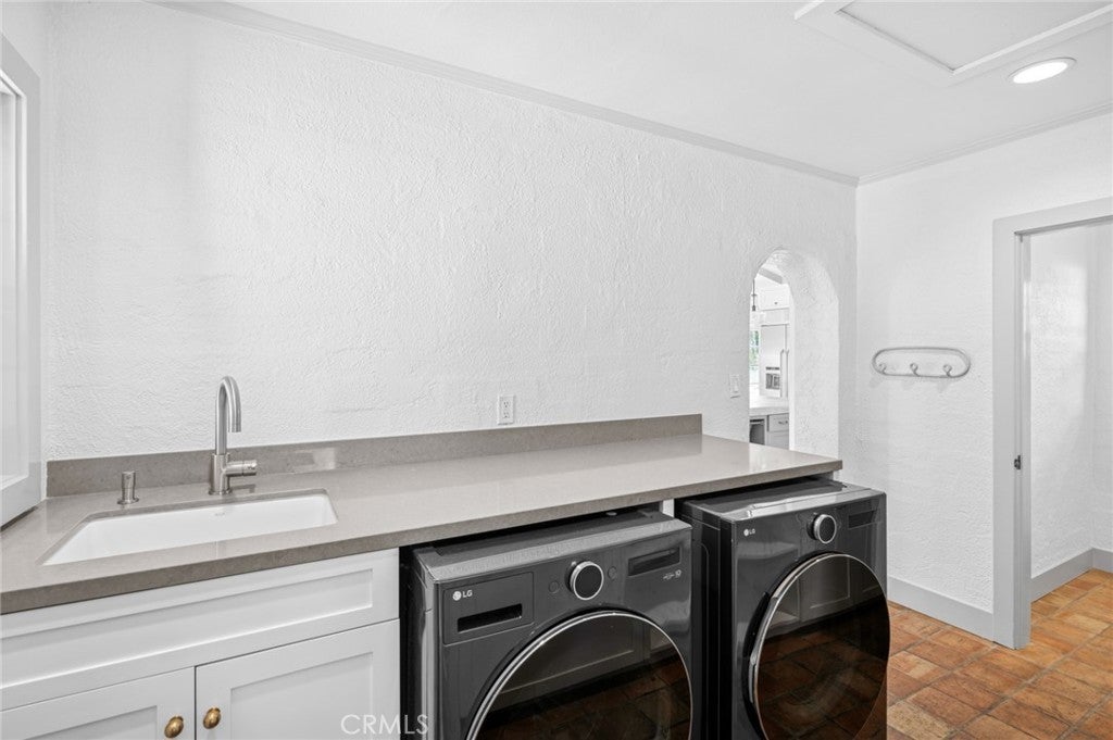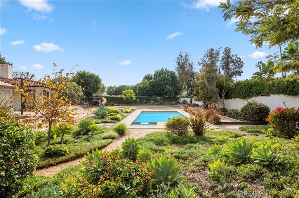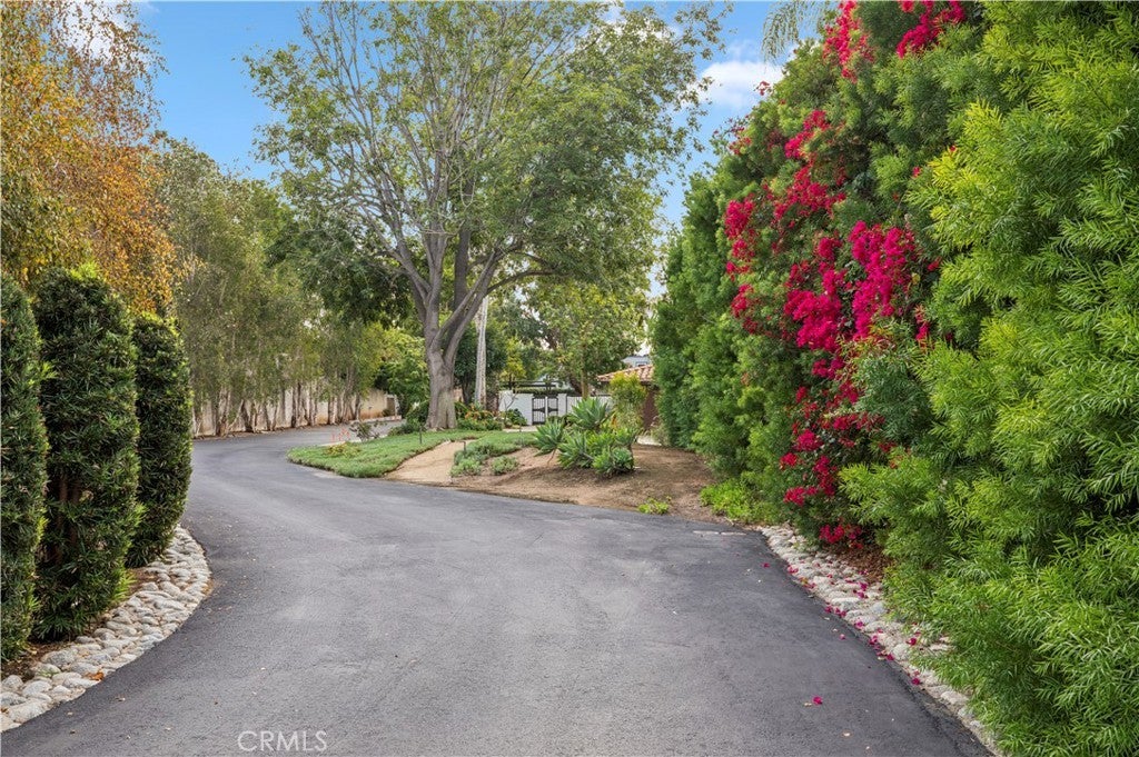 This extraordinary single-level, Santa Barbara–inspired estate is perfectly poised on a fully usable, one-acre lot in the heart of North Tustin with an increasingly rare offering of space, privacy, and timeless architectural beauty. Set on a private road, a serene walking path leads you to a gated courtyard entry, immediately signaling the tranquility, charm, and indoor/outdoor living that define this exceptional residence. Inside, the foyer unfolds into a warm yet sophisticated family room, where a wood-burning fireplace, exposed beam ceilings, and dual sets of French doors seamlessly connect the home to its expansive backyard. A spectacular remodeled kitchen is an exquisite culinary haven appointed with marble countertops, a farmhouse sink, breakfast bar, wet bar, and dramatic vaulted, beamed ceiling. A full suite of premium appliances includes a Dacor refrigerator and gas cooktop, Bosch dishwasher, Miele oven and convection microwave, and a beverage refrigerator, providing the ultimate experience for cooking, entertaining, and gathering. French doors open the kitchen to the front courtyard, while the adjoining living room, with its gas fireplace and additional backyard access, creates an effortless flow for everyday living and celebrations. The thoughtful single-level layout includes a dedicated left wing with four gracious bedrooms and two bathrooms. On the opposite end of the home, a private ensuite bedroom is complete with a shower-over-tub, walk-in closet, nearby laundry room, and powder room, and provides a flexible retreat for guests, an office, or multigenerational living. Elevated design details are showcased throughout, including plaster walls, white oak and Spanish tile flooring, and cordless window coverings. Outdoors, the magic continues on a raised Spanish-tile terrace overlooking the expansive entertainer’s yard, with a sparkling pool and spa, bocce ball court, meandering walking paths, planter beds, a generous grassy lawn, and lush mature landscaping. A two-car garage with additional storage further enhances the property’s functionality.