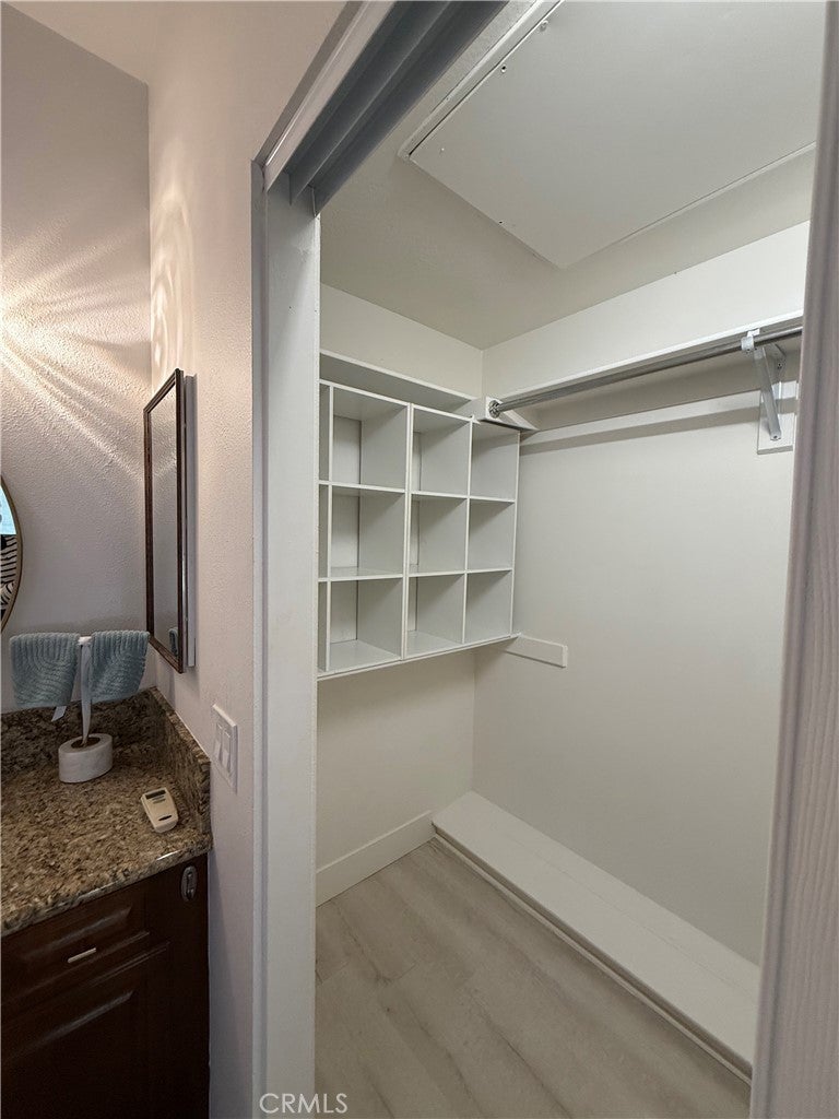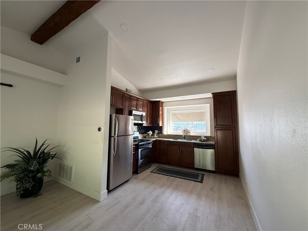 Discover the perfect blend of comfort, style, and effortless living in this charming carriage-unit condo, tucked inside the highly sought-after gated community of Canyon Villas. As you head up a single flight of stairs, you’re greeted by a private, serene patio—your own peaceful retreat before stepping inside. Bright, airy, and beautifully refreshed, the open-concept living space is flooded with natural light, setting the tone for a warm and welcoming ambiance. The updated kitchen shines with stainless steel appliances, granite countertops, a farmhouse sink, and seamless connection to the living room—ideal for both everyday living and easy entertaining. Behind a chic sliding barn door awaits the spacious bedroom, complete with an ensuite bath and a generous walk-in closet. Thoughtful upgrades elevate the entire home, including luxury vinyl flooring, recessed lighting, modern hardware, updated doors, and stunning beamed ceilings that add character and charm. Enjoy the convenience of A/C, your own private laundry room with full-size washer and dryer (located just off the patio), and a 1-car garage offering additional storage. Canyon Villas delivers resort-style amenities, featuring two sparkling pools, relaxing spas, a fitness center, and a clubhouse perfect for gatherings. And with the 73 freeway, scenic parks and trails, and the vibrant Aliso Viejo Town Center—with shops, dining, and a movie theater—just minutes away, this location truly has it all. Welcome to a home where every detail is designed for easy, elevated living.
