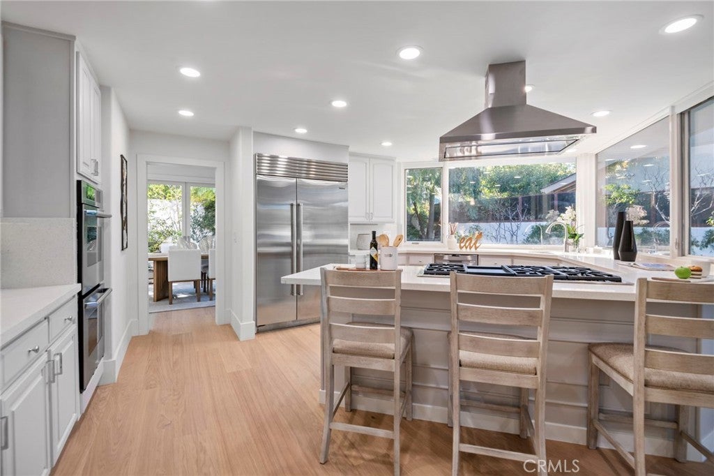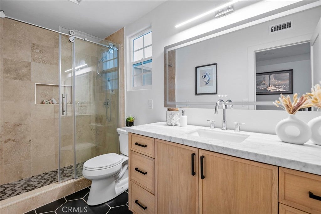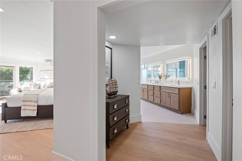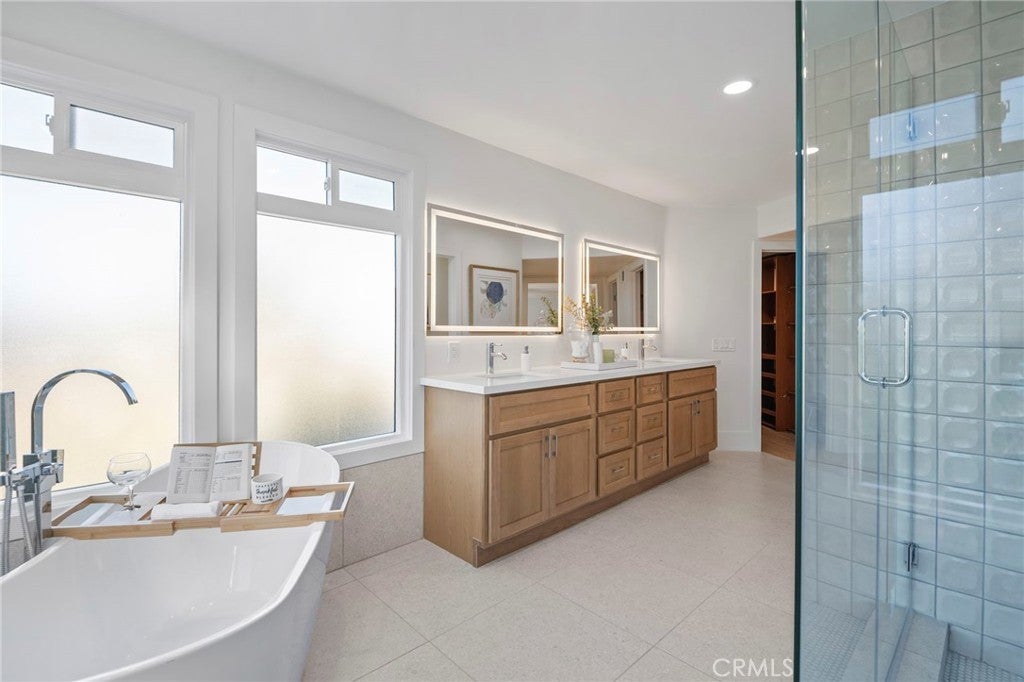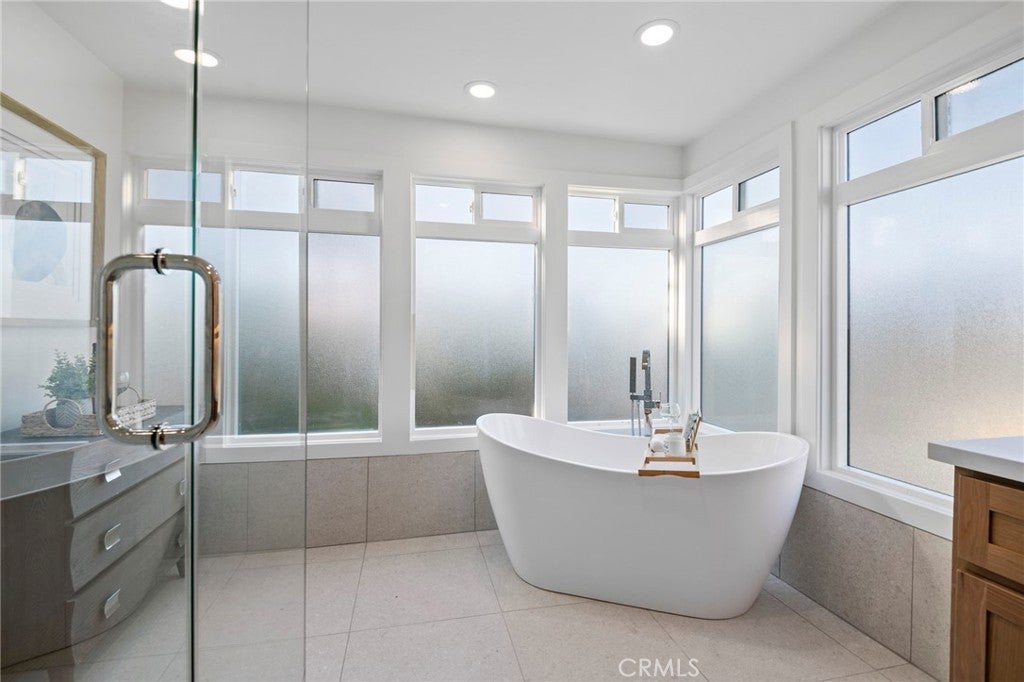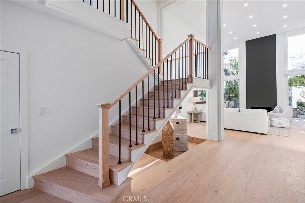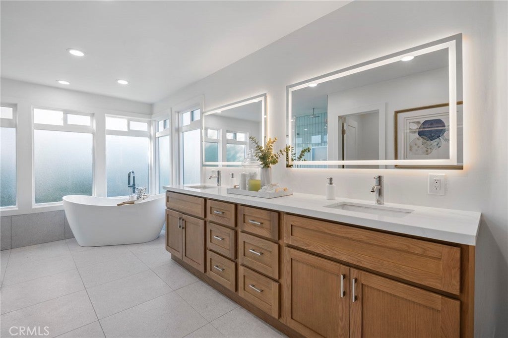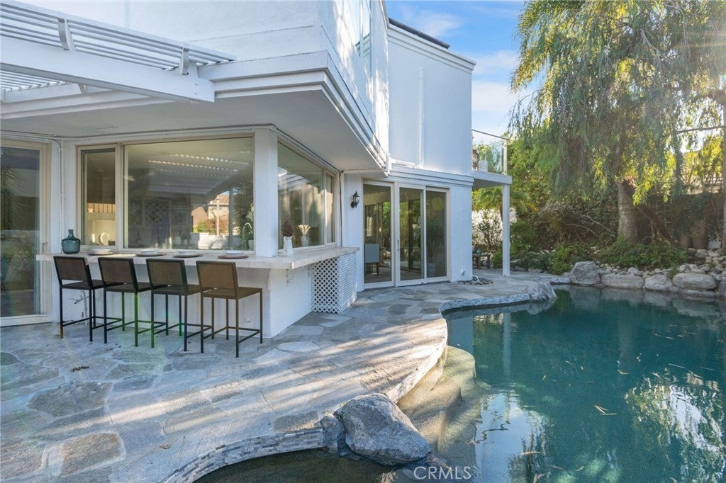 Now featuring a stunning twilight poolside view. Situated within the prestigious guard-gated community of Big Canyon, this expansive Deauville floor plan has been thoughtfully upgraded throughout, blending timeless elegance with modern luxury. Vaulted ceilings and refined crown molding enhance the home’s open and airy feel, while abundant natural light highlights the extensive use of premium finishes. The interior features Bjelin Misty Oak flooring complemented by white French oak stair railings, creating a warm and cohesive aesthetic. A beautifully remodeled kitchen showcases elegant granite countertops in a light, neutral palette, stainless steel appliances, and opens seamlessly to the family room and formal dining area—ideal for both everyday living and entertaining. Expansive sliding doors create effortless indoor-outdoor flow, opening to a private and tranquil rear yard complete with al fresco dining space, a pool and spa, and a brand-new pool heater and lighting system. All bathrooms have been fully renovated, featuring terrazzo tile flooring, Calacatta Carrara marble countertops, new vanities, modern lighting, and backlit LED mirrors. The primary suite offers a peaceful retreat with a private patio and a spa-inspired bathroom with soaking tub and custom marble finishes. Additional upgrades include new PEX plumbing throughout, skim-coated walls, fresh interior paint, solid-core shaker-style doors, new casings and baseboards, reclaimed wood shelving at the redesigned bar, and an interior laundry room. The home is further enhanced by a fully paid-off solar energy system with full battery storage, allowing for exceptional energy efficiency and the ability to operate seamlessly during power outages or independently from the grid if desired. The direct-access three-car garage is finished with epoxy flooring and includes two EV charging stations, one Tesla Level 2 charger and one universal charger, both fully owned. Ideally located just minutes from Fashion Island’s premier shopping, dining, and entertainment, this exceptional residence offers the perfect blend of privacy, luxury, sustainability, and convenience in one of Newport Beach’s most sought-after communities.