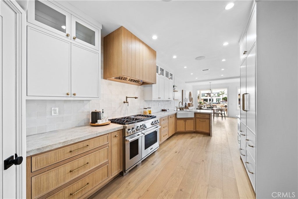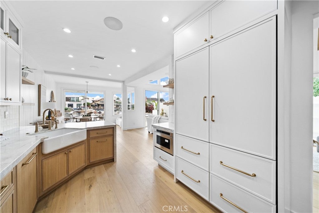 Experience elegant coastal living in the heart of Huntington Beach's prestigious Seagate community at 16214 Bimini Lane. This beautifully updated home, completed in 2025, offers 5 spacious bedrooms and 3 luxurious bathrooms, thoughtfully designed with two bedrooms on the main floor and a serene master suite upstairs. Step inside to discover engineered hardwood floors and custom white oak and painted micro shaker cabinetry. The gourmet kitchen is a chef’s delight with Taj Mahal countertops, a 6-burner stove, Bosch panel-ready dishwasher, and a stunning cast iron farmhouse sink with a Brizo faucet. The laundry room boasts exquisite Taja Perla porcelain countertops, while the bathrooms showcase Bedrosians honed marble floors, shower walls, backsplashes, and elegant tile work extending to the BBQ and jacuzzi areas. Cozy up by the custom Arto brick fireplace in the great room, equipped with a Samsung 85” Smart TV and Apple TV for the ultimate entertainment experience. Step outside to your private jacuzzi and enjoy exclusive access to two community pools and two beautifully appointed clubhouses. For water enthusiasts, the property features a 30-foot boat dock with additional space for kayaks, with seamless access to the harbor and ocean beyond. This home is truly the crown jewel of Seagate—where modern luxury meets coastal charm. Don’t miss the opportunity to own the most stunning residence in this sought-after waterfront enclave. Seagate residents enjoy unmatched amenities including tennis courts, community pools, clubhouses, and direct harbor access, perfect for an active, resort-style lifestyle just minutes from the beach and vibrant Huntington Beach dining and shops. 16214 Bimini Lane is more than a home—it’s your personal coastal retreat.