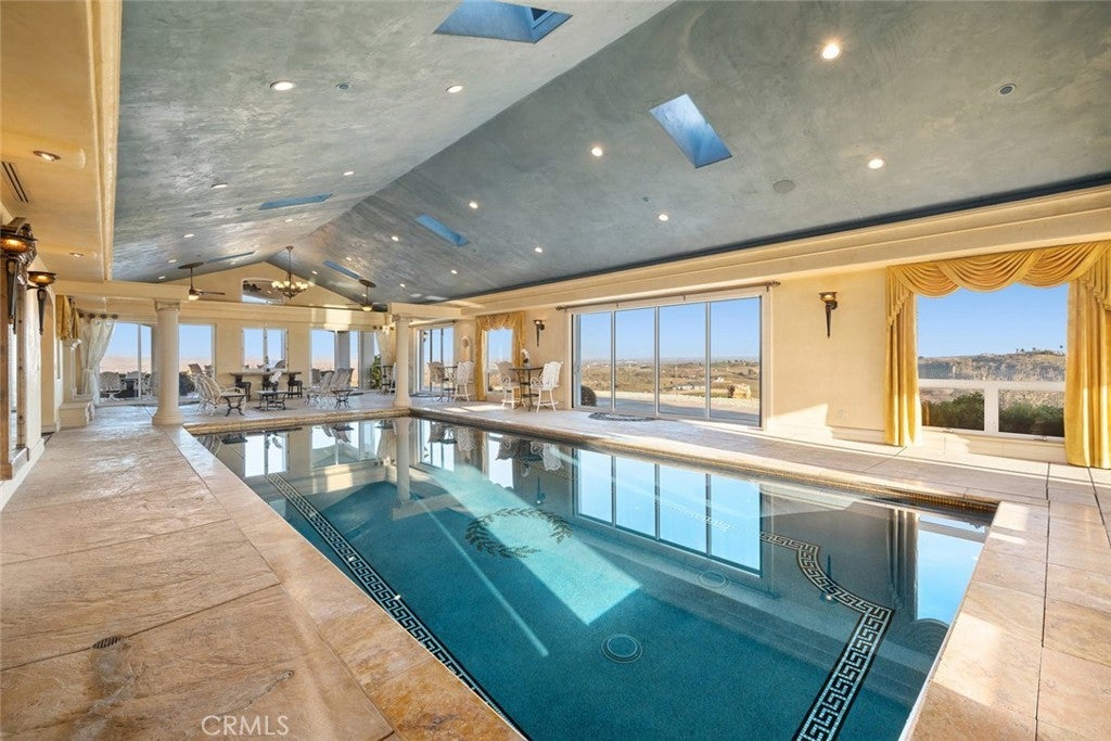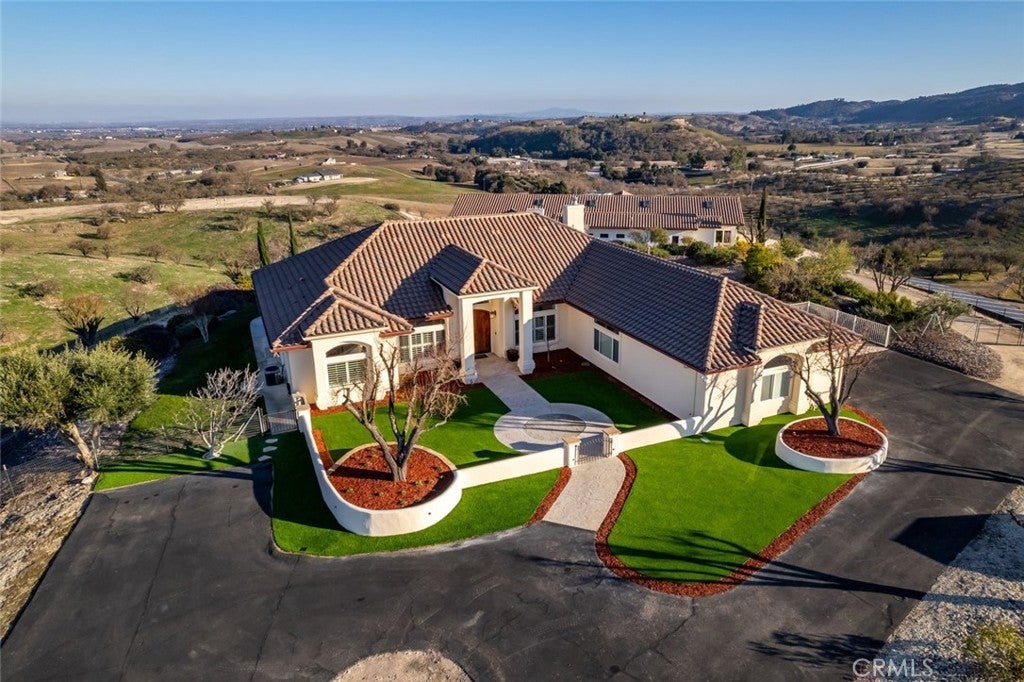 This extraordinary westside legacy estate, just 10 minutes from charming Paso Robles, spans 83 acres of pristine countryside, offering a rare blend of luxury, privacy, and breathtaking 360-degree views. A highly coveted retreat, this remarkable property features a stunning Spanish-style residence, an unrivaled pool house, and a wealth of premium amenities, and is situated in the heart of our award-winning wine country. Perched at the highest point of the estate, the main home is approximately 3000 sq ft of open floorplan and exudes sophistication with 3 large bedrooms, an office, and 3 well-appointed bathrooms. Vaulted ceilings, exposed beams, and custom plantation shutters show timeless elegance, while high-end cabinetry, top-tier appliances, and an open-concept design cater to those who love to entertain. The chef's kitchen comes with Jenn-Air cooktop and doubles ovens, and a large pantry. Additional features include a whole-house water filtration system and an advanced air scrubber HVAC system for high air quality. At the heart of this estate lies an unparalleled 3,200 sqft pool house—an architectural masterpiece designed for both relaxation and entertainment. Encased by high-end windows and doors, this space is complete with two heated pools—one a striking visual centerpiece and the other crafted for therapeutic use. Enhancing the experience is a new putting green, an outdoor shower, and a luxurious outdoor kitchen with a BBQ and bar area and built-in heaters. With a fireplace, 2 powder rooms, changing rooms, indoor shower and a washer and dryer, this show-stopping retreat is designed for hosting unforgettable gatherings. There is private owned solar field ensuring energy efficiency and sustainability. The estate offers two additional private mobile homes (1809 & 2335 sq ft), each with its own gated entrance, providing opportunity for multi-generational living, guest accommodations, or rental income. Additional features further elevate this estate’s appeal, including a 1,800 sqft insulated steel shop with three bays and roll-up doors, ideal for projects, or agricultural use, and comes with an additional 900 sqft open bay. The 83 acres are agriculturally zoned, gently rolling in nature and are currently covered in blooming almond trees. The trees are not income producing, however, they add visual splendor. The acreage is totally fenced. This estate is a legacy property—a multi-generational retreat or a private sanctuary with limitless possibilities.