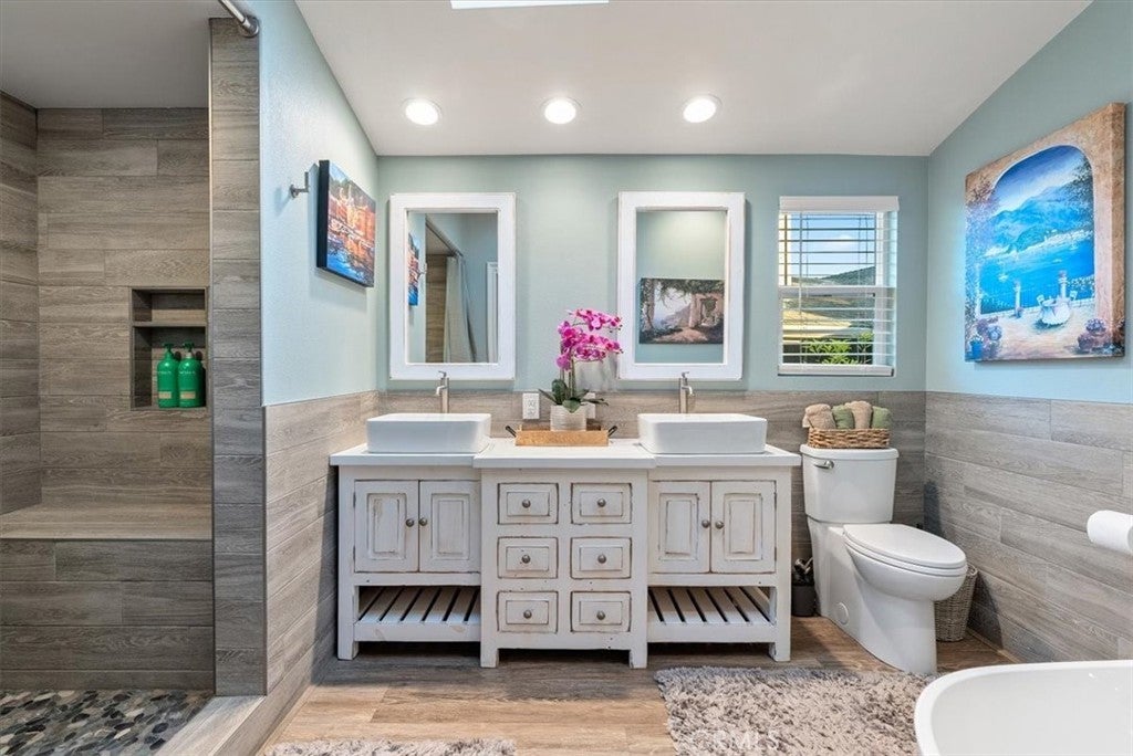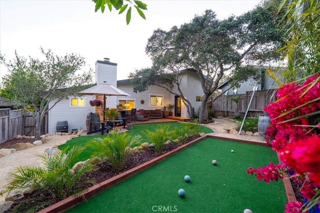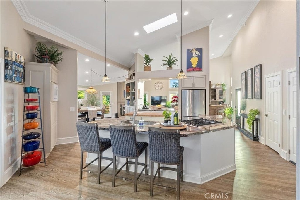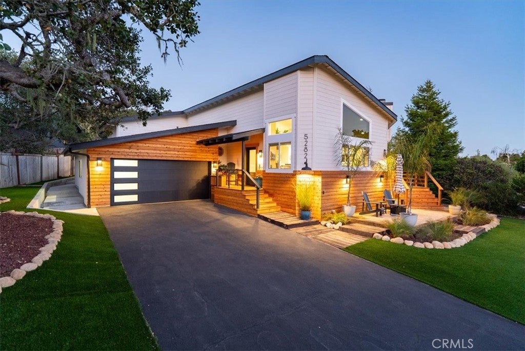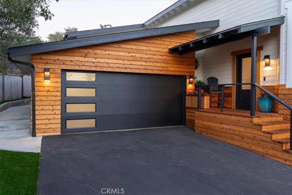 Discover this beautifully renovated 2,389± sq. ft. home in the highly sought-after Pine Knolls Estates neighborhood of Cambria, offering 3 bedrooms, 2.5 bathrooms, a bonus room, and an attached oversized 2-car garage. Fresh cedar siding pairs with modern interior finishes to create a one-of-a-kind residence designed for seamless indoor-outdoor living. The great room welcomes you with soaring ceilings and panoramic glass rising nearly 12 feet, framing wooded coastal views and filling the space with natural light. A cozy fireplace sets the tone for gatherings, while crown molding adds refinement throughout. At the heart of the home is an expansive open-concept “working kitchen,” newly equipped with custom cabinetry, dual fuel range, and appliances selected for the owner, a classically trained chef. Skylights illuminate hand-selected Blue Tempest quartzite counters, generous prep areas, and custom Boos Block workstations. A front-row seating bar invites friends and family to gather while meals are prepared, and French doors extend to the courtyard lounge—perfect for entertaining and outdoor cooking. The primary suite offers elevated ceilings, its own fireplace, and serene wooded views. The spa-inspired bath includes a custom shower with multiple Hansgrohe showerheads, a soaking tub, and a dual sink vanity handcrafted from reclaimed wood. French doors open to the private courtyard deck, where a swim spa provides the ultimate space to relax. Two additional bedrooms and a bonus room/office add flexibility for family, guests, or work needs. Outdoor living has been elevated with four custom decks, a stone and reclaimed railroad tie patio, and thoughtful landscaping. Low-maintenance plantings, turf grass, bocce ball court, and tranquil tree views combine to create a true retreat. Blending striking design, chef-driven detail, and inviting outdoor spaces, this Cambria property embodies the best of Central Coast living.
