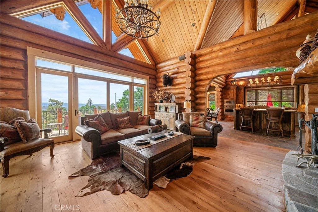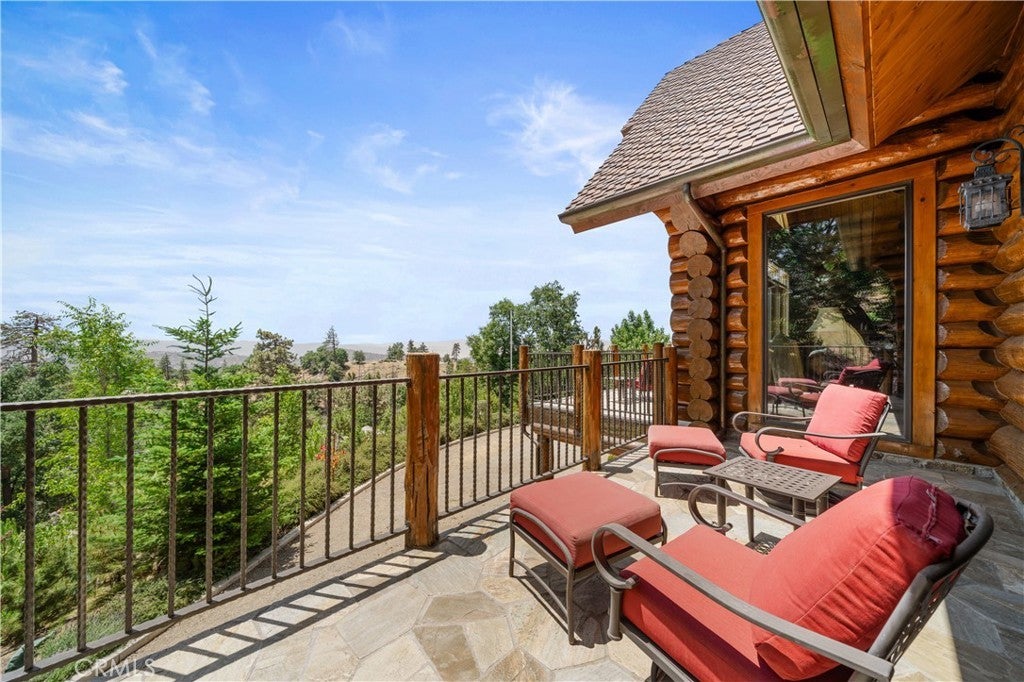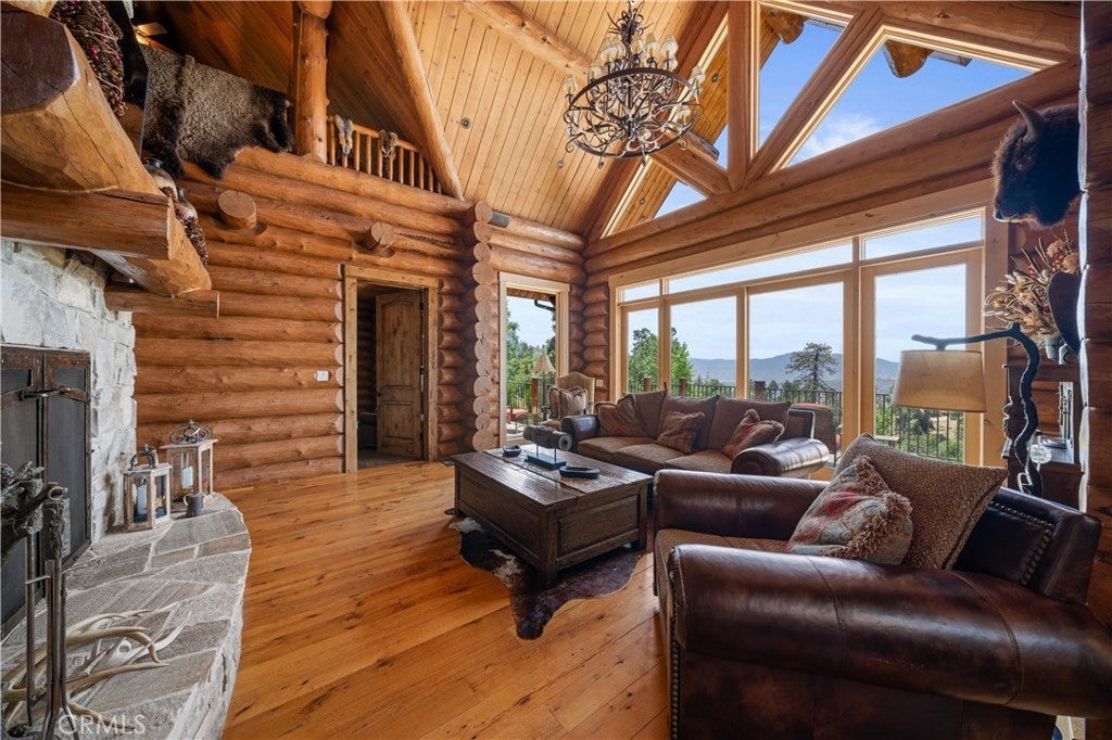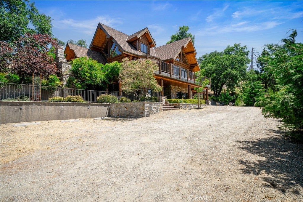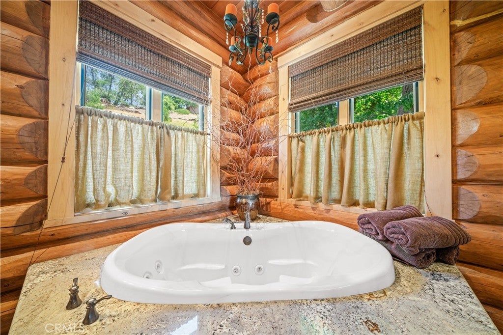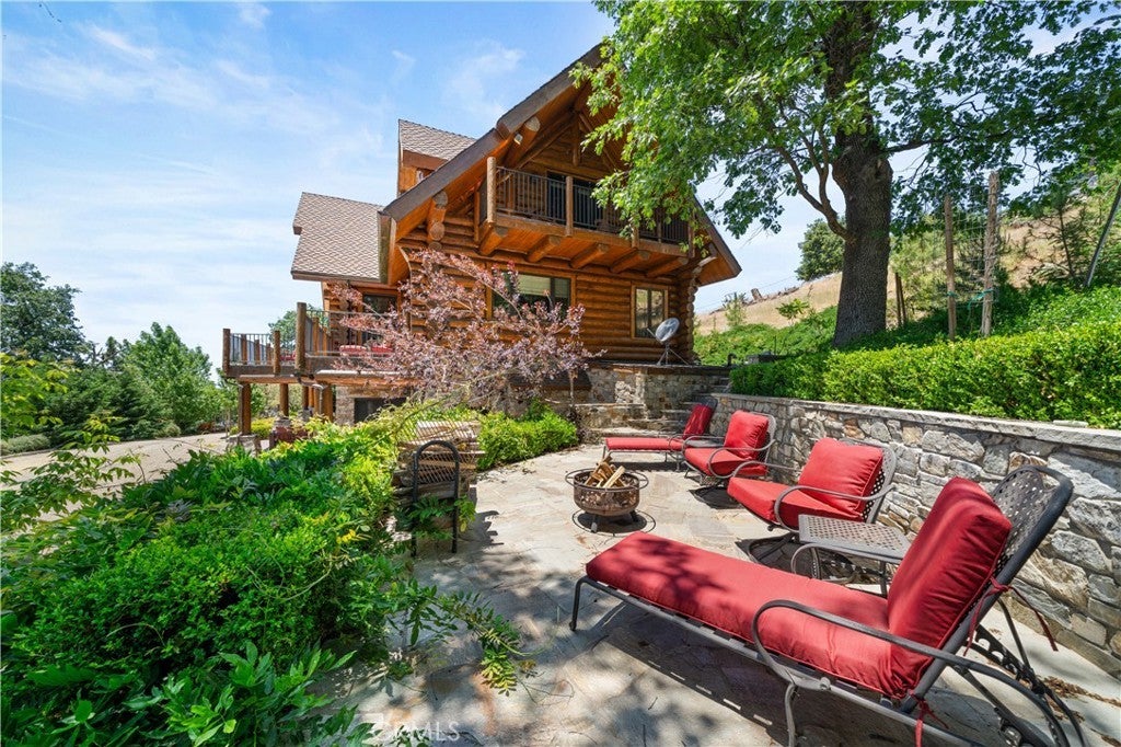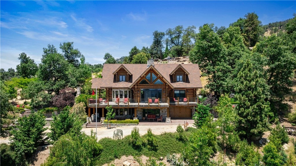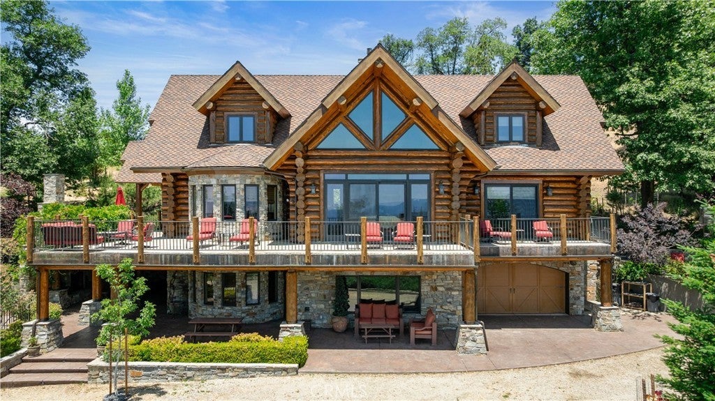 Unveil this exquisite 4-bed, 3.5 bath custom log home by Caribou Creek, boasting 3,717 sq ft across 3.63 acres. Crafted in Swedish Cope style with premium Western White Pine, this sanctuary combines exceptional artistry with rustic luxury within the prestigious gated Bear Valley Springs community. Upper Level loft: Generous bedroom with ensuite bath, walk-in closet, and a balcony with a beautiful view. Ideal for guests, home office, or a serene escape. Main Level: Luxurious primary suite featuring a stone fireplace, spa inspired jacuzzi tub, radiant heated floors, dual vanities, walk-in closet, and a private balcony with mountain views; expansive living area with soaring ceilings and a Mcgregor Lake Ledge stone fireplace; gourmet kitchen equipped with Viking appliances, reverse osmosis, triple thick leathered granite counters, custom alder/hickory cabinets, and an integrated BBQ station. Lower Level: Two additional bedrooms (one with built in bunk beds), a full bathroom, laundry closet with side by side washer/dryer, a game room with wet bar (copper sink, beverage fridge, cigar rack) plus a dedicated theater room with motorized screen and media center. Outdoor Oasis: Vast natural stone decks with propane BBQ, sink, fire pit areas, horseshoe pit, and multiple seating spots; secluded, tree lined acreage with sweeping views and outdoor gathering spaces. Added benefits: Finished garage with storage, dual zone HVAC, custom motorized gate, whole house fan, large water heater and water softener. Community Highlights: Relish exclusive access to an equestrian center, scenic riding trails, 9-hole golf course with driving range, Olympic sized swimming pool, tennis/pickleball courts, shooting range, fitness center with gym sauna, dog park and more. This stunning home is ready for its next chapter- contact your agent to schedule a private tour today!