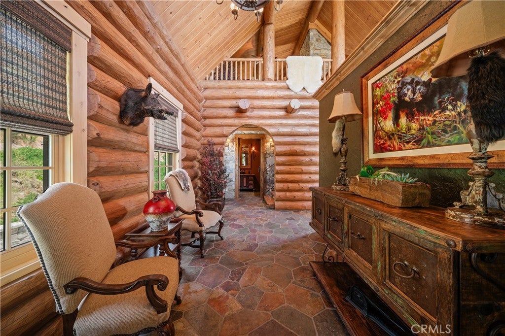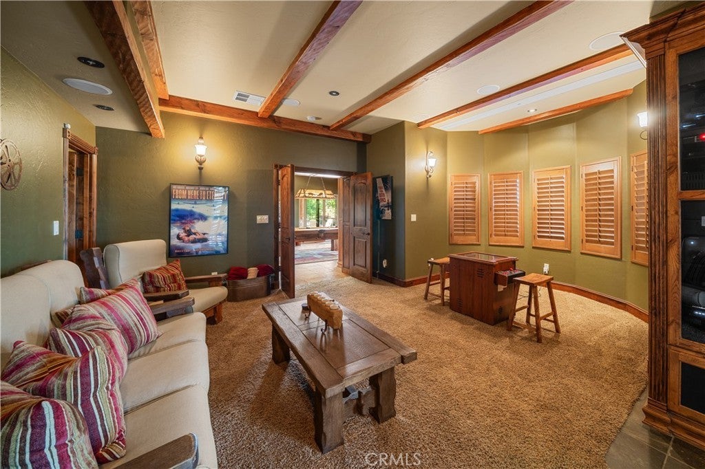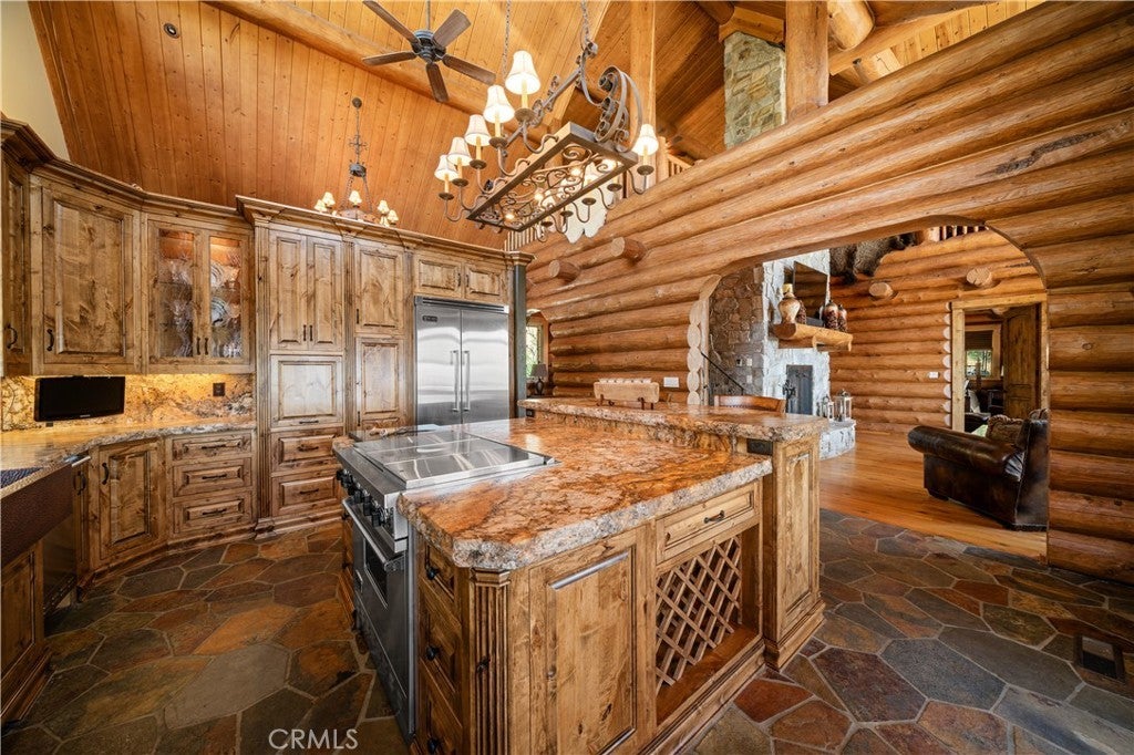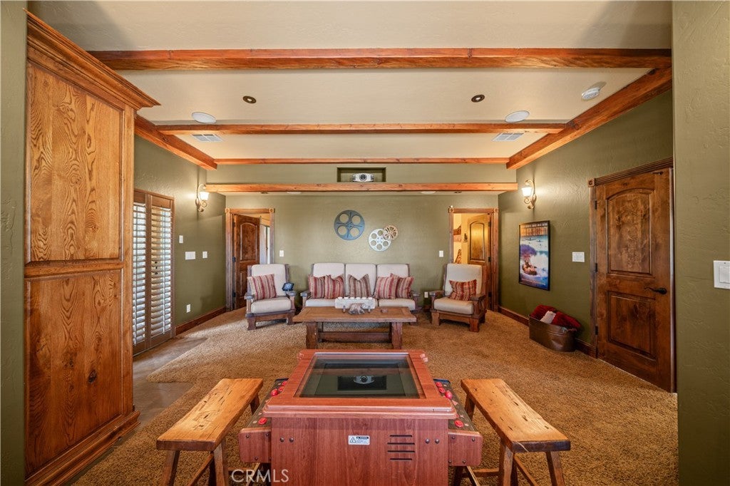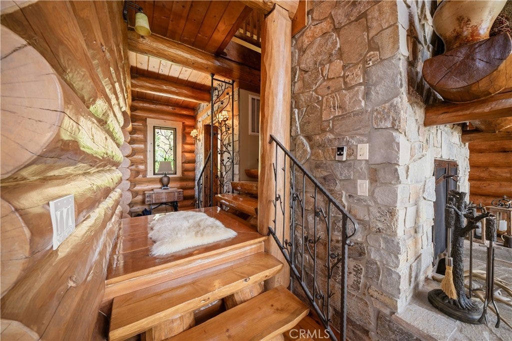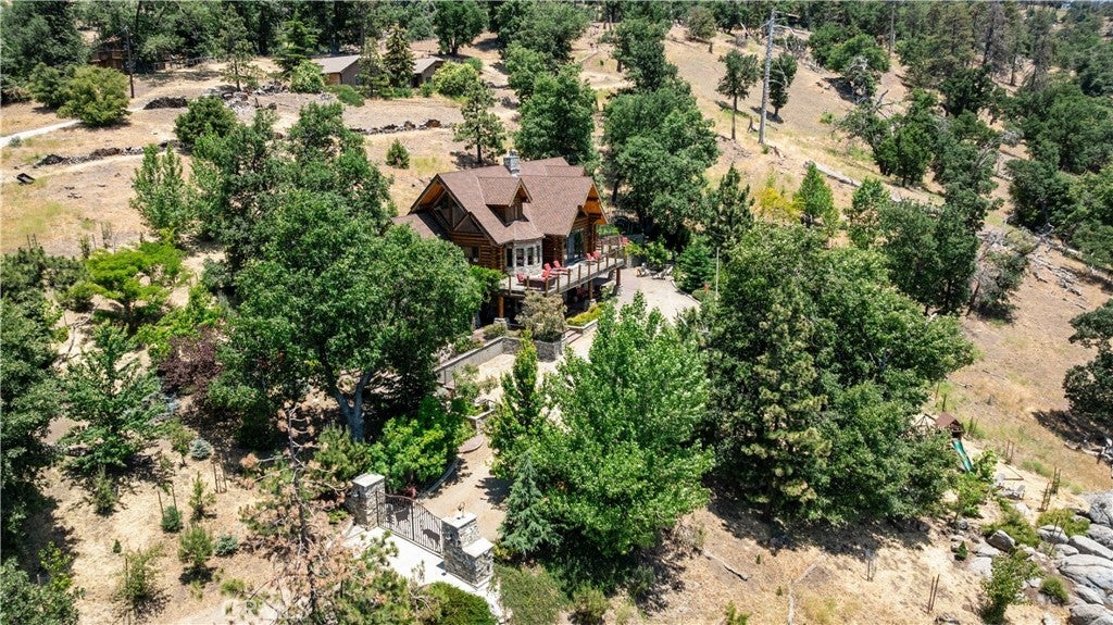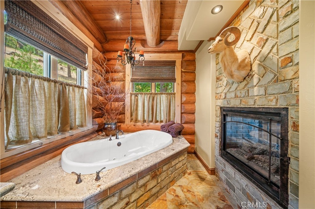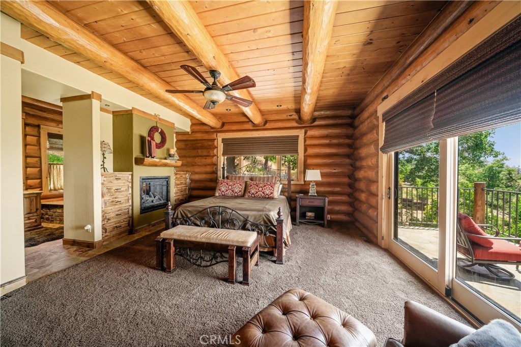 Unveil this exquisite 4-bed, 3.5 bath custom log home by Caribou Creek, boasting 3,717 sq ft across 3.63 acres. Crafted in Swedish Cope style with premium Western White Pine, this sanctuary combines exceptional artistry with rustic luxury within the prestigious gated Bear Valley Springs community. Upper Level loft: Generous bedroom with ensuite bath, walk-in closet, and a balcony with a beautiful view. Ideal for guests, home office, or a serene escape. Main Level: Luxurious primary suite featuring a stone fireplace, spa inspired jacuzzi tub, radiant heated floors, dual vanities, walk-in closet, and a private balcony with mountain views; expansive living area with soaring ceilings and a Mcgregor Lake Ledge stone fireplace; gourmet kitchen equipped with Viking appliances, reverse osmosis, triple thick leathered granite counters, custom alder/hickory cabinets, and an integrated BBQ station. Lower Level: Two additional bedrooms (one with built in bunk beds), a full bathroom, laundry closet with side by side washer/dryer, a game room with wet bar (copper sink, beverage fridge, cigar rack) plus a dedicated theater room with motorized screen and media center. Outdoor Oasis: Vast natural stone decks with propane BBQ, sink, fire pit areas, horseshoe pit, and multiple seating spots; secluded, tree lined acreage with sweeping views and outdoor gathering spaces. Added benefits: Finished garage with storage, dual zone HVAC, custom motorized gate, whole house fan, large water heater and water softener. Community Highlights: Relish exclusive access to an equestrian center, scenic riding trails, 9-hole golf course with driving range, Olympic sized swimming pool, tennis/pickleball courts, shooting range, fitness center with gym sauna, dog park and more. This stunning home is ready for its next chapter- contact your agent to schedule a private tour today!