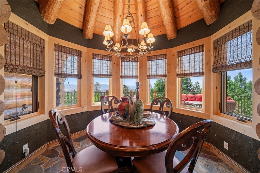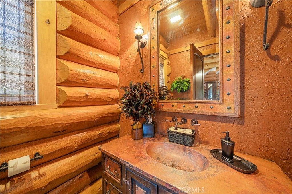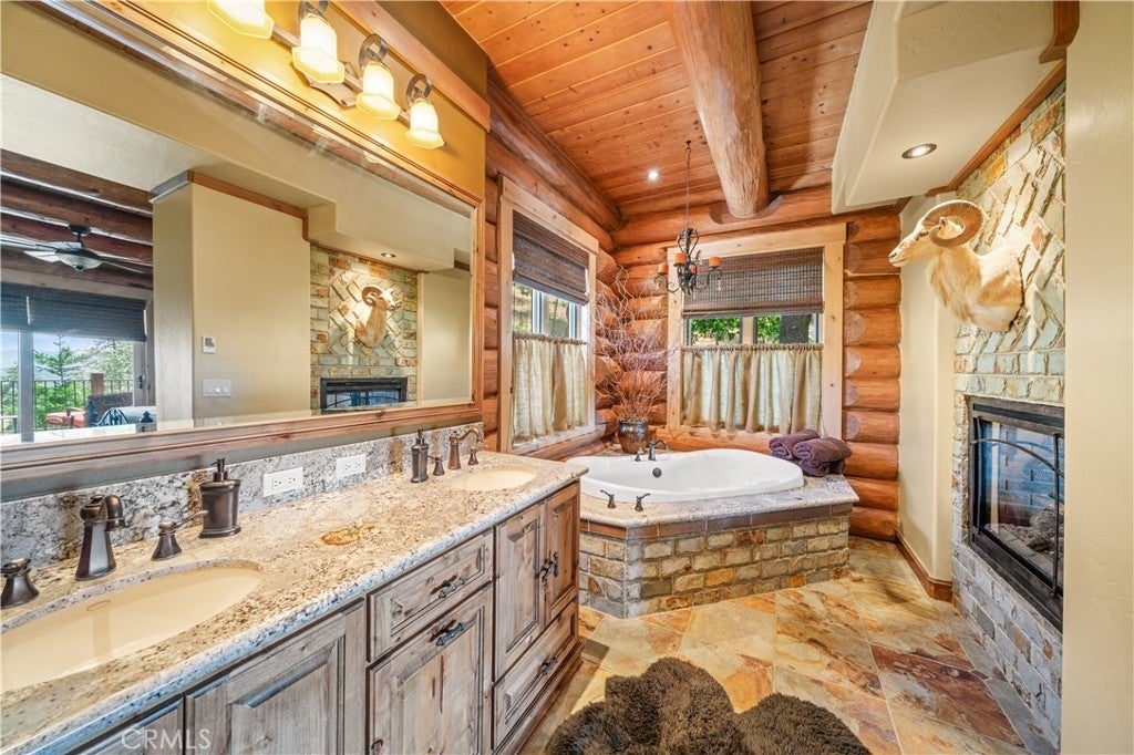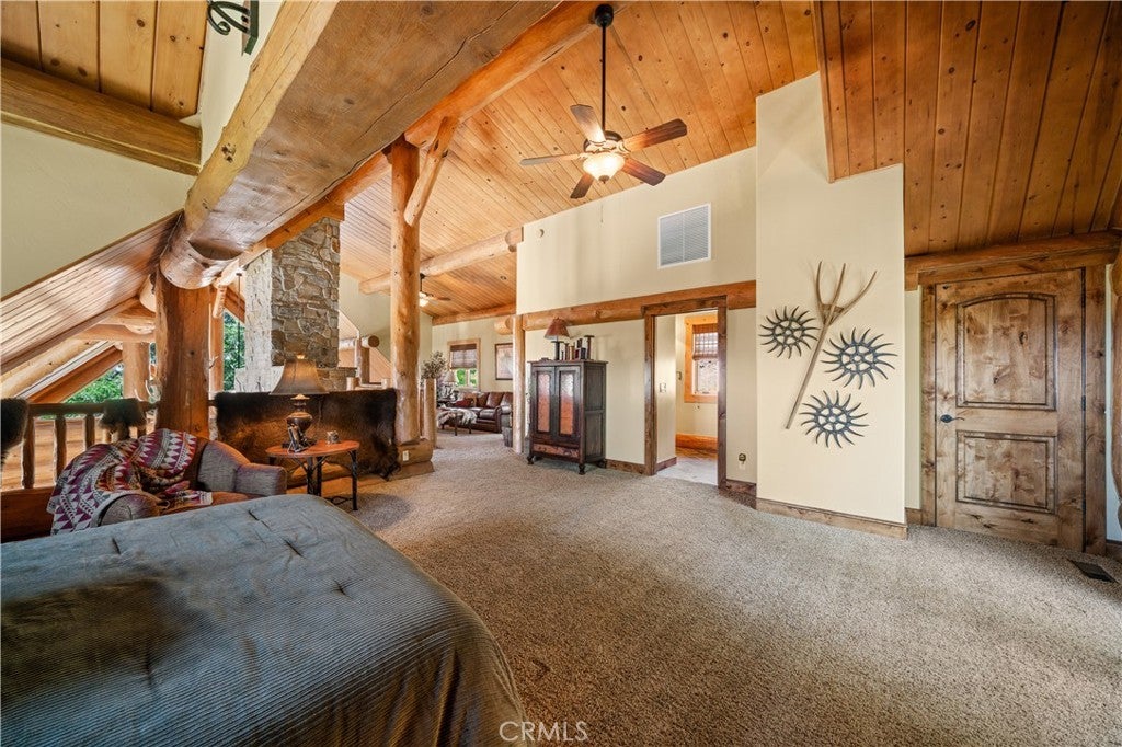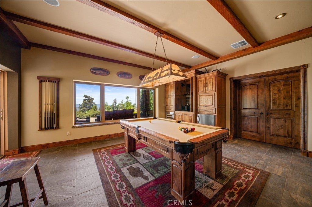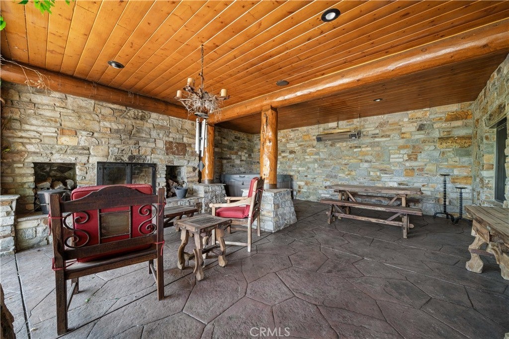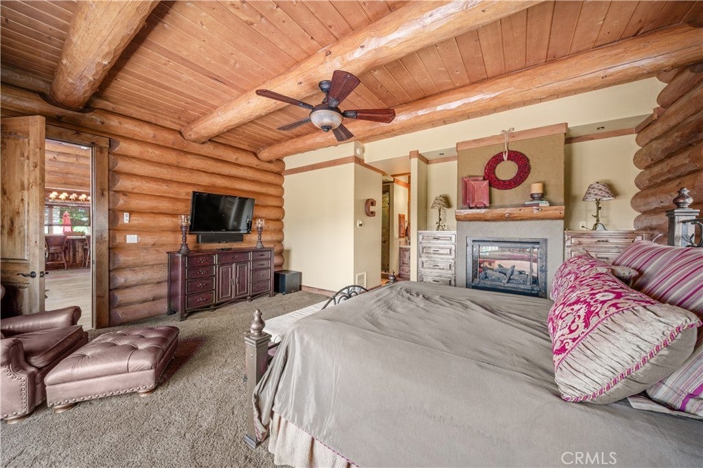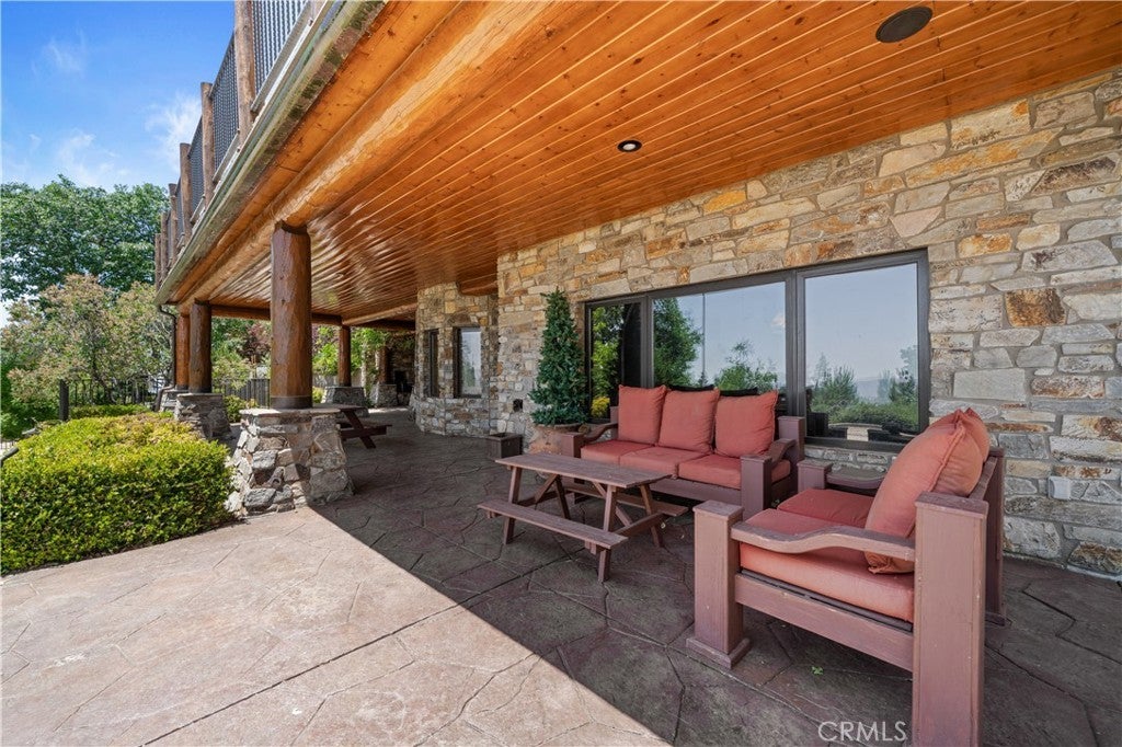 Unveil this exquisite 4-bed, 3.5 bath custom log home by Caribou Creek, boasting 3,717 sq ft across 3.63 acres. Crafted in Swedish Cope style with premium Western White Pine, this sanctuary combines exceptional artistry with rustic luxury within the prestigious gated Bear Valley Springs community. Upper Level loft: Generous bedroom with ensuite bath, walk-in closet, and a balcony with a beautiful view. Ideal for guests, home office, or a serene escape. Main Level: Luxurious primary suite featuring a stone fireplace, spa inspired jacuzzi tub, radiant heated floors, dual vanities, walk-in closet, and a private balcony with mountain views; expansive living area with soaring ceilings and a Mcgregor Lake Ledge stone fireplace; gourmet kitchen equipped with Viking appliances, reverse osmosis, triple thick leathered granite counters, custom alder/hickory cabinets, and an integrated BBQ station. Lower Level: Two additional bedrooms (one with built in bunk beds), a full bathroom, laundry closet with side by side washer/dryer, a game room with wet bar (copper sink, beverage fridge, cigar rack) plus a dedicated theater room with motorized screen and media center. Outdoor Oasis: Vast natural stone decks with propane BBQ, sink, fire pit areas, horseshoe pit, and multiple seating spots; secluded, tree lined acreage with sweeping views and outdoor gathering spaces. Added benefits: Finished garage with storage, dual zone HVAC, custom motorized gate, whole house fan, large water heater and water softener. Community Highlights: Relish exclusive access to an equestrian center, scenic riding trails, 9-hole golf course with driving range, Olympic sized swimming pool, tennis/pickleball courts, shooting range, fitness center with gym sauna, dog park and more. This stunning home is ready for its next chapter- contact your agent to schedule a private tour today!