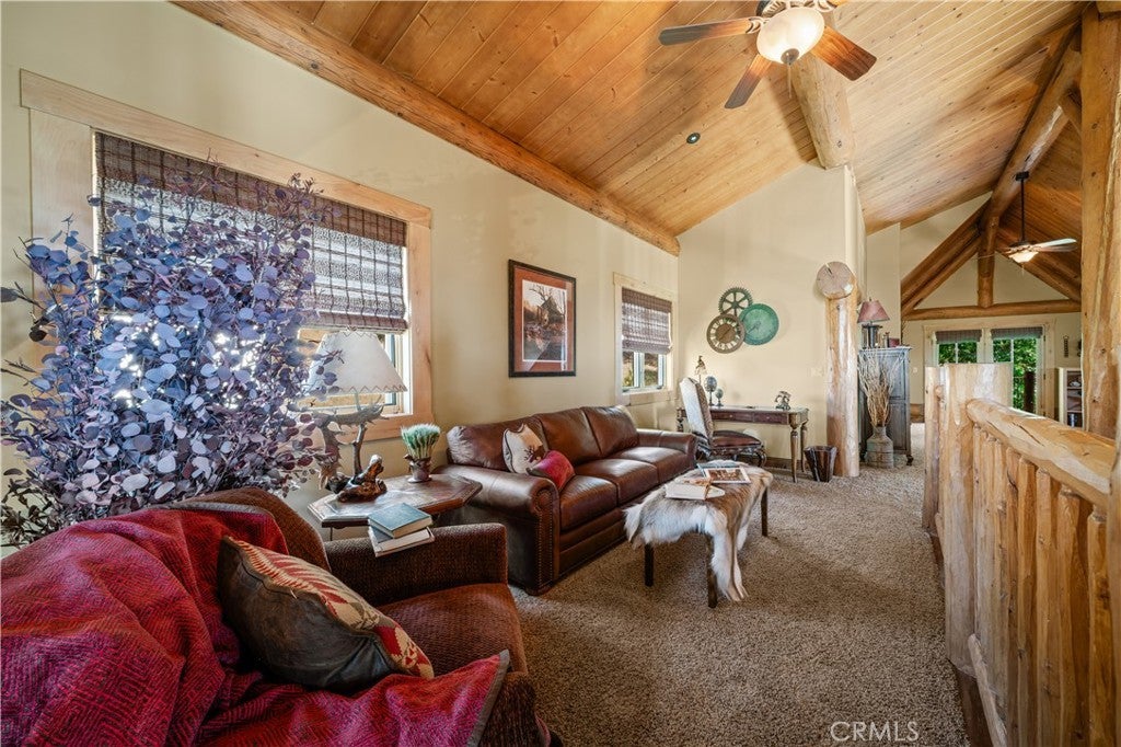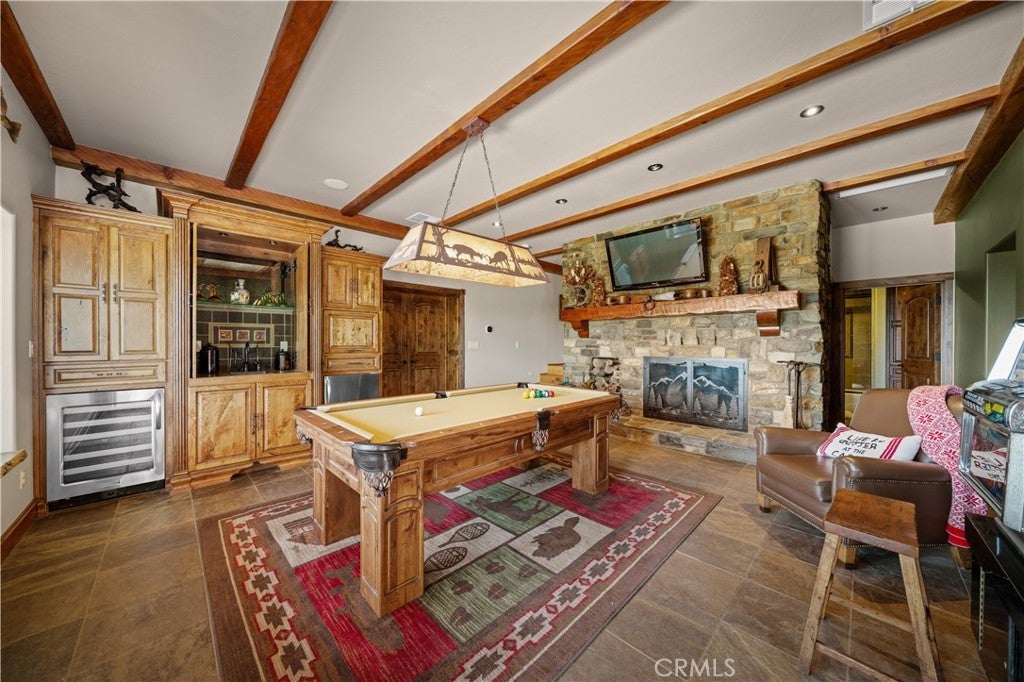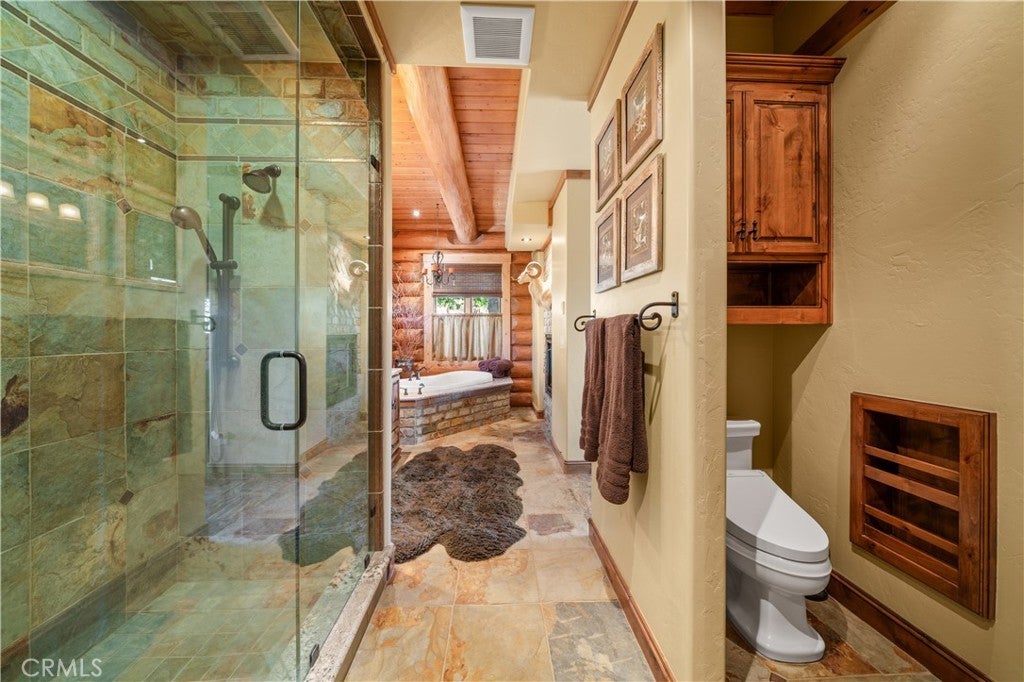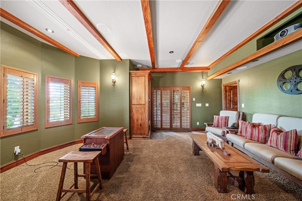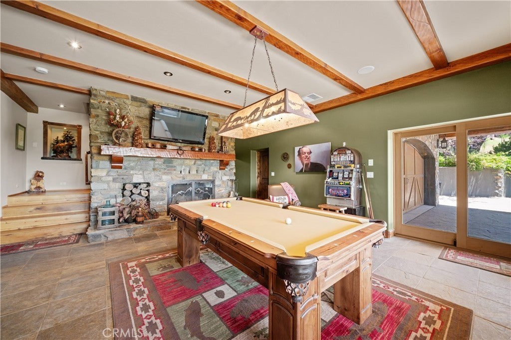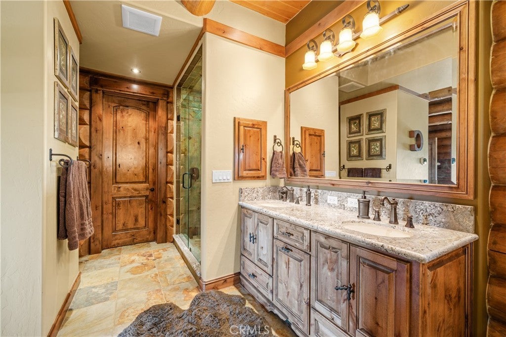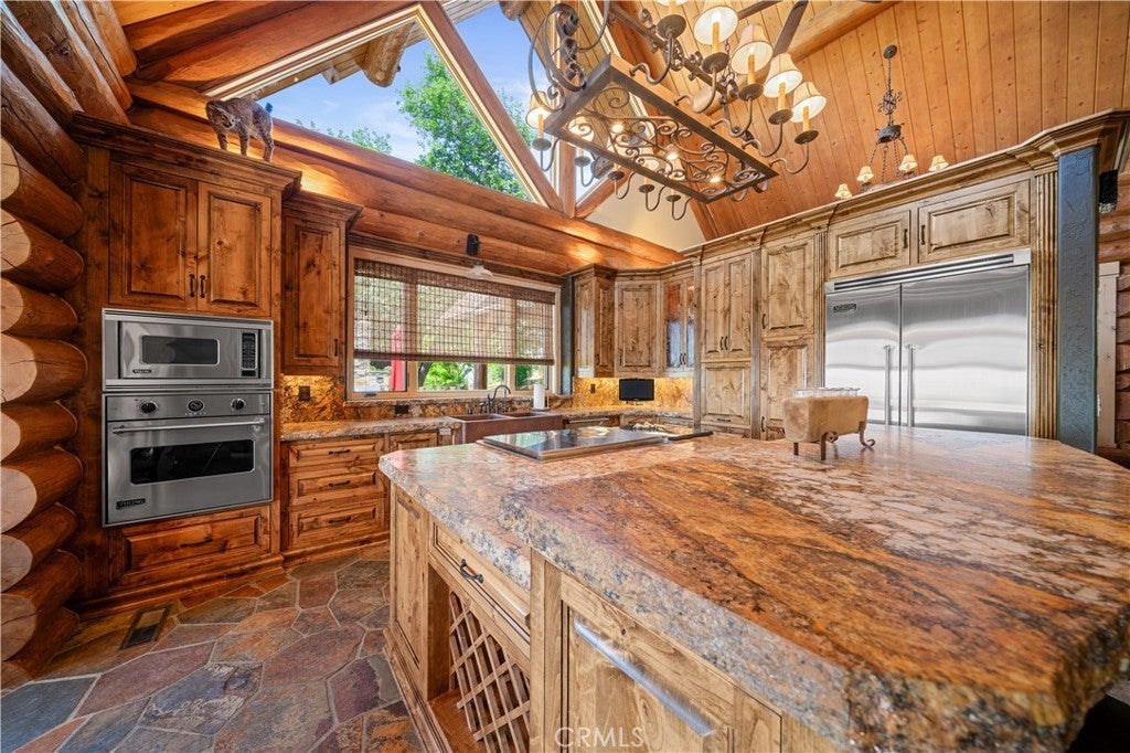Unveil this exquisite 4-bed, 3.5 bath custom log home by Caribou Creek, boasting 3,717 sq ft across 3.63 acres. Crafted in Swedish Cope style with premium Western White Pine, this sanctuary combines exceptional artistry with rustic luxury within the prestigious gated Bear Valley Springs community. Upper Level loft: Generous bedroom with ensuite bath, walk-in closet, and a balcony with a beautiful view. Ideal for guests, home office, or a serene escape. Main Level: Luxurious primary suite featuring a stone fireplace, spa inspired jacuzzi tub, radiant heated floors, dual vanities, walk-in closet, and a private balcony with mountain views; expansive living area with soaring ceilings and a Mcgregor Lake Ledge stone fireplace; gourmet kitchen equipped with Viking appliances, reverse osmosis, triple thick leathered granite counters, custom alder/hickory cabinets, and an integrated BBQ station. Lower Level: Two additional bedrooms (one with built in bunk beds), a full bathroom, laundry closet with side by side washer/dryer, a game room with wet bar (copper sink, beverage fridge, cigar rack) plus a dedicated theater room with motorized screen and media center. Outdoor Oasis: Vast natural stone decks with propane BBQ, sink, fire pit areas, horseshoe pit, and multiple seating spots; secluded, tree lined acreage with sweeping views and outdoor gathering spaces. Added benefits: Finished garage with storage, dual zone HVAC, custom motorized gate, whole house fan, large water heater and water softener. Community Highlights: Relish exclusive access to an equestrian center, scenic riding trails, 9-hole golf course with driving range, Olympic sized swimming pool, tennis/pickleball courts, shooting range, fitness center with gym sauna, dog park and more. This stunning home is ready for its next chapter- contact your agent to schedule a private tour today!