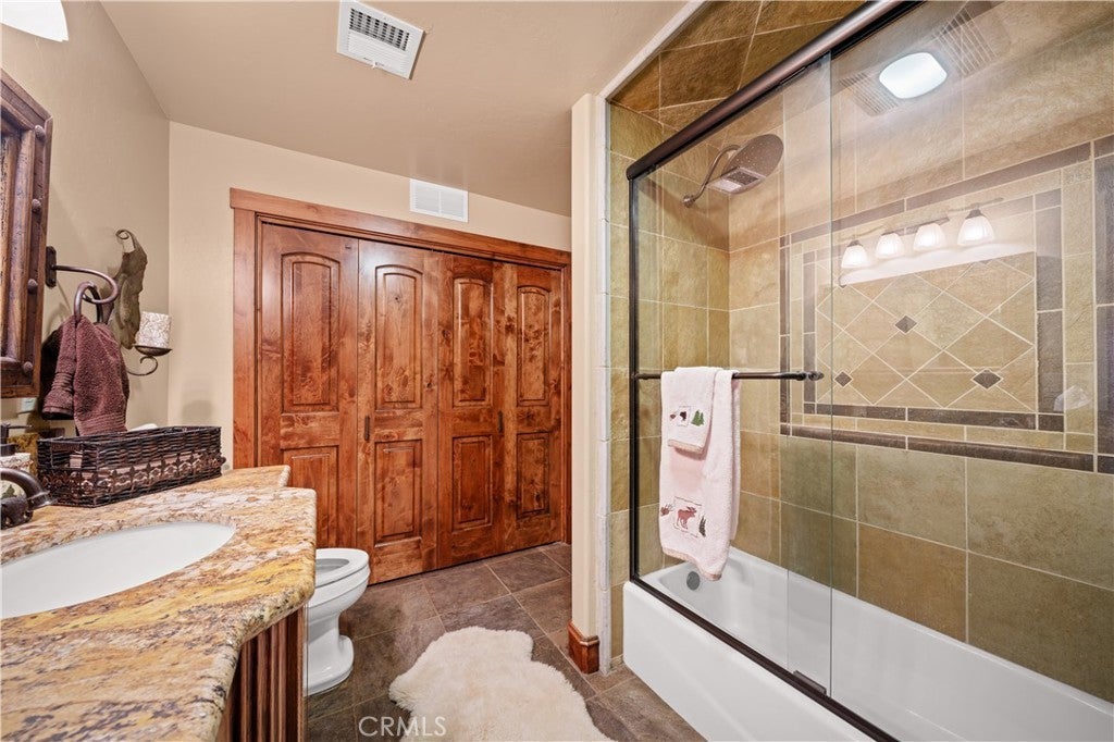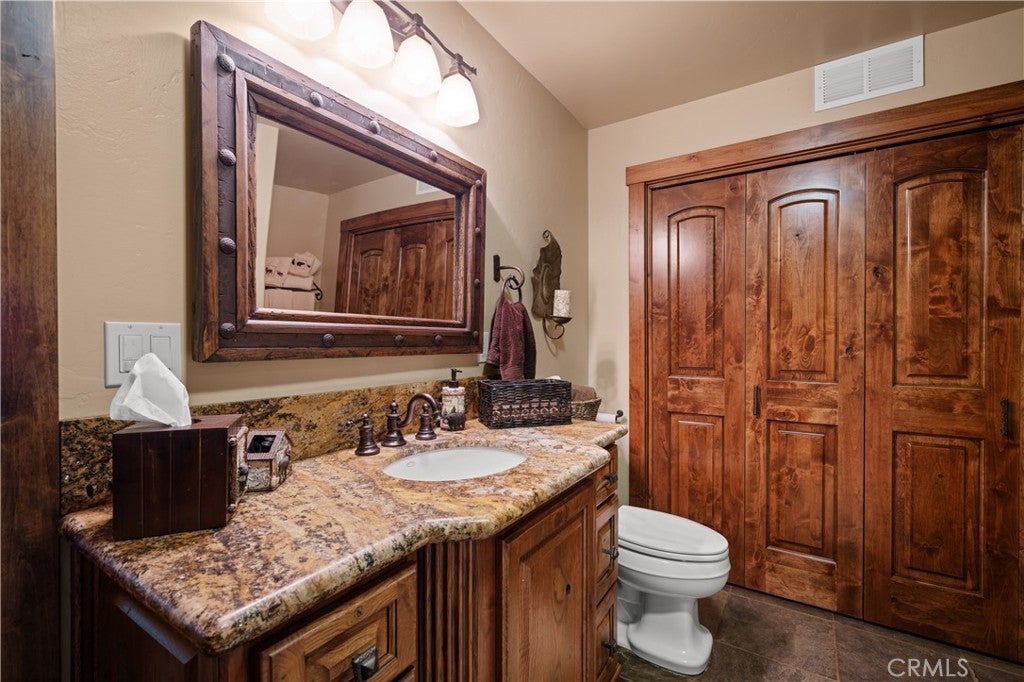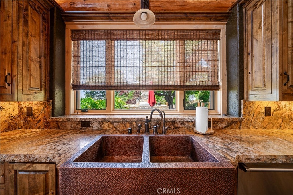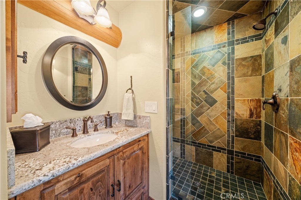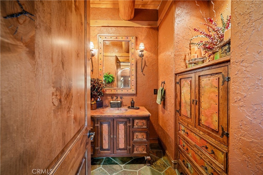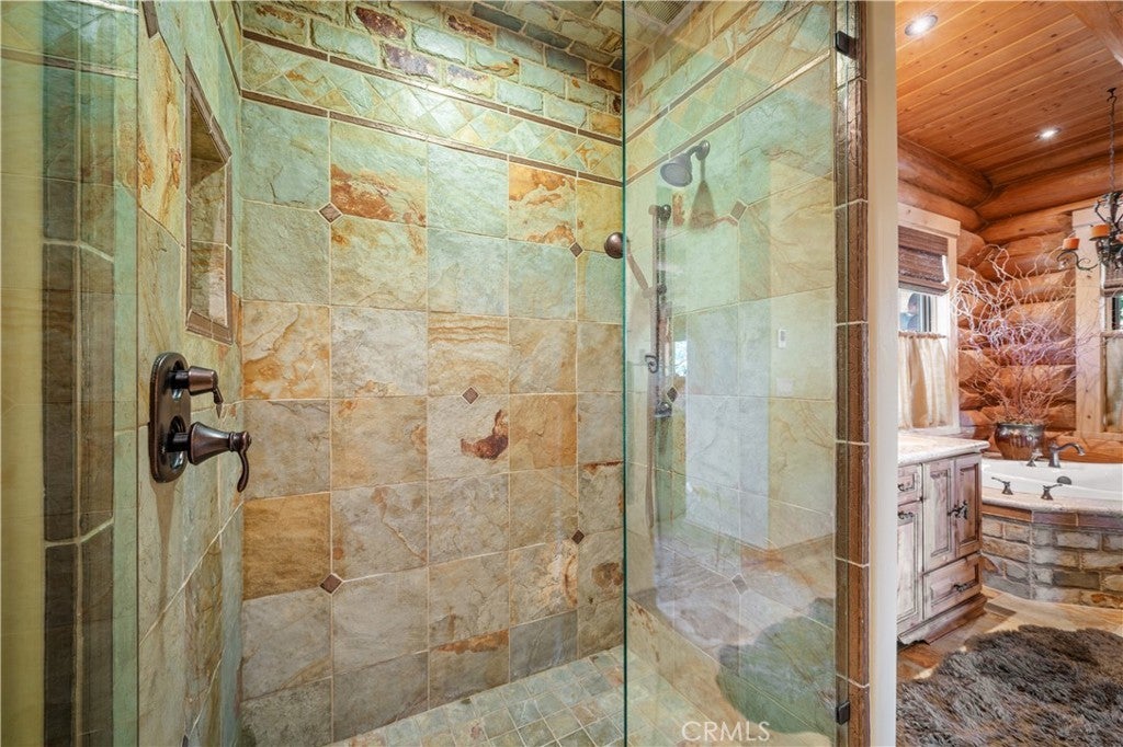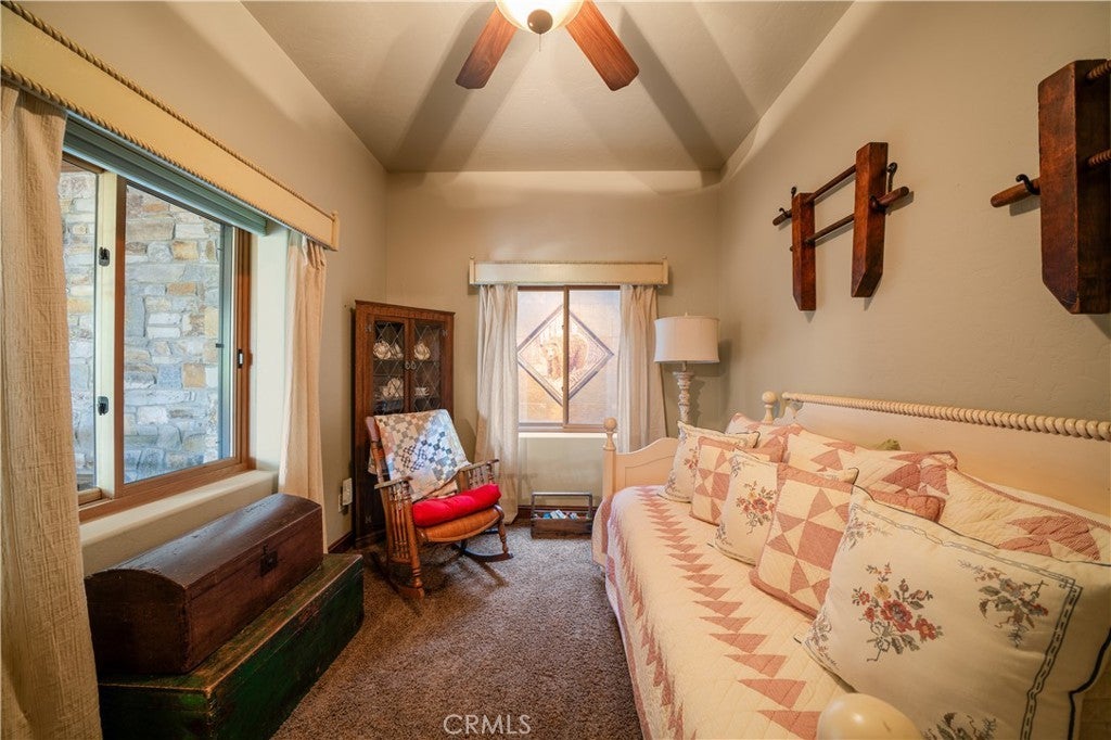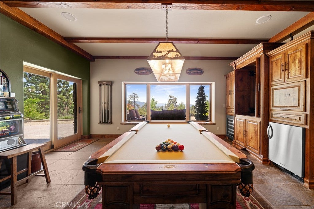 Unveil this exquisite 4-bed, 3.5 bath custom log home by Caribou Creek, boasting 3,717 sq ft across 3.63 acres. Crafted in Swedish Cope style with premium Western White Pine, this sanctuary combines exceptional artistry with rustic luxury within the prestigious gated Bear Valley Springs community. Upper Level loft: Generous bedroom with ensuite bath, walk-in closet, and a balcony with a beautiful view. Ideal for guests, home office, or a serene escape. Main Level: Luxurious primary suite featuring a stone fireplace, spa inspired jacuzzi tub, radiant heated floors, dual vanities, walk-in closet, and a private balcony with mountain views; expansive living area with soaring ceilings and a Mcgregor Lake Ledge stone fireplace; gourmet kitchen equipped with Viking appliances, reverse osmosis, triple thick leathered granite counters, custom alder/hickory cabinets, and an integrated BBQ station. Lower Level: Two additional bedrooms (one with built in bunk beds), a full bathroom, laundry closet with side by side washer/dryer, a game room with wet bar (copper sink, beverage fridge, cigar rack) plus a dedicated theater room with motorized screen and media center. Outdoor Oasis: Vast natural stone decks with propane BBQ, sink, fire pit areas, horseshoe pit, and multiple seating spots; secluded, tree lined acreage with sweeping views and outdoor gathering spaces. Added benefits: Finished garage with storage, dual zone HVAC, custom motorized gate, whole house fan, large water heater and water softener. Community Highlights: Relish exclusive access to an equestrian center, scenic riding trails, 9-hole golf course with driving range, Olympic sized swimming pool, tennis/pickleball courts, shooting range, fitness center with gym sauna, dog park and more. This stunning home is ready for its next chapter- contact your agent to schedule a private tour today!