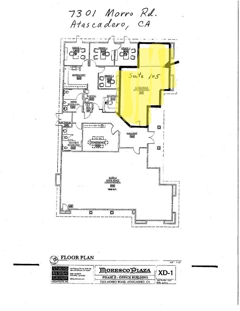 Premier office space in the Moresco Plaza. Moresco Plaza is composed of several buildings with beautiful Tuscan style finishes. The Tuscan style architecture features covered loggias, imported tile, coffered ceilings and decorative railings. Conveniently located in the heart of Atascadero on the Morro Road business corridor just off HWY 101. Suite 105 A&B is a spacious corner unit that is approximately 770 square feet. Unit A & B are connected by doorway and each have their own ingress and egress door to the outside. This space shares a luxurious conference room and restrooms. With Ample parking and easy visibility this is an ideal location for your business. Base rent plus NNN estimated at $.80 sq ft.