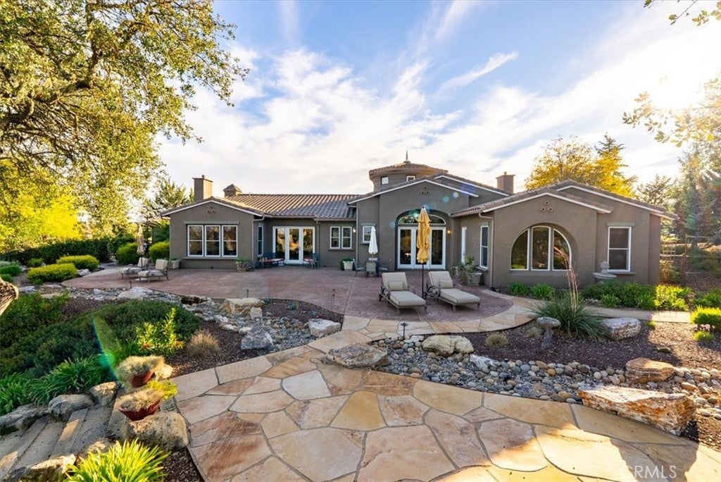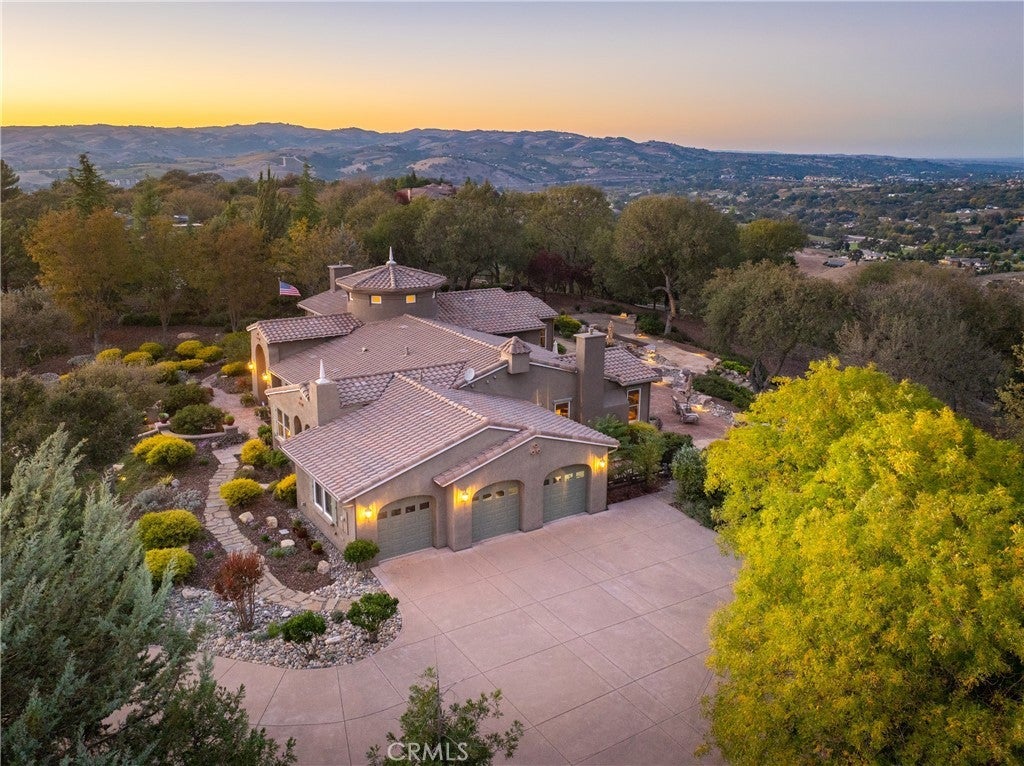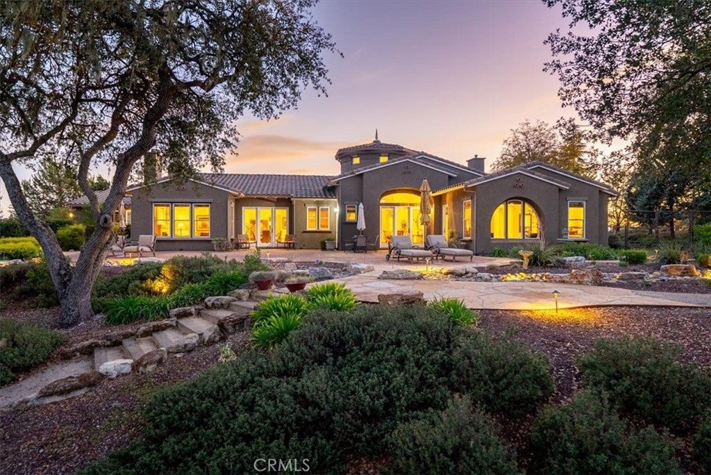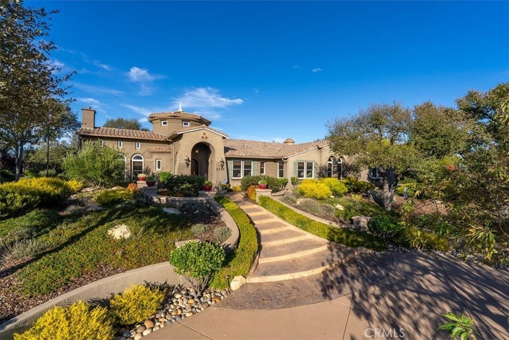 Experience refined Central Coast living in this stunning 4,146± sq. ft. Spanish Colonial estate, perfectly positioned on a private 3± acre parcel within the exclusive gates of Santa Ysabel Ranch. Enjoy sweeping 180° views of vineyards and mountains from nearly every room. This 4-bedroom, 3.5-bath home welcomes you through a grand rotunda entry with soaring ceilings, custom lighting, and travertine flooring throughout. The formal living and dining rooms feature tall Anderson windows framing breathtaking vistas and a cozy gas fireplace. The gourmet kitchen is equipped with GE Monogram stainless appliances, including a six-burner range, double ovens, wine fridge, and granite countertops with maple cabinetry. The adjoining family room and casual dining area create an inviting space for entertaining with seamless indoor-outdoor flow. The spacious primary suite offers privacy, dual walk-in closets, and a luxurious bath with soaking tub and large shower. Additional bedrooms and a flexible office space capture beautiful hillside and sunset views. Outdoor living shines with expansive flagstone patios, multiple sitting areas, and lush landscaping surrounded by heritage oaks - perfect for dining, relaxing, or entertaining under the stars. Additional features include an epoxy-finished 3-car garage with custom cabinetry, Culligan water system, ADT security, and custom lighting throughout. Santa Ysabel Ranch offers 24/7 gated security, walking trails, tennis courts, and a serene lake setting - an unparalleled blend of luxury, privacy, and natural beauty.