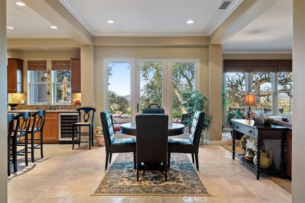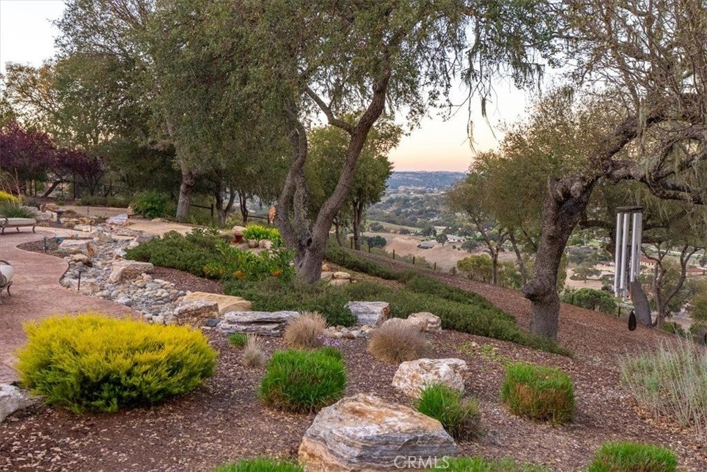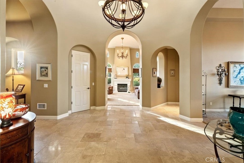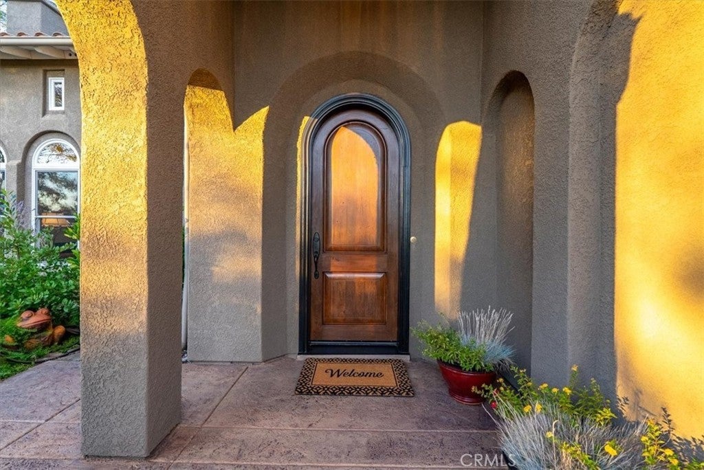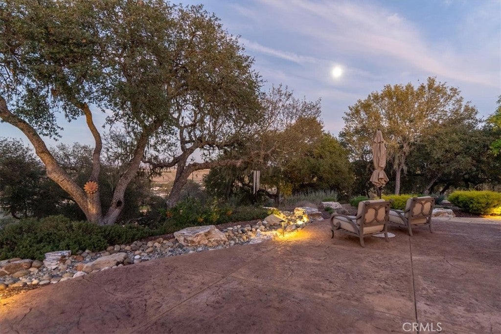 Experience refined Central Coast living in this stunning 4,146± sq. ft. Spanish Colonial estate, perfectly positioned on a private 3± acre parcel within the exclusive gates of Santa Ysabel Ranch. Enjoy sweeping 180° views of vineyards and mountains from nearly every room. This 4-bedroom, 3.5-bath home welcomes you through a grand rotunda entry with soaring ceilings, custom lighting, and travertine flooring throughout. The formal living and dining rooms feature tall Anderson windows framing breathtaking vistas and a cozy gas fireplace. The gourmet kitchen is equipped with GE Monogram stainless appliances, including a six-burner range, double ovens, wine fridge, and granite countertops with maple cabinetry. The adjoining family room and casual dining area create an inviting space for entertaining with seamless indoor-outdoor flow. The spacious primary suite offers privacy, dual walk-in closets, and a luxurious bath with soaking tub and large shower. Additional bedrooms and a flexible office space capture beautiful hillside and sunset views. Outdoor living shines with expansive flagstone patios, multiple sitting areas, and lush landscaping surrounded by heritage oaks - perfect for dining, relaxing, or entertaining under the stars. Additional features include an epoxy-finished 3-car garage with custom cabinetry, Culligan water system, ADT security, and custom lighting throughout. Santa Ysabel Ranch offers 24/7 gated security, walking trails, tennis courts, and a serene lake setting - an unparalleled blend of luxury, privacy, and natural beauty.