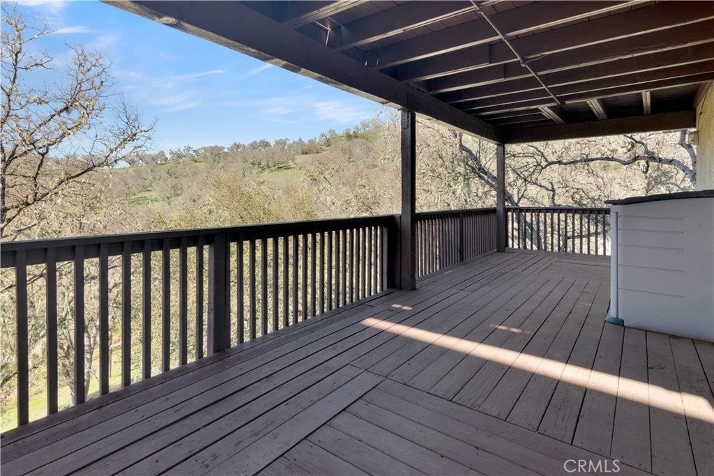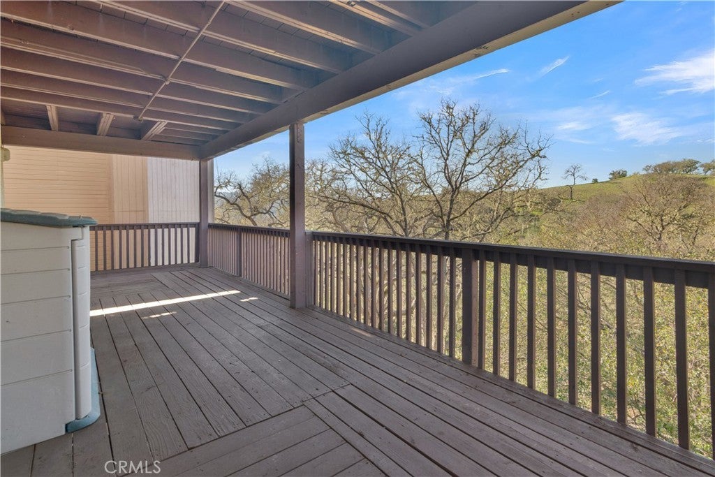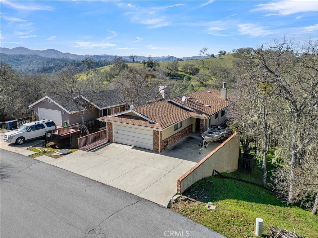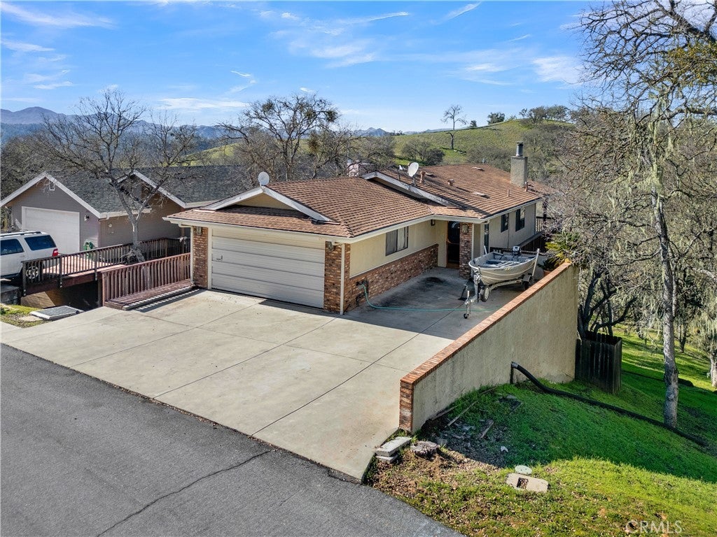 Located within the gated community of Oak Shores at Lake Nacimiento, this spacious home offers a solid opportunity to add value and personalize a lake retreat. A concrete driveway provides off-street parking for 3–4 vehicles along with a two-car attached garage, making it well-suited for full-time living, weekend use, or investment potential. The main level features a functional floor plan with a generous laundry room offering ample cabinet and counter space, a full bathroom, and a kitchen with a breakfast bar overlooking the dining area. The dining space opens into a warm, cabin-style living room with a wood-burning stove and French doors leading to a covered upper deck creating an inviting space to relax, entertain, and enjoy the surrounding natural setting. Downstairs are two guest bedrooms, storage beneath the stairs, and a spacious primary suite complete with a walk-in closet and private bathroom with a tub/shower combination. Each bedroom includes exterior access to the wraparound deck, offering flexible indoor-outdoor living. The rear, ground-level concrete patio provides additional outdoor space along with access to sub-area storage. While the home reflects its original finishes and would benefit from cosmetic updates, it presents a great opportunity for buyers to refresh and customize to their taste. The layout, outdoor spaces, and prime location within Oak Shores make this a compelling property for those seeking value and potential. Residents enjoy an impressive range of community amenities including pickleball courts, a heated swimming pool, clubhouse, hiking and riding trails, dog park, private campground, two launch ramps, and more, offering a true resort-style lake lifestyle.