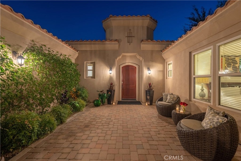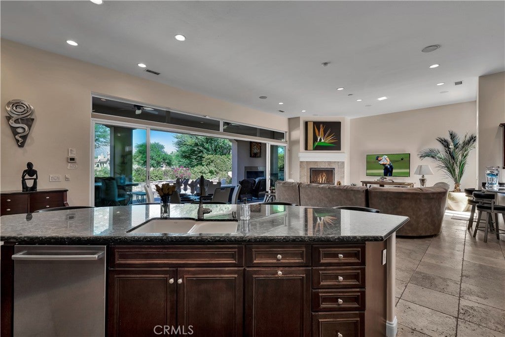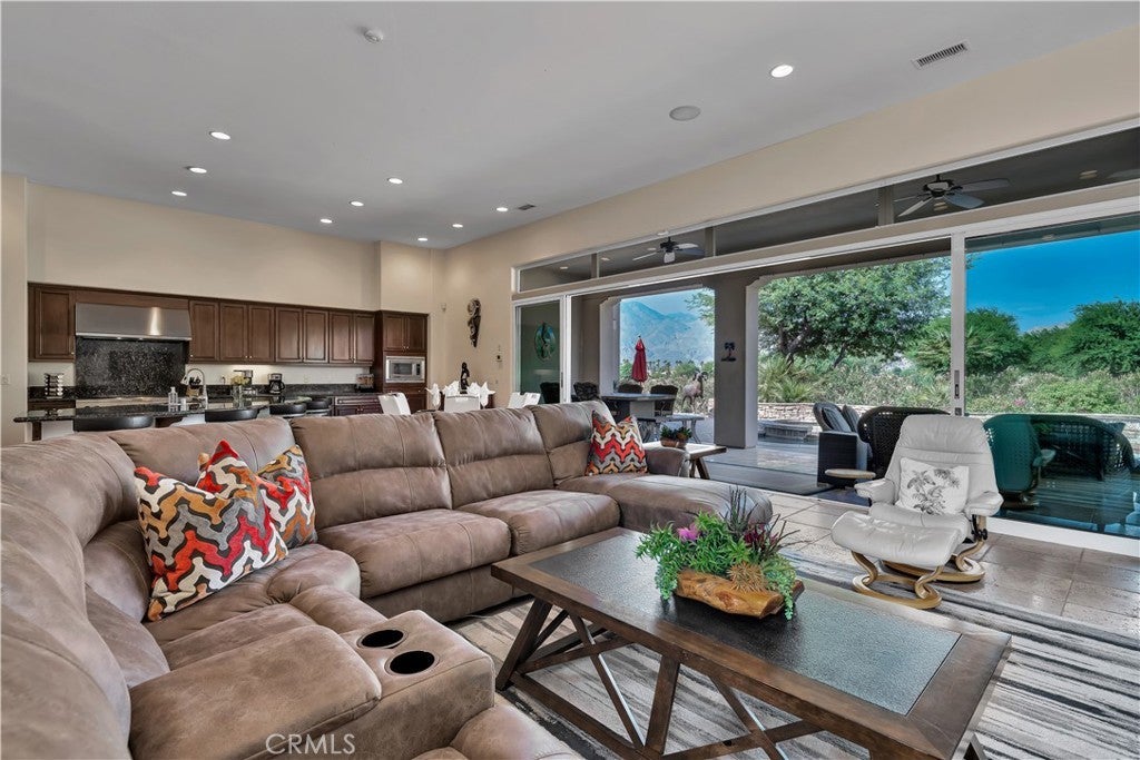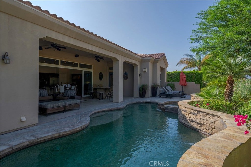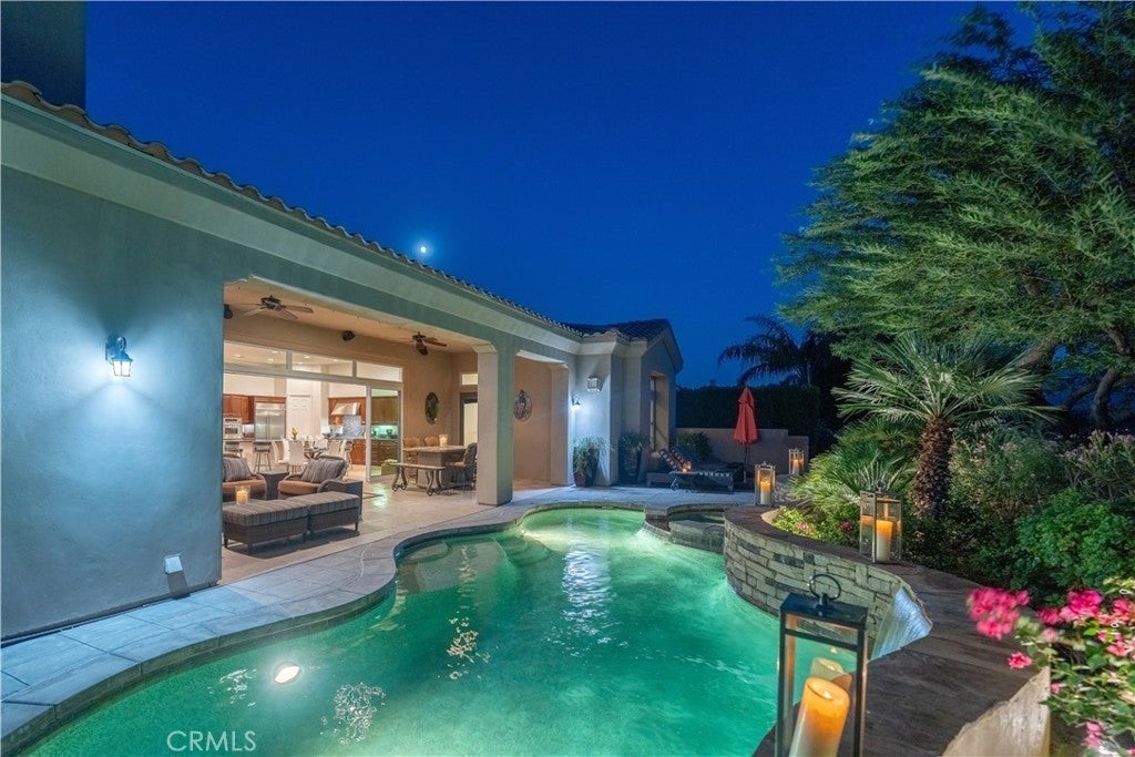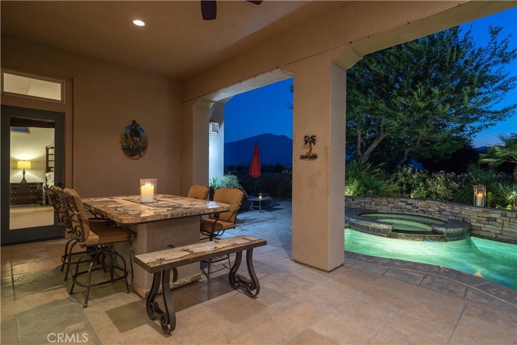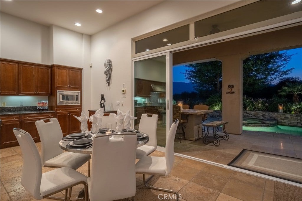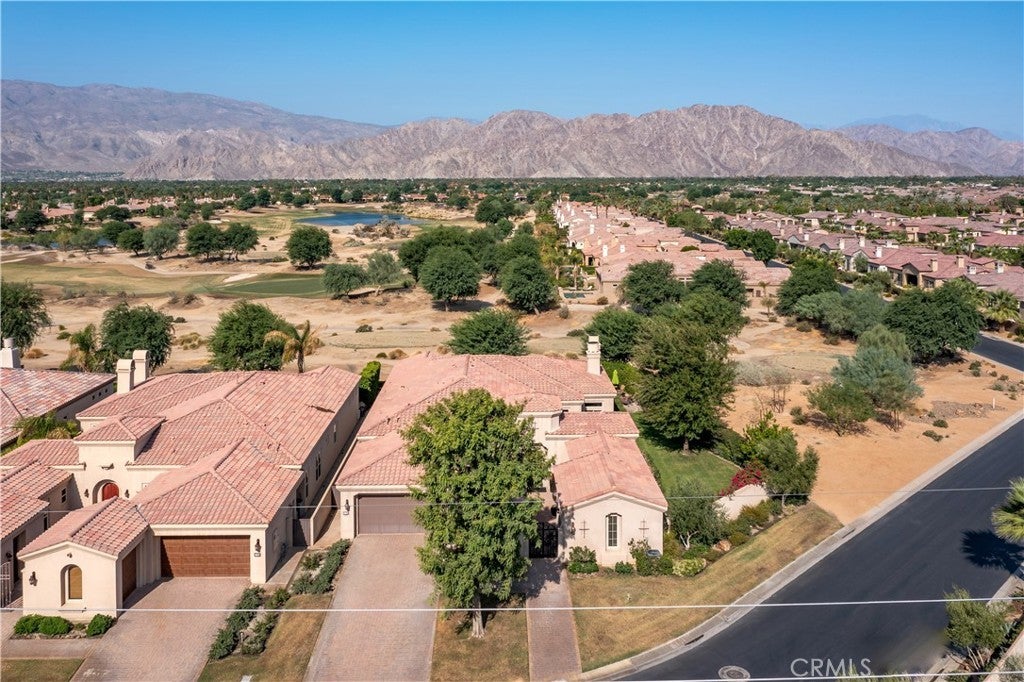 Welcome to your desert oasis, a luxurious 4,000 sq. ft. retreat with breathtaking western views of the Santa Rosa Mountains. This stunning home, located on the 6th tee box of the prestigious Greg Norman Resort Golf Course in PGA West, features four bedrooms and four-and-a-half bathrooms, offering panoramic vistas of the mountains and fairway. As you enter through a private gated courtyard on this corner lot, you'll enjoy complete seclusion from the outside world. The home showcases retractable glass walls along the entire back, seamlessly blending indoor and outdoor living spaces. You'll find a Life Source water filtration system providing pure water throughout the home, including the pool. The gourmet kitchen is a chef’s delight with granite countertops, stainless steel appliances, dual ovens, a microwave, dishwasher, and an 8-burner gas stove. The expansive island with seating for five is ideal for socializing while preparing meals, and there's additional seating for six at the kitchen table. For more formal dining, the separate dining room accommodates ten guests. The open floor plan allows for easy relaxation in the family room, which includes an oversized sectional sofa, a fireplace, and a 70" HDTV with Roku and Apple TV. The bar area, featuring seating for four and a Margaritaville Margarita Machine, is perfect for entertaining. Both the family room and kitchen open up to the pool area through retractable glass walls, bringing the beauty of the outdoors inside. Unwind by the tranquil saltwater pool and spa, which includes a waterfall and a built-in tanning shelf. Relax under the covered patio with misters and an outdoor living room, or enjoy the evening by the outdoor fireplace. The outdoor space offers six chaise lounges, multiple umbrellas, and a built-in natural gas BBQ. Each bedroom has its own en-suite bathroom, and two bathrobes are provided per bedroom. The master suite features a Cal King bed, a fireplace, a spacious seating area, and patio access with views of the fairway. The master bath includes a walk-in shower with dual showerheads, dual sinks, a vanity area, a large soaking tub, and an oversized walk-in closet. Bedrooms 2 and 3, located on opposite sides of the main house, each offer a Cal King bed, a walk-in shower, and two bathrobes per room. The detached casita, includes a large sitting area with a pull-out sofa and a TV, plus a fourth bedroom with a Cal King bed and its own en-suite bathroom.