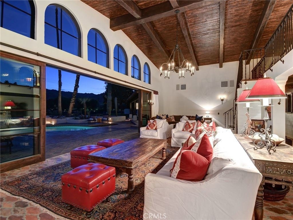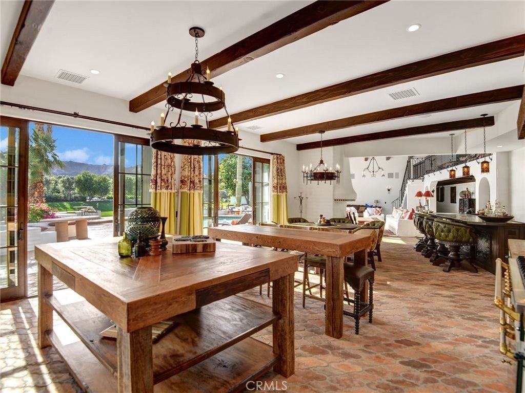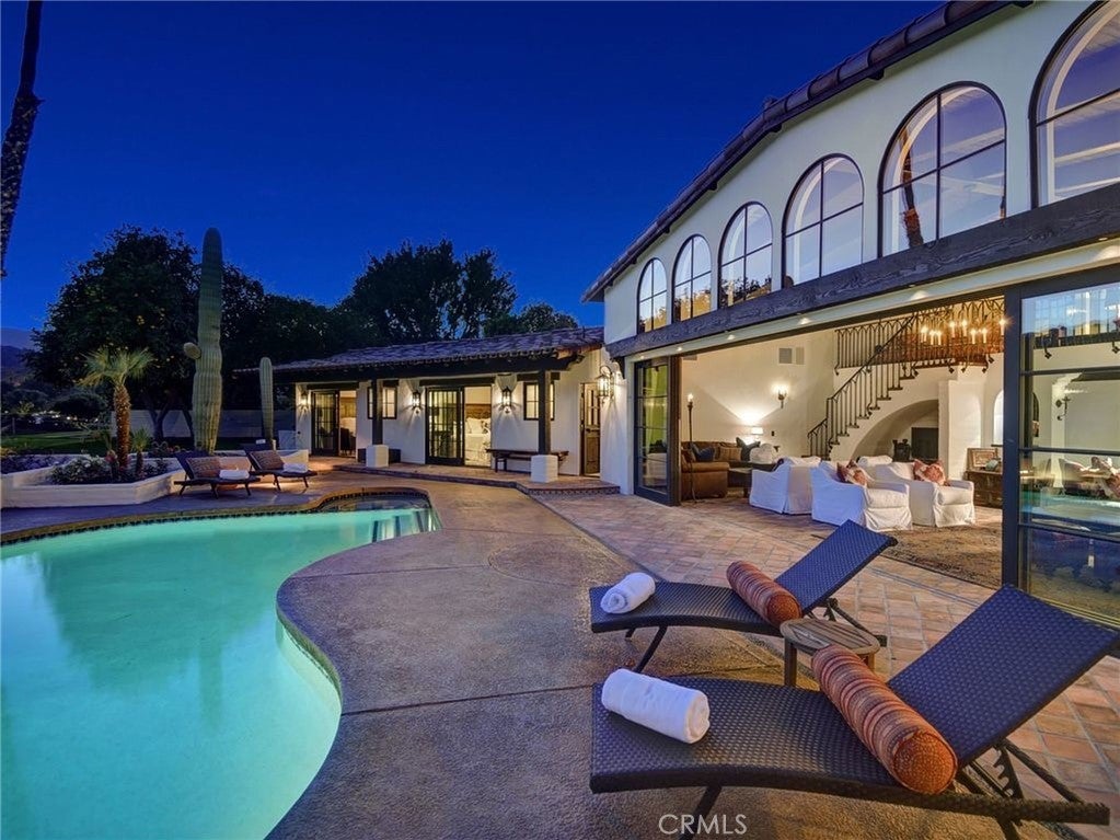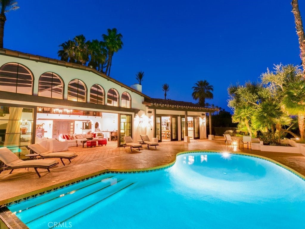 This fully furnished Spanish Revival estate, recently renovated, sits on two private acres in the heart of Indian Wells, offering a serene retreat with breathtaking mountain views. Designed with impeccable craftsmanship, the home features four en suite bedrooms, an open loft lounge that doubles as a bedroom, five full baths, and a guest powder room. The expansive living and dining areas seamlessly flow into a gourmet kitchen, complete with a walk-in pantry and ice makers—a chef’s dream. Each fully furnished bedroom suite showcases reclaimed wood flooring, custom hand-painted tile bathrooms, and sheer and blackout curtains for ultimate comfort. The outdoor oasis includes a private tennis and pickleball court, a resort-style pool and spa, and lush fruit orchards with a treehouse. A Sonos music system enhances both indoor and outdoor spaces, while entertainment options like basketball, bocce, croquet, ping pong, and foosball ensure endless enjoyment. The one-acre backyard barranca offers a private stretch of grass, perfect for leisure or recreation. Ideally located just 2.5 miles from the Indian Wells Tennis Garden, 8 miles from Coachella, and a short drive to El Paseo’s luxury shopping and dining, this fully furnished estate is a rare blend of privacy, elegance, and resort-style living.