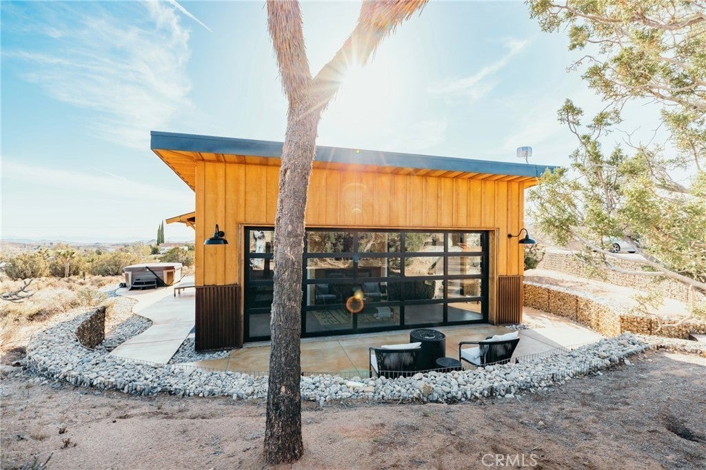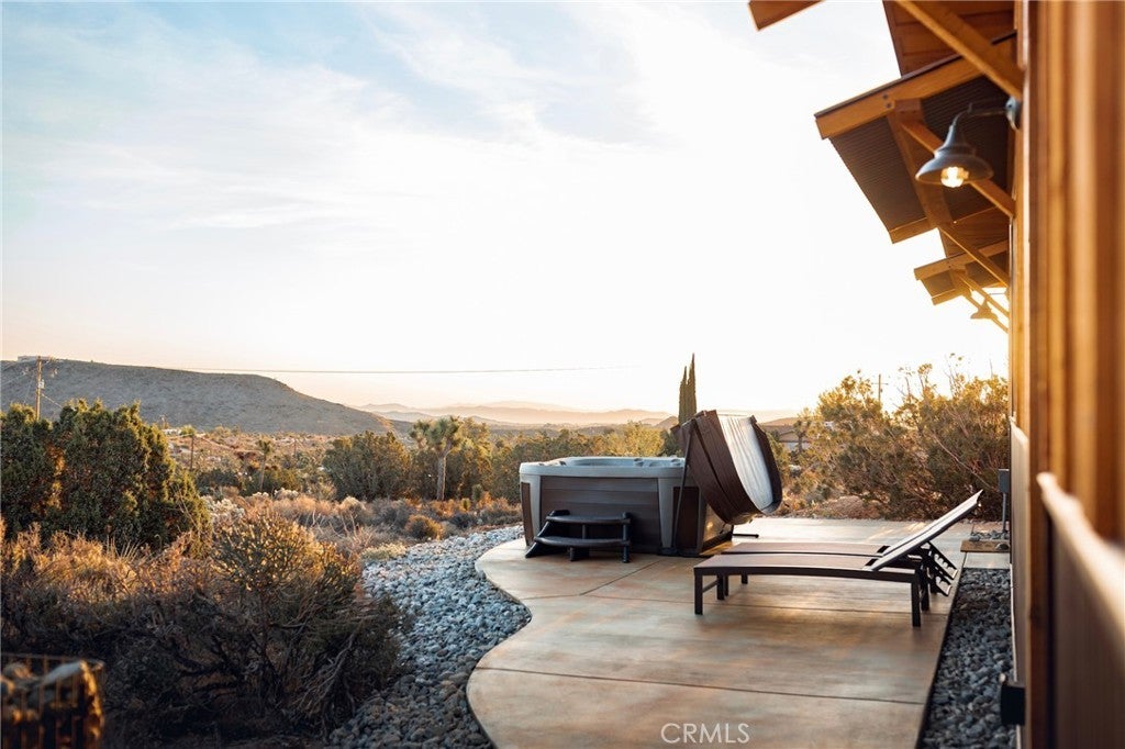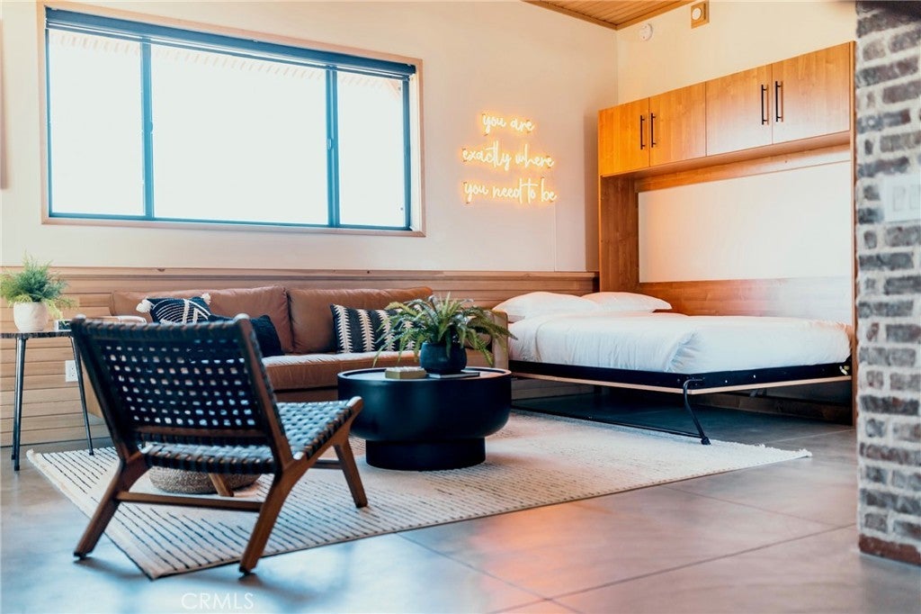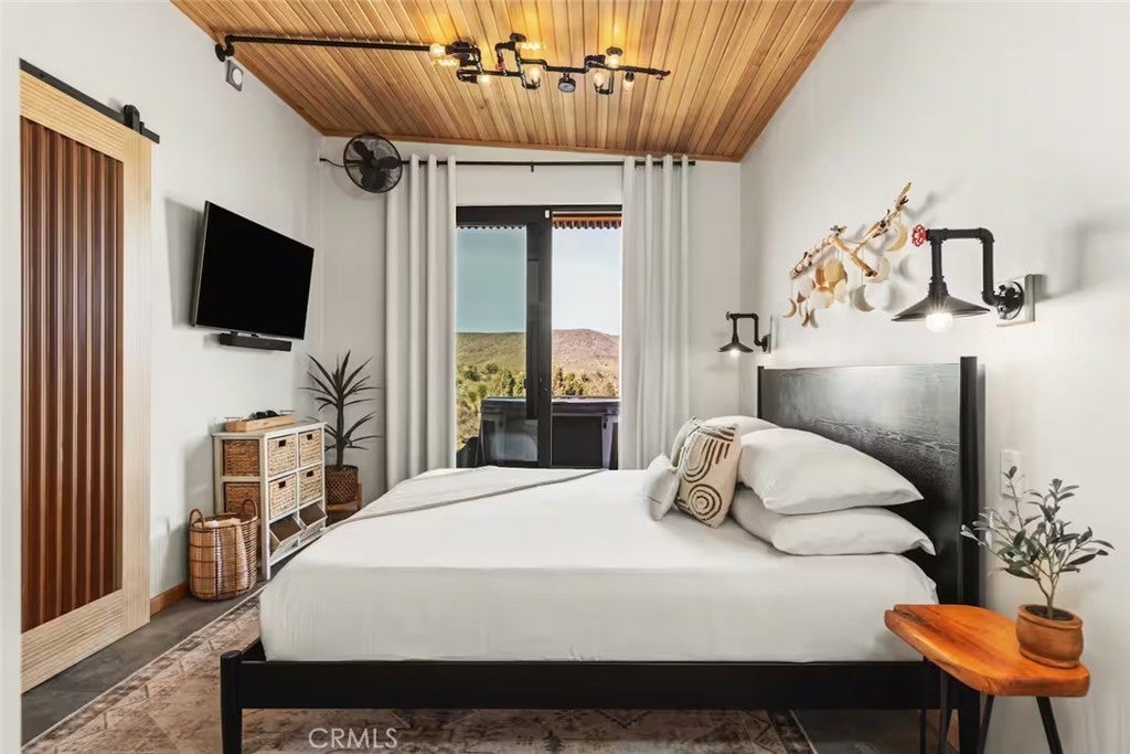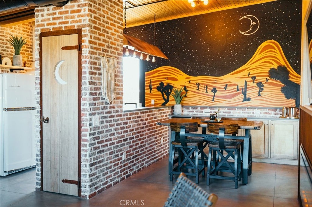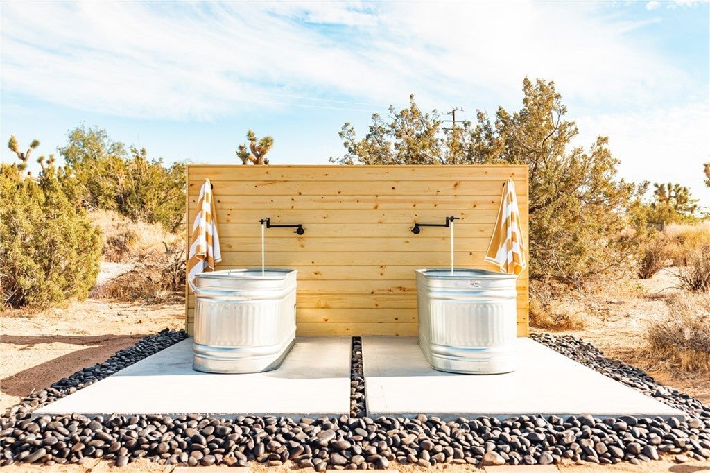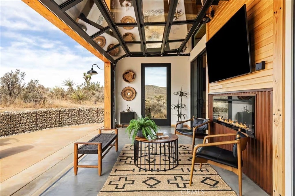 The Alchemist Retreat is a fully custom-designed modern desert cabin located in Yucca Valley, just minutes from Joshua Tree National Park. Built in 2021 and completed in 2022, this architectural gem blends rustic charm with high-end finishes and incredible panoramic desert views that can be enjoyed from nearly every corner of the property. Crafted with intentional detail, the home features 1x4 wood-paneled ceilings and walls, hand-laid brick, matte concrete floors, exposed ducting, custom handmade cabinetry and shelving, and a striking floor-to-ceiling mural. The open concept layout includes a kitchen outfitted with Big Chill retro appliances, a dining area with custom overhead lighting and beverage cooler, and a cozy living room with a queen-sized BredaBeds Murphy bed, 65” Samsung Smart TV, electric fireplace, ceiling fan, and Sonos surround sound. The attached sunroom expands the living space with an electric garage door, additional Smart TV, fireplace, fan, and Sonos system. It’s perfect for seamless indoor and outdoor living with a view. The bedroom features a 50” Smart TV, ceiling fan, Sonos speakers, and direct access to a private hot tub patio. The spa-style bathroom includes a double vanity, walk-in shower, and stacked washer and dryer. Outdoor spaces are designed for relaxation and entertaining, including a covered patio with electrical setup, a cowboy tub deck with waterline and shutoff valve, a sunroom-adjacent patio, and a private hot tub patio. Each area is positioned to take full advantage of expansive desert vistas and stargazing opportunities. Additional upgrades include paid solar panels and a Tesla charger. This home is not only a designer showpiece but also a proven income generator, consistently producing over $100,000 annually with over 300 five-star reviews on Airbnb. Ranked in the top 1% of homes in the Joshua Tree and Yucca Valley area, The Alchemist Retreat offers a rare opportunity to own a high-performing short-term rental or a luxurious desert escape.