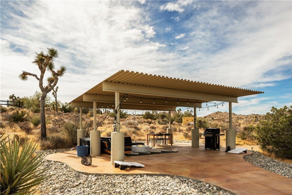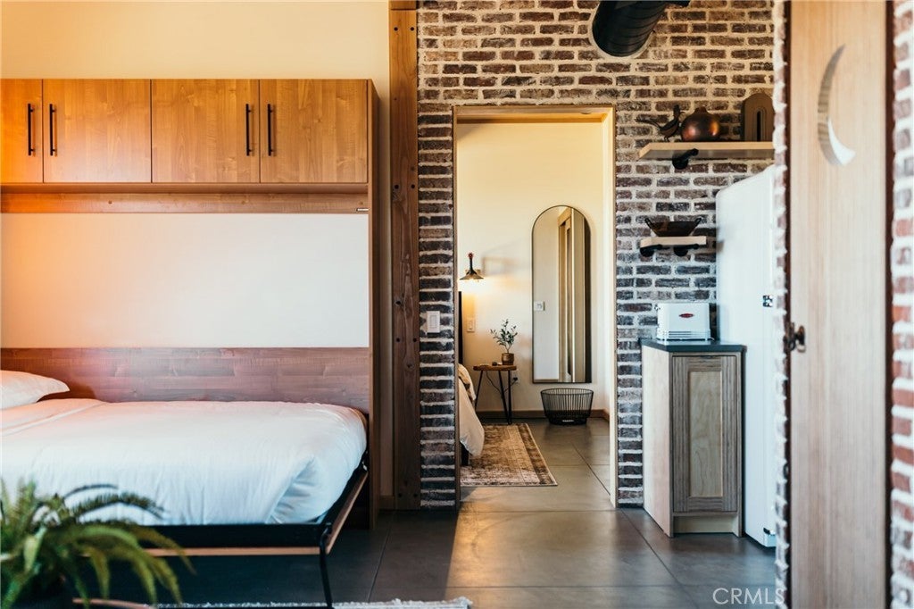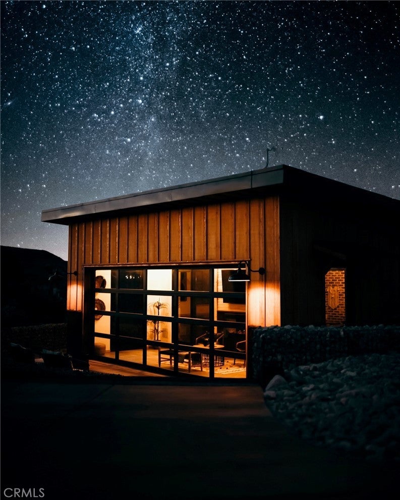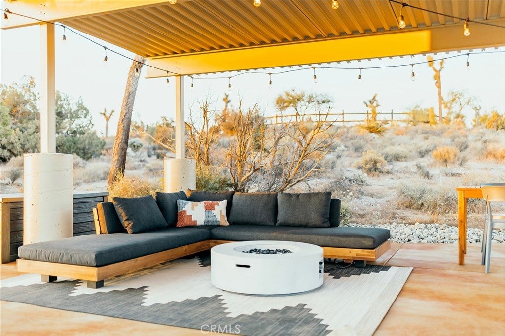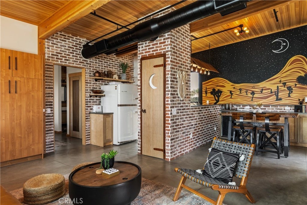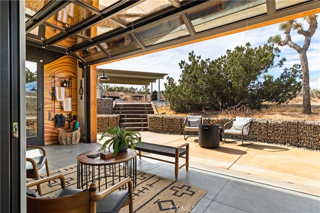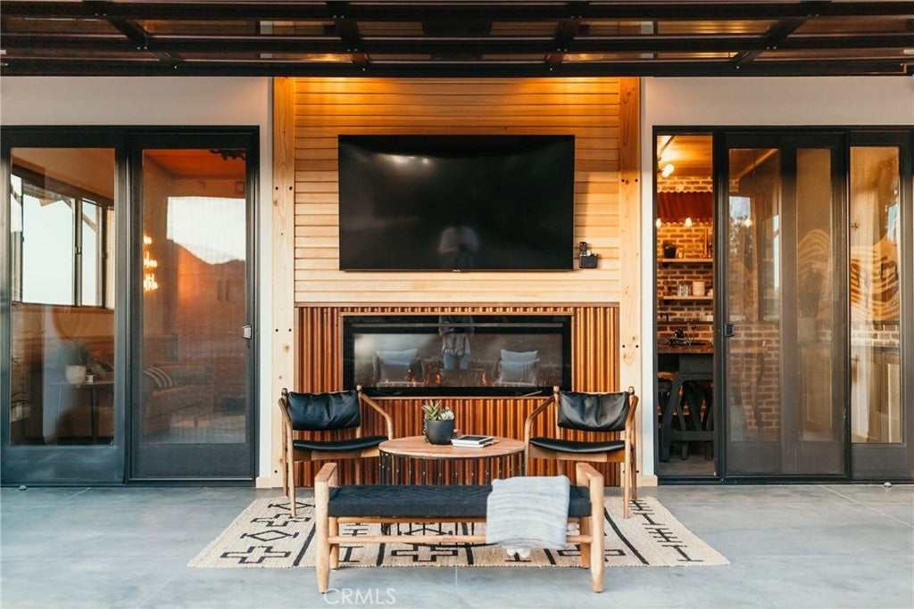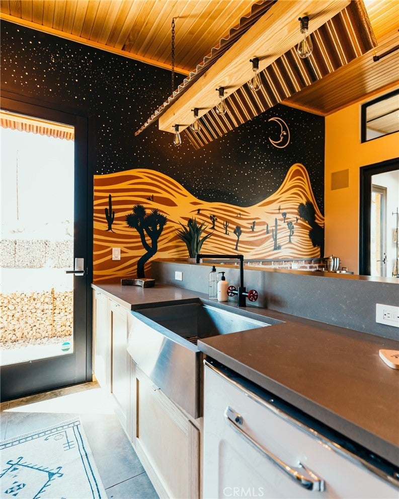 The Alchemist Retreat is a fully custom-designed modern desert cabin located in Yucca Valley, just minutes from Joshua Tree National Park. Built in 2021 and completed in 2022, this architectural gem blends rustic charm with high-end finishes and incredible panoramic desert views that can be enjoyed from nearly every corner of the property. Crafted with intentional detail, the home features 1x4 wood-paneled ceilings and walls, hand-laid brick, matte concrete floors, exposed ducting, custom handmade cabinetry and shelving, and a striking floor-to-ceiling mural. The open concept layout includes a kitchen outfitted with Big Chill retro appliances, a dining area with custom overhead lighting and beverage cooler, and a cozy living room with a queen-sized BredaBeds Murphy bed, 65” Samsung Smart TV, electric fireplace, ceiling fan, and Sonos surround sound. The attached sunroom expands the living space with an electric garage door, additional Smart TV, fireplace, fan, and Sonos system. It’s perfect for seamless indoor and outdoor living with a view. The bedroom features a 50” Smart TV, ceiling fan, Sonos speakers, and direct access to a private hot tub patio. The spa-style bathroom includes a double vanity, walk-in shower, and stacked washer and dryer. Outdoor spaces are designed for relaxation and entertaining, including a covered patio with electrical setup, a cowboy tub deck with waterline and shutoff valve, a sunroom-adjacent patio, and a private hot tub patio. Each area is positioned to take full advantage of expansive desert vistas and stargazing opportunities. Additional upgrades include paid solar panels and a Tesla charger. This home is not only a designer showpiece but also a proven income generator, consistently producing over $100,000 annually with over 300 five-star reviews on Airbnb. Ranked in the top 1% of homes in the Joshua Tree and Yucca Valley area, The Alchemist Retreat offers a rare opportunity to own a high-performing short-term rental or a luxurious desert escape.