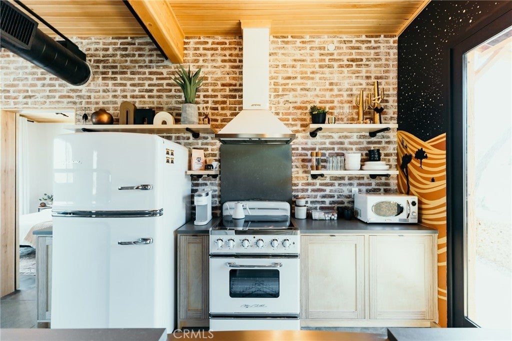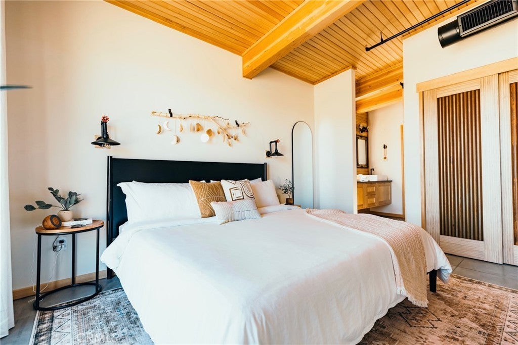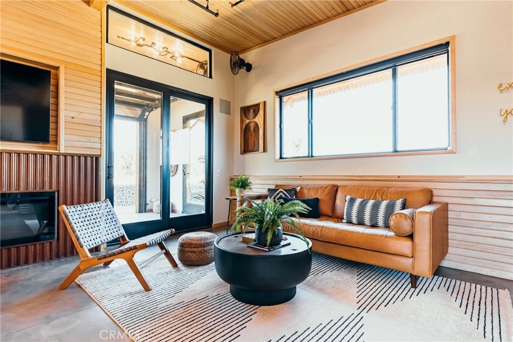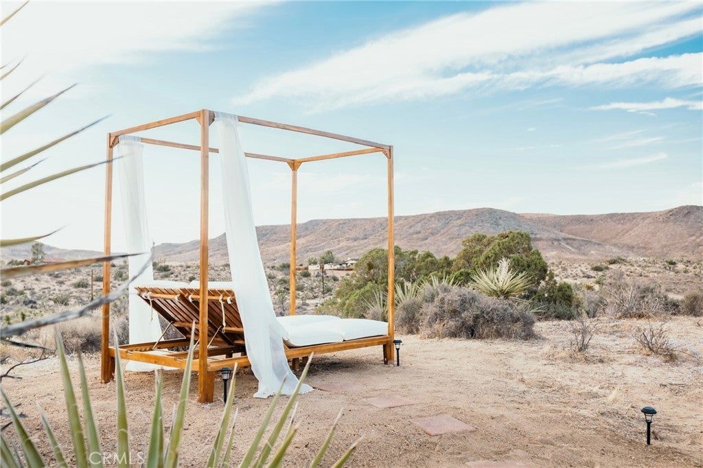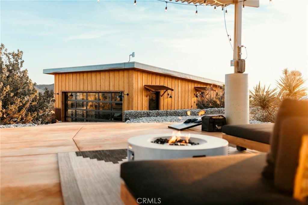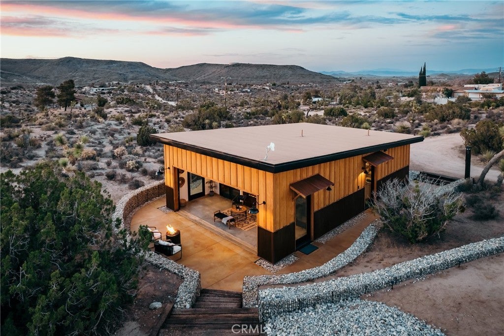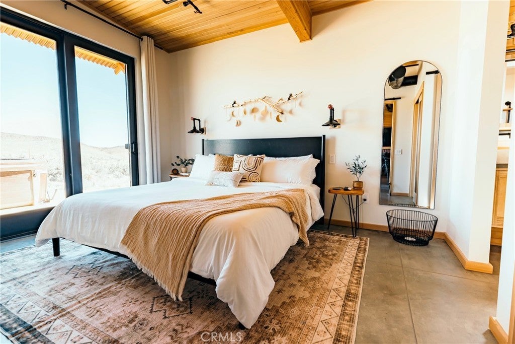 The Alchemist Retreat is a fully custom-designed modern desert cabin located in Yucca Valley, just minutes from Joshua Tree National Park. Built in 2021 and completed in 2022, this architectural gem blends rustic charm with high-end finishes and incredible panoramic desert views that can be enjoyed from nearly every corner of the property. Crafted with intentional detail, the home features 1x4 wood-paneled ceilings and walls, hand-laid brick, matte concrete floors, exposed ducting, custom handmade cabinetry and shelving, and a striking floor-to-ceiling mural. The open concept layout includes a kitchen outfitted with Big Chill retro appliances, a dining area with custom overhead lighting and beverage cooler, and a cozy living room with a queen-sized BredaBeds Murphy bed, 65” Samsung Smart TV, electric fireplace, ceiling fan, and Sonos surround sound. The attached sunroom expands the living space with an electric garage door, additional Smart TV, fireplace, fan, and Sonos system. It’s perfect for seamless indoor and outdoor living with a view. The bedroom features a 50” Smart TV, ceiling fan, Sonos speakers, and direct access to a private hot tub patio. The spa-style bathroom includes a double vanity, walk-in shower, and stacked washer and dryer. Outdoor spaces are designed for relaxation and entertaining, including a covered patio with electrical setup, a cowboy tub deck with waterline and shutoff valve, a sunroom-adjacent patio, and a private hot tub patio. Each area is positioned to take full advantage of expansive desert vistas and stargazing opportunities. Additional upgrades include paid solar panels and a Tesla charger. This home is not only a designer showpiece but also a proven income generator, consistently producing over $100,000 annually with over 300 five-star reviews on Airbnb. Ranked in the top 1% of homes in the Joshua Tree and Yucca Valley area, The Alchemist Retreat offers a rare opportunity to own a high-performing short-term rental or a luxurious desert escape.