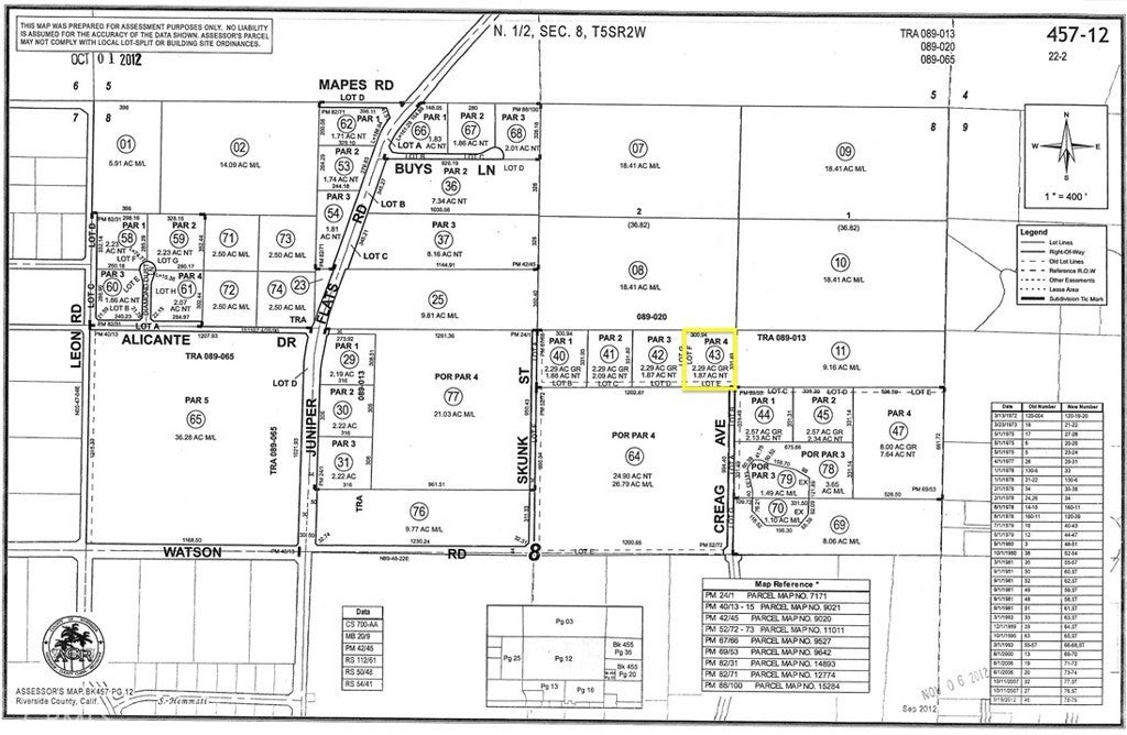 Discover 2.29± acres in the growing community of Homeland, in Southwestern Riverside County, CA—an ideal location to build your custom home, horse ranch, family compound, or private retreat. This spacious parcel features 300’± of frontage on Skunk St. easement and 300’± along the Easterly boundary, offering plenty of space for homes, barns, garages, stables, sheds, gardens, orchards, and vineyards. Located in a propane and septic tank area. Utilities are provided by SCE and EMWD. Water is approximately 700'+- South on Creag Avenue on the Southwestern corner of parcel -078. Sewer is approximately 2,500'+- south on Creag Ave. With NO HOA, you can bring your RV, camper, trailer, or 5th wheel and start enjoying the land immediately. Plus, bring all your animals too! Explore the surrounding hills, ATV-friendly roads, native habitat, and stunning rock outcroppings, all while being just minutes from schools, parks, churches, stores, and essential services. Centrally located in Riverside County, this property provides easy access to I-215, I-15, Hwy 74, Hwy 79, and the 10, 60 & 91 freeways, making commuting to Los Angeles, Orange, San Bernardino, and San Diego Counties effortless. With nearby shopping outlets, casinos, lakes, mountains, and deserts, this land offers endless recreational and investment potential. OWNER MAY CARRY!