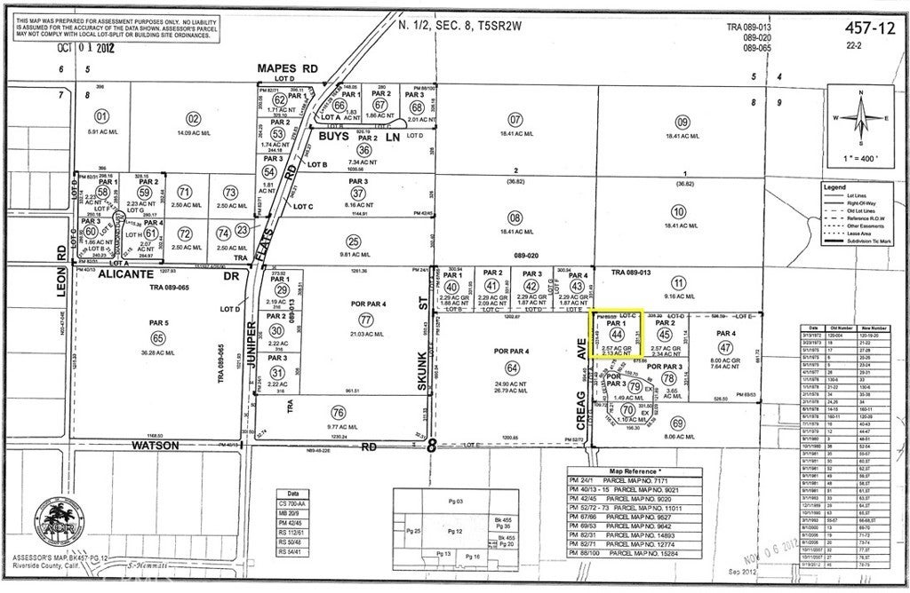 Discover 2.67± acres of country land in Homeland, a growing community in Southwestern Riverside County, CA. This corner parcel offers 331’± frontage on Creag and 331’± on all other boundaries, providing ample space to build your custom home, horse ranch, family compound, or private retreat. This is propane and septic tank area. Area serviced by SCE and EMWD. Water is on the Southwest corner of adjacent parcel -078, approximately 350'+- South on Creag Ave. With NO HOA, it makes it ideal for bringing your RV, camper, trailer, or 5th wheel while planning your build. Enjoy the natural beauty of rolling terrain, native shrubs, and stunning rock outcroppings, perfect for ATV adventures, hiking, and outdoor exploration. There's plenty of room for barns, garages, stables, sheds, patios, gardens, orchards, and vineyards, allowing you to create the ultimate rural escape. Conveniently located minutes from schools, parks, churches, stores, and essential services, this centrally positioned lot provides easy access to I-215, I-15, Hwy 74, Hwy 79, and the 10, 60 & 91 freeways, ensuring a smooth commute to Los Angeles, Orange, San Bernardino, and San Diego Counties. Close to shopping outlets, casinos, lakes, mountains, and desert recreation, this property offers both lifestyle and investment potential. OWNER MAY CARRY!