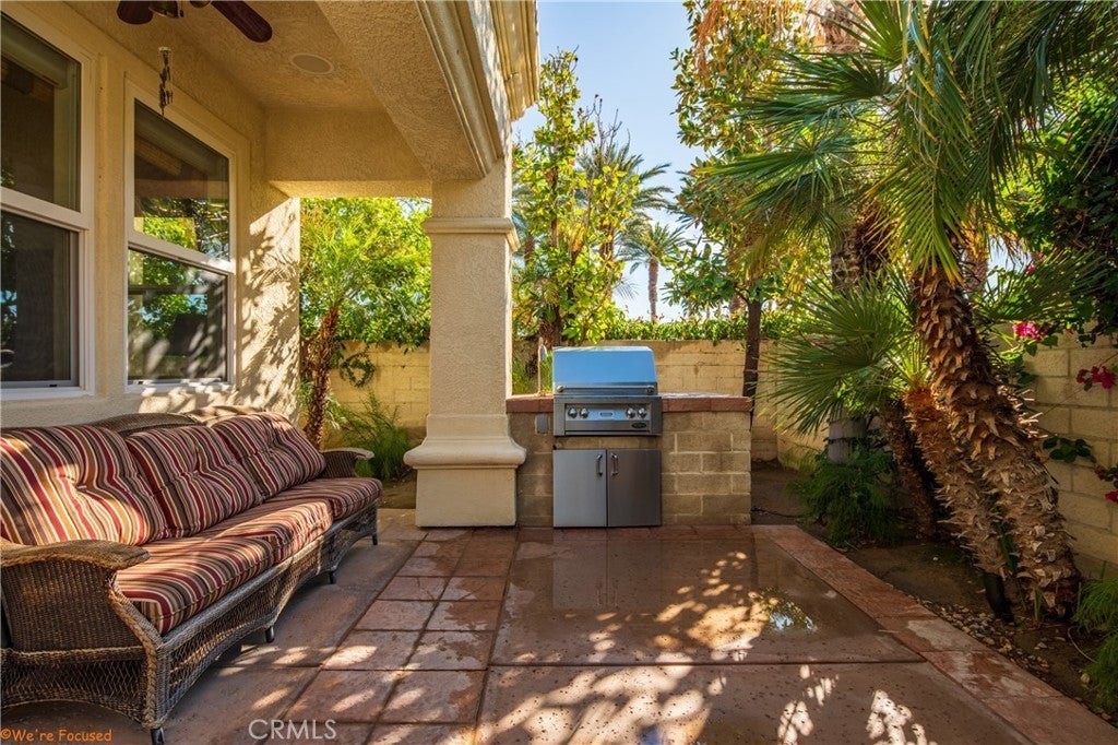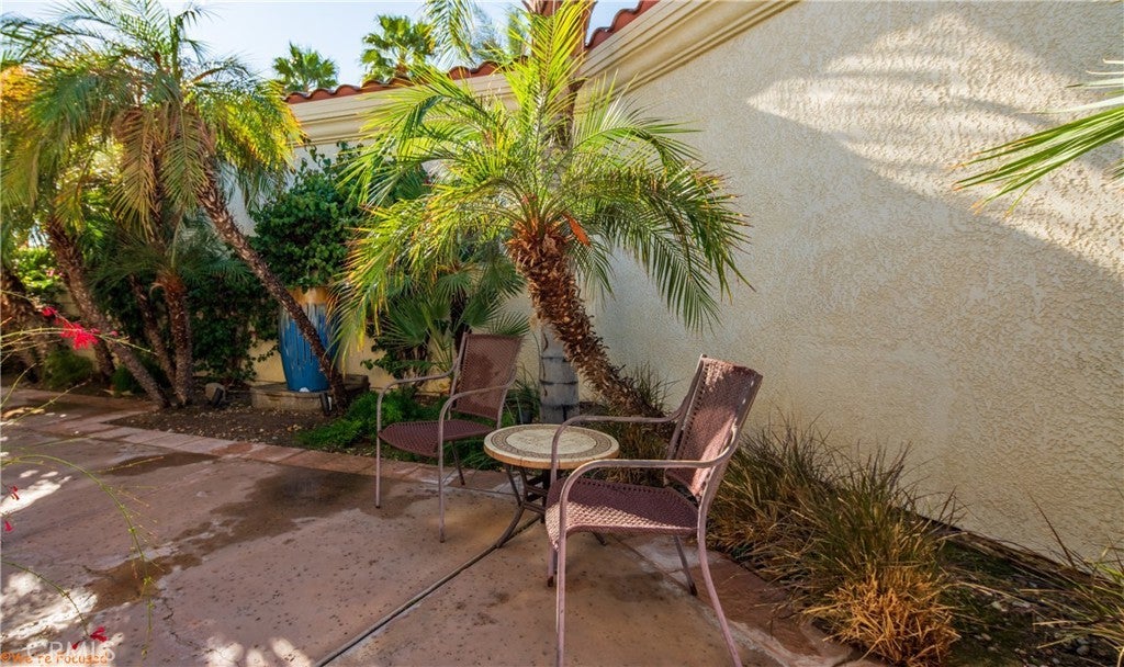 Welcome to your dream home in the heart of the highly sought-after Puerta Azul community of La Quinta! This charming 2-bedroom, 2-bathroom home offers a perfect blend of comfort, style, amenities and location. The open-concept living space is designed for modern living with an abundance of natural light, soaring 12 foot coffered ceilings, and contemporary finishes throughout. Recent upgrades include a brand new HVAC unit, updated bathroom decor and a new irrigation controller. The spacious kitchen is a chef’s delight, which opens up directly into the living and dining areas, creating an inviting atmosphere, ideal for both relaxed living and entertaining guests. The generously sized primary bedroom suite boasts a private en-suite bathroom with dual sinks, a soaking tub/separate shower and large walk-in closet. The second bedroom offers plenty of space for guests or a home office, with easy access to the second bathroom. The laundry area is also conveniently located within the home. Step outside to your private patio, perfect for enjoying the beautiful desert weather, with lush landscaping, a built-in BBQ grill area, tranquil water features and a serene atmosphere that complements the home’s relaxing vibe. The back yard offers total privacy, completely out of any neighboring units view. The Puerta Azul community is renowned for its resort-like amenities, including a sparkling pool and spa, fitness center, Tennis Court and walking trails, all just a stone's throw away. This particular unit is perfectly located, within extremely close proximity to the clubhouse, pool, and other amenities. Puerta Azul is also just one of a few communities in La Quinta where short-Term rentals are permissible. La Quinta, known for its picturesque views of the Santa Rosa Mountains and vibrant lifestyle, and you’ll be just minutes from world-class golf courses, shopping, dining, and more. Don’t miss this opportunity to live in one of the most coveted communities in the Coachella Valley. Schedule your private tour today!
