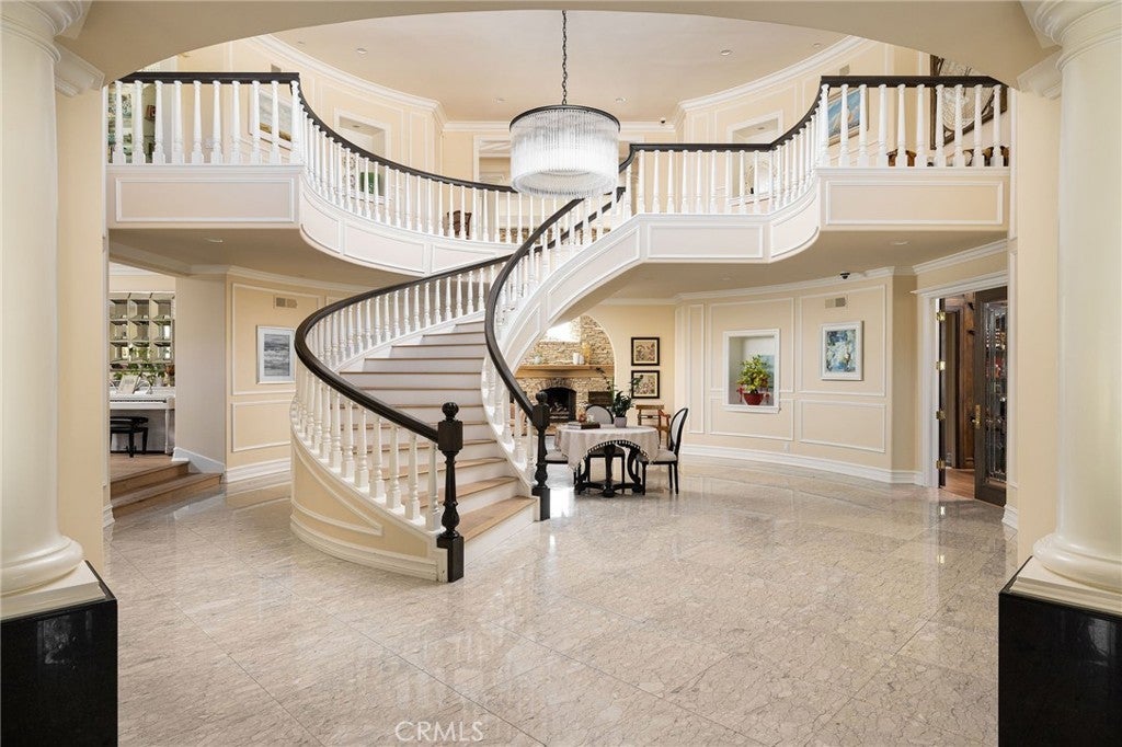 Welcome to 31632 Trigo Trail, an extraordinary 9,500sqft, 7 Bedrooms/7Bathrooms estate nestled on 2.2 acres of pristine land within the exclusive Los Ranchos Estates enclave, part of the highly sought-after, guard-gated community of Coto de Caza. Offering the pinnacle of privacy and elegance, this magnificent property is secured behind its own private gate. As you approach, a beautifully manicured front yard and graceful circular driveway guide you to a stately porte-cochère, setting the tone for the opulence that awaits within. Step through the grand entrance into an impressive foyer featuring a sweeping staircase bathed in natural light, creating a breathtaking first impression. The expansive formal sitting room is designed for sophisticated entertaining, showcasing rich wood floors, a striking floor-to-ceiling fireplace, exquisite designer chandeliers, and a stunning entertainment bar. The gourmet chef’s kitchen offers a generous center island with bar seating, premium stainless steel appliances, and panoramic views of the lush grounds and sparkling pool make this kitchen a masterpiece of style and functionality. Adjacent to the kitchen, a charming breakfast nook accented by a cozy fireplace offers a relaxed dining experience, while a connecting room enhances the home’s open and airy ambiance. Conveniently located on the main level, the luxurious primary suite exudes tranquility and grandeur. Wood floors, a warming fireplace, and picturesque views of the estate’s lush landscape create a true retreat. The spa-like primary bathroom features dual vanities, a dedicated makeup area, a spacious walk-in shower, and a soaking tub. Also on the first level you will find an elegant office detailed with woodwork, coffered ceilings, custom built-ins, wood flooring, and its own fireplace. Upstairs, all secondary bedrooms are generously sized, each boasting private balconies with breathtaking views of the surrounding hillsides and mountains. This level also offers a versatile bonus room and a refined library, perfect for relaxation or study. The estate’s outdoor oasis is equally impressive, featuring a private pool and spa, a welcoming outdoor room complete with a fireplace and heaters for year-round enjoyment, a sprawling grass area, a bocce ball court, and so much more—offering endless possibilities for recreation and entertaining. Furnishings are optional. 31632 Trigo Trail offers the finest luxury living Coto de Caza has to offer!