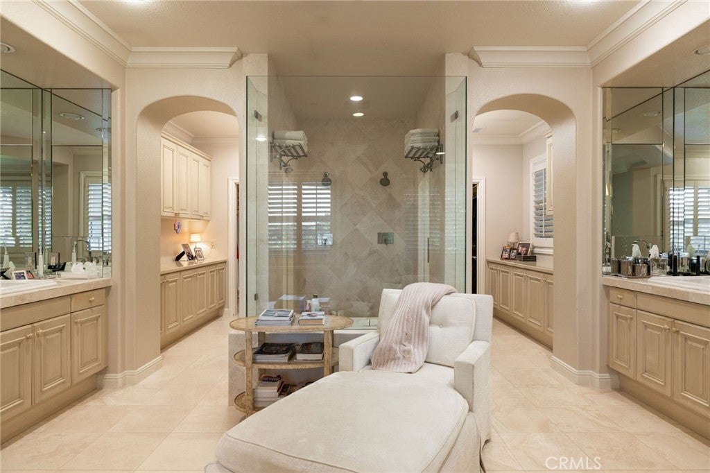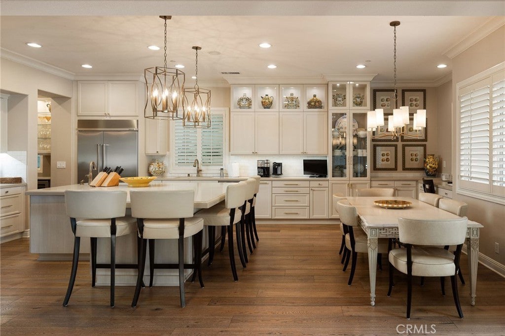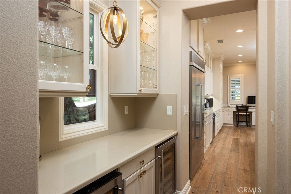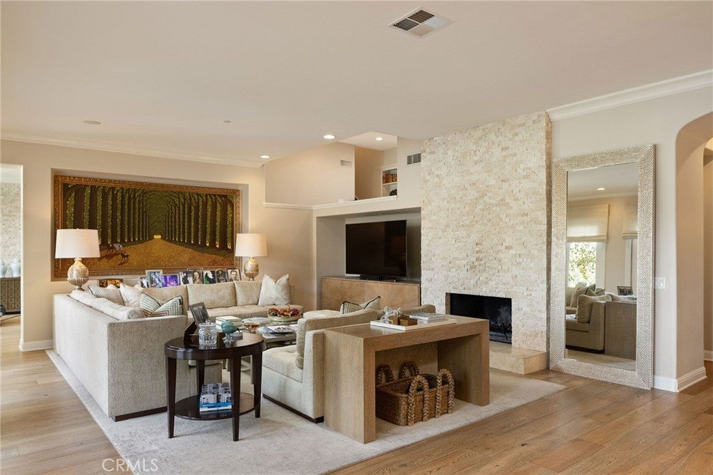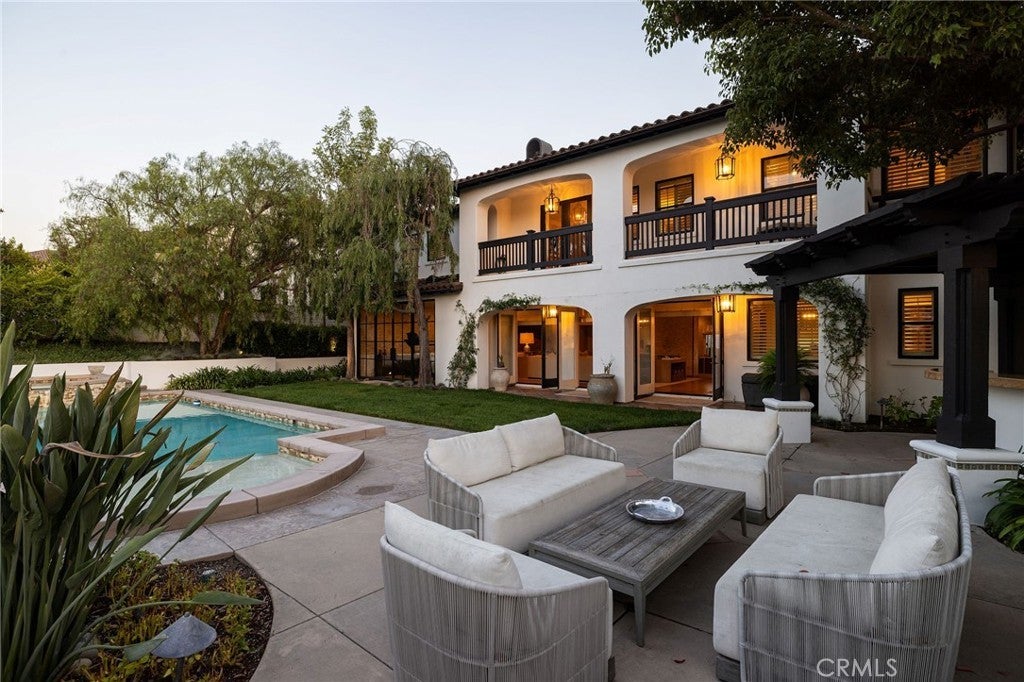 Tucked away on a private, expansive lot within the coveted gated community of San Marino in Coto de Caza, this remarkable six-bedroom residence blends timeless sophistication with modern luxury, offering panoramic vistas and a serene ambiance. From arrival, refinement defines each space. The formal living room, anchored by a grand fireplace and framed by French doors to a tranquil courtyard, sets the tone for the home’s thoughtful design and indoor-outdoor flow. Adjacent is a beautifully appointed formal dining room, perfect for entertaining. At the heart lies a reimagined gourmet kitchen with professional-grade appliances, an expansive island, cozy breakfast nook, and state-of-the-art butler’s pantry with beverage and wine refrigerators. The family room boasts a dramatic stacked-stone fireplace, integrated surround sound, and access to the breathtaking outdoor entertaining area. The main level also features a sophisticated executive office with custom built-ins and a generous guest suite with private bath and French steel doors to the garden. A spacious 3-car garage with built-in storage adds convenience. Ascend a private staircase to the opulent primary suite with fireplace, sitting room, home gym, and a sweeping balcony framing uninterrupted Saddleback Mountain views. The spa-inspired bath offers artisan tile, dual vanities, jetted tub, oversized walk-in closet, and dual-entry walk-in shower. The upper level includes three additional bedrooms, a versatile bonus room with custom cabinetry, and a detached guest casita with ensuite bath and private entrance. Outside, manicured grounds and landscape lighting frame a saltwater pool and spa, covered alfresco dining pavilion with built-in BBQ and bar, and a custom fireplace enclave with built-in seating. Ideally located near award-winning schools, the Coto de Caza Golf & Racquet Club, and scenic trails, this home embodies elevated California living with timeless style and thoughtful detail.