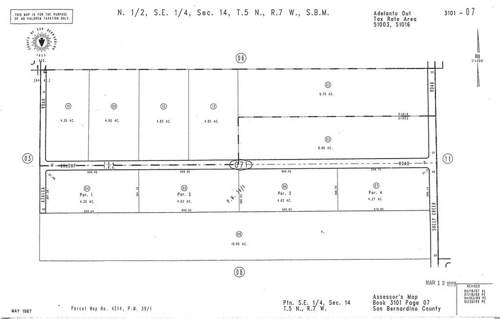 Flat land, 2 parcels together nearly 40 acres. Have you ever thinking of escaping from the busy traffic and people crowd. Building your dream home in the beautiful desert??? Growing fruit trees and plant your favorite vegetables, build a greenhouse for growing mashrooms, build a horse barns and raise chicken here to pick the fresh layed eggs every morning! By the way, this can be a commercial farm. In the wild desert, you can ulitized your full imagination for nearly 20 Acre of argucultural Land located in Adelanto CA, adjacent to Palmdale blvd, only a few minutes from the phelan's shopping center. Nearby there are neighbors and farm homes. If you have differenct set of plan, This would work too. With conditional use permit, you can build an outdoor playground, camp ground, mobile homepark, Libuary, or senior care facility, Commercial entertainment center. public and private schools, universities, rural sports facility, spcialized trainning facilities. Water Well #15 is locaetd in the back of the property, about 100 feet. eletrical pulls are on the back of the street. Please be advised have your agent to check out the possible use from the County planning. Direction: From Irvine, 91 E, Then 15 North to Barstow, to CA 138 W to San Bernadino, then take exit Sheep Creek Road, pass the palmdale traffic light. The property is on the left side. The property starting point is by the shed house like. from there all the way back to the well #15 trade mark.