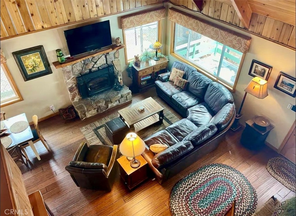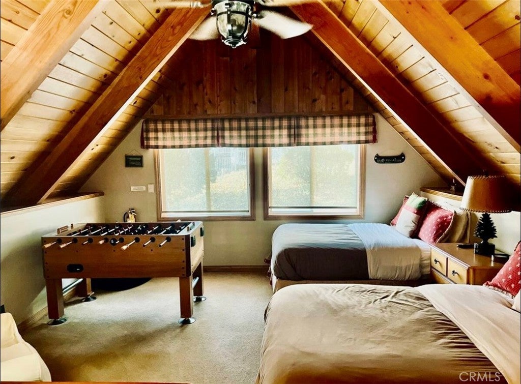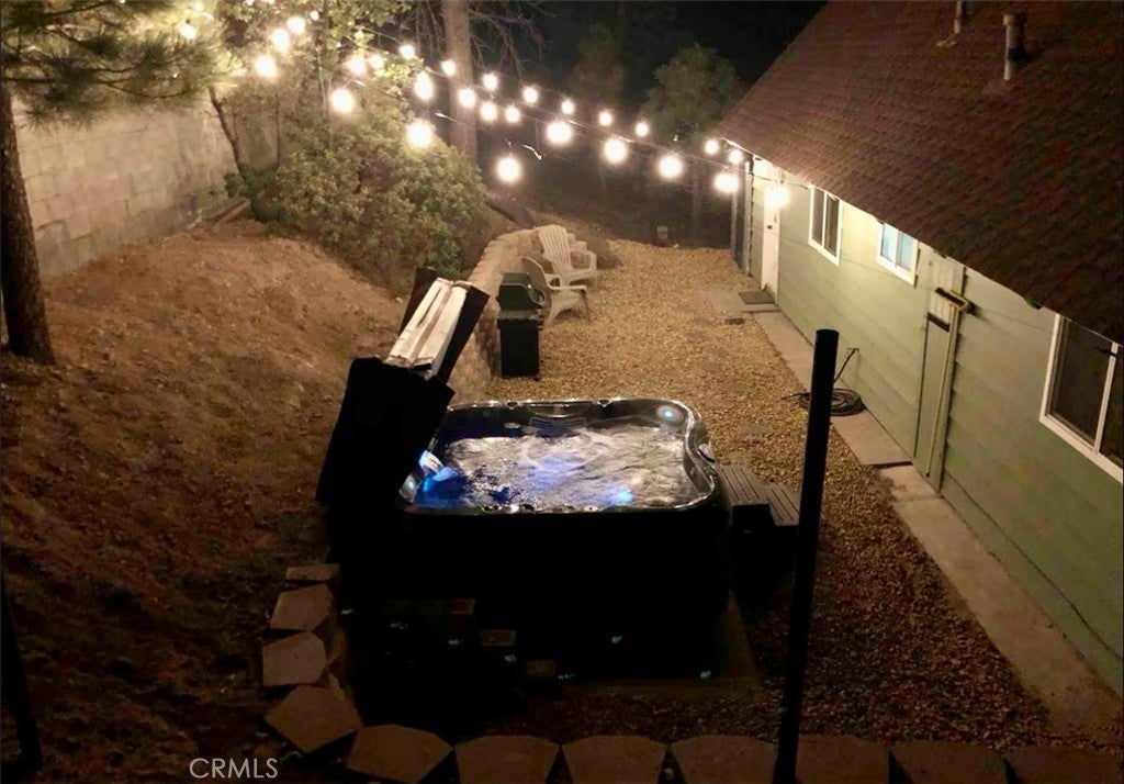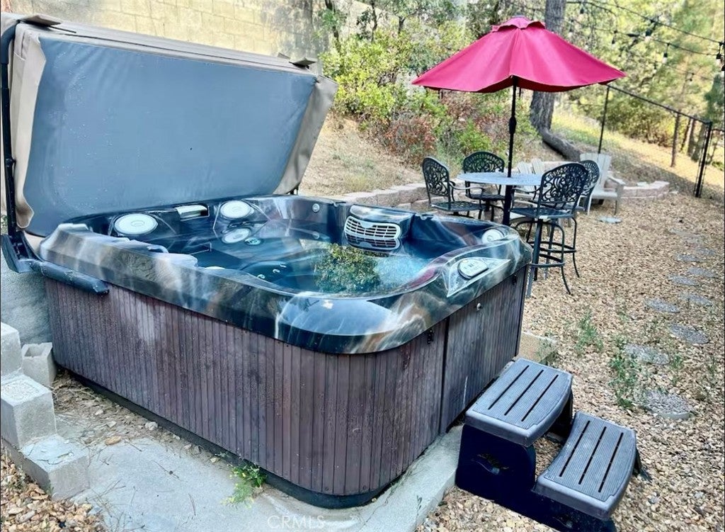 Charming Mountain-Modern Cabin in Big Bear Lake This beautifully maintained cabin is a tasteful blend of mountain charm and modern comfort. The open-concept living area features vaulted ceilings, wood flooring, a ceiling fan, and large windows that fill the space with natural light. Cozy up by the wood-burning fireplace on chilly mountain nights. The kitchen is well-equipped and functional, with ample counter space and windows that bring in the serene outdoors. The home includes two comfortable bedrooms and one nicely updated bathroom with a tub on the main level. Upstairs, the open loft offers additional sleeping and recreation space with two full beds, a TV, and a foosball table — perfect guests or office. Outside, you’ll find an inviting front porch with seating and a cheerful red door that adds a pop of personality. The spacious driveway accommodates 1–3 vehicles with easy access and minimal steps to the entrance. After a day of hiking, skiing, or exploring, unwind under the stars in the luxurious jacuzzi — your mountain retreat awaits.