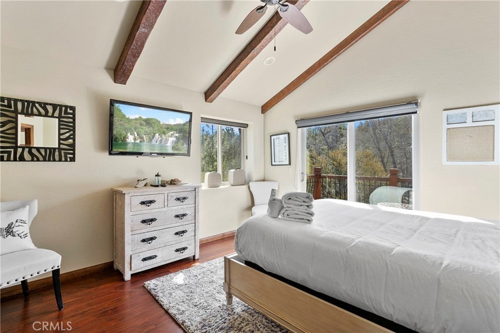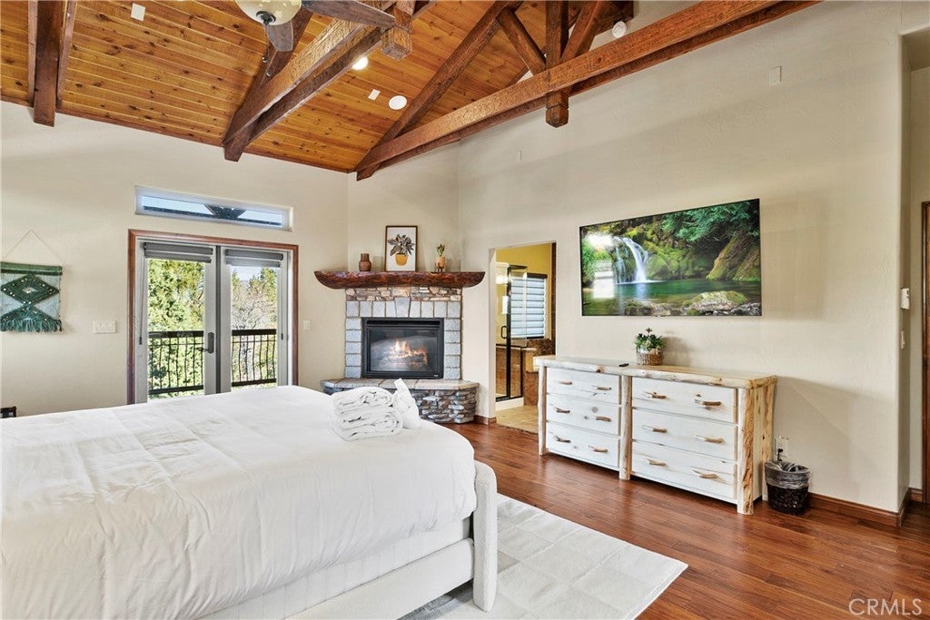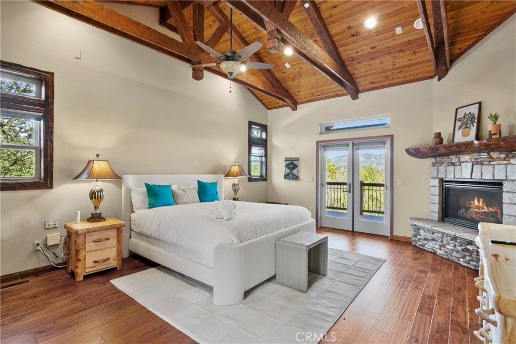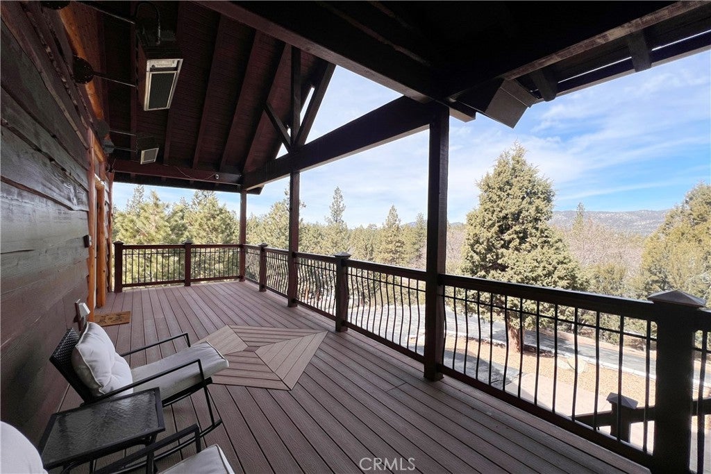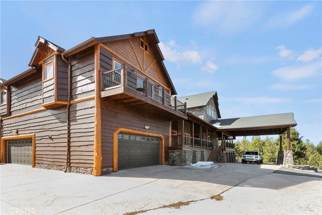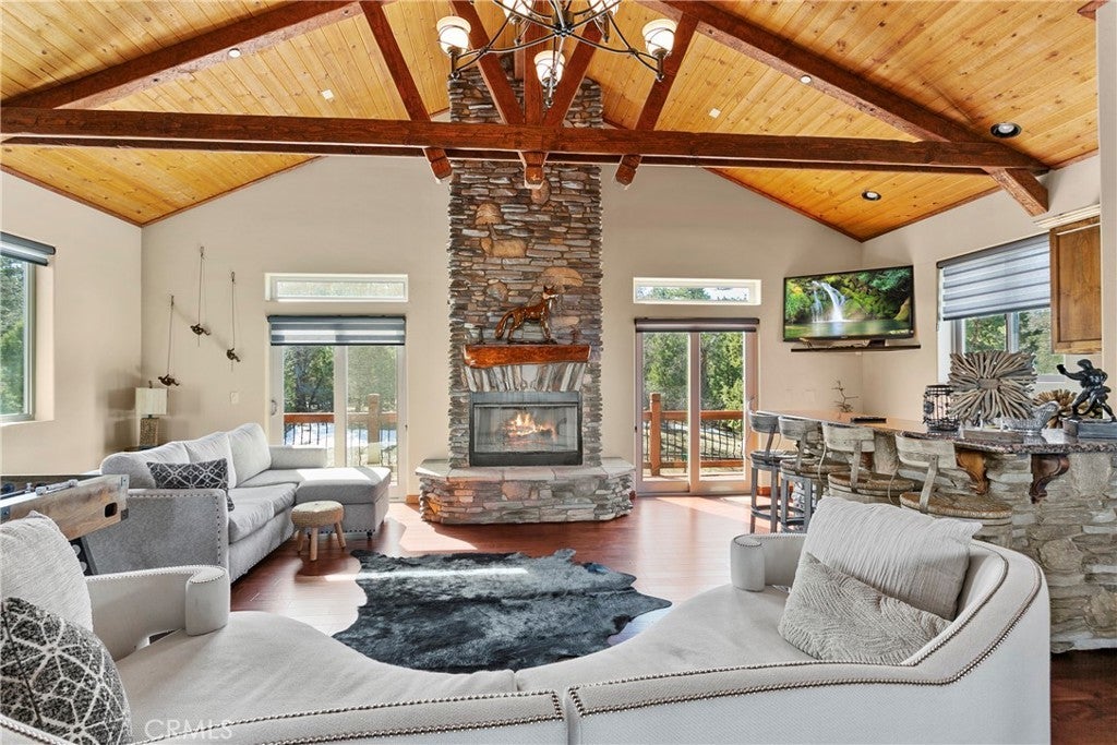 A luxurious 5-bedroom, 6-bath custom mountain estate located in the gated Fox Farm area. Built in 2007, the home spans nearly 5,000 sq ft on a private 1.87-acre lot. Grand entry with soaring wood-beamed cathedral ceilings and slate floor. Open floorplan with multiple living areas, including a family room, formal living, loft/game room with wet bar. Gourmet kitchen: warm wood cabinetry, stainless appliances, granite countertops, breakfast bar, and walk-in pantry. Wine room: temperature-controlled, adjacent to kitchen. Fireplaces (3 total): located in living room, family room, and the master suite, all adorned with stacked-stone finishes. Composite decks at both front and back, accessible from all bedrooms, offering serene forest and mountain views. Large covered front porch and a matching rear deck for entertaining. Four-car attached garage + porte cochère & driveway with gated private drive. Bonus office/nursery off the primary suite, complete with custom dog-run. Temperature-controlled wine room & walk-in pantry for storage convenience. HVAC with central air, whole house humidifier, forced-air heating. Luxury finishes: beamed ceilings, slate/tile/wood flooring, double-pane windows, wet bar. Security system owned. Captivating views of surrounding mountains and forest from multiple vantage points Located in Big Bear’s central Fox Farm area, just minutes from ski slopes, the lake, hiking, and local amenities. Gated entry with private road leading up to property. Offered fully furnished. ZONED SAN BERNARDINO COUNTY - ALMOST 2 ACRES - CAN BUILD ADU - CONTACT COUNTY FOR DETAILS.