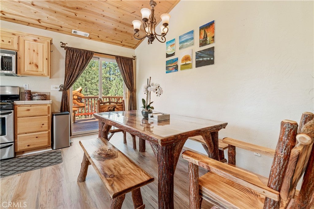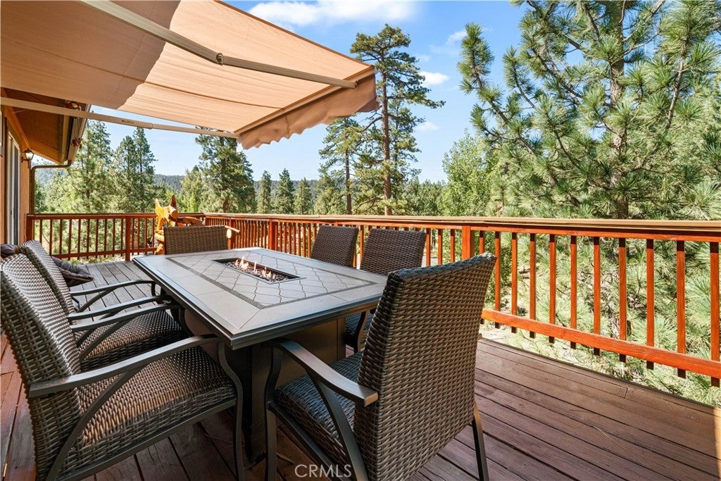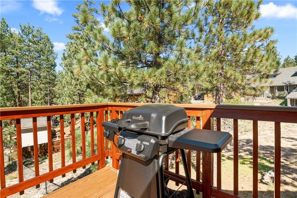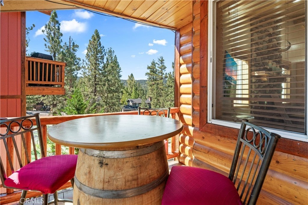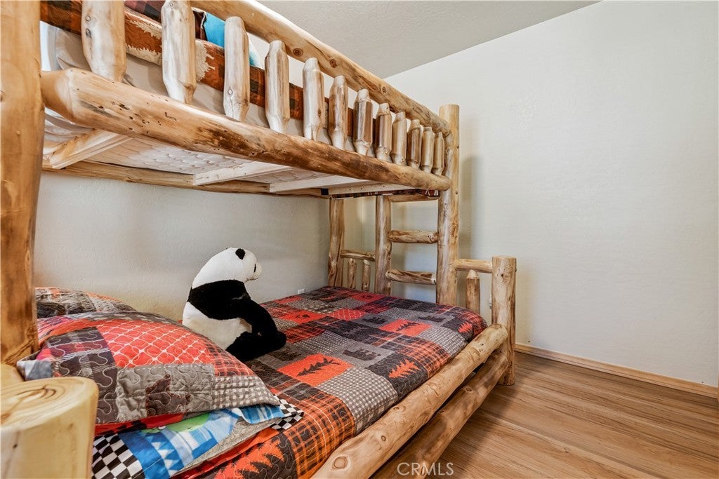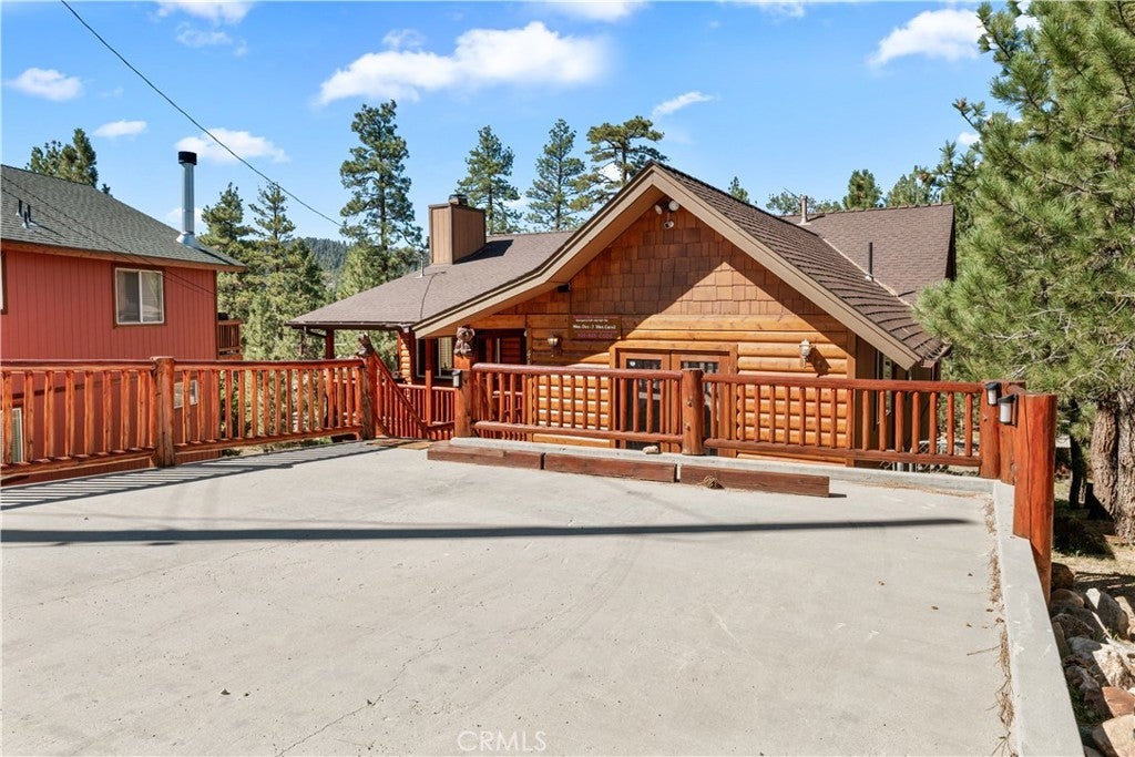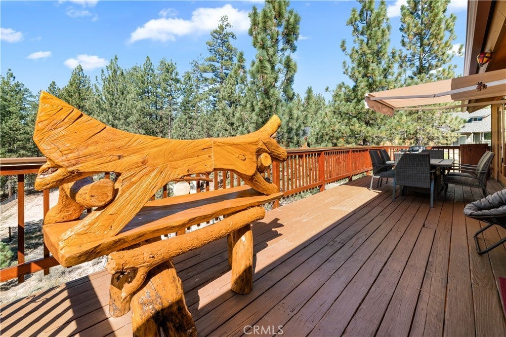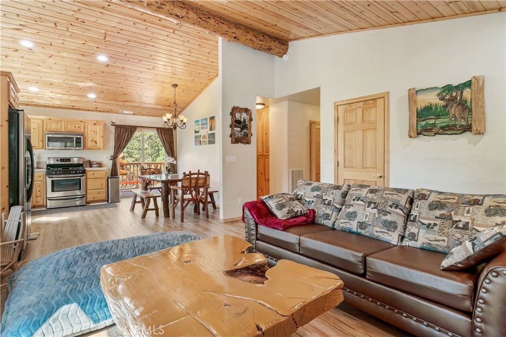 Don’t miss this rare opportunity to own a newer custom-built mountain home in Big Bear Lake! Built in 2004 and beautifully maintained, this 4-bedroom, 3-bath home features soaring vaulted ceilings, exposed timber beams, and beautiful upgraded laminate flooring throughout. The open-concept living room flows seamlessly into the kitchen and dining area, creating a warm and inviting space perfect for entertaining. From the dining area, step out onto a large elevated deck with panoramic, unobstructed views of the surrounding trees and hills. One of the bedrooms is approximately 400 sq ft, complete with an en-suite bath and a private exterior entrance—ideal for guests, short-term rental income, or extended family. Downstairs, a nearly full-size unfinished basement with a separate entrance offers endless potential for customization—think ADU, game room, workshop, or additional living space. In addition to the main living space, the home includes a nearly full-size unfinished basement area with a separate exterior entrance, offering endless possibilities for expansion—ADU, game room, workshop, or additional living space.