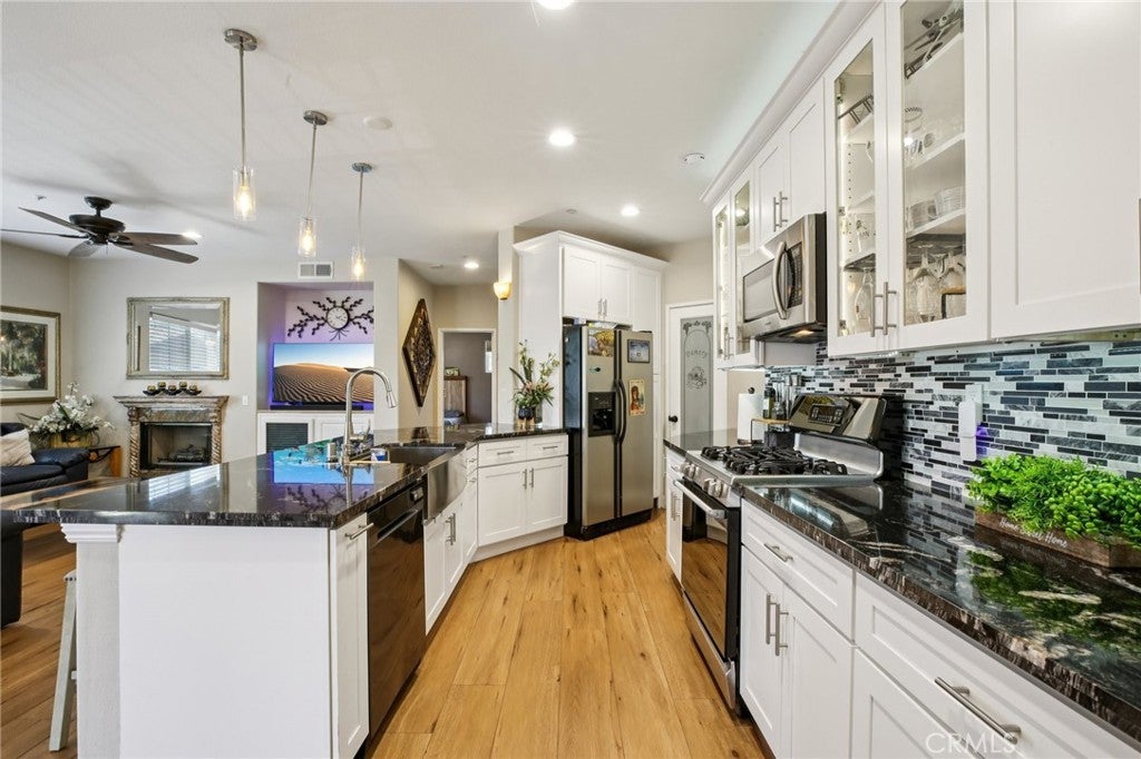 Experience comfort and style in this beautifully remodeled 2-bedroom, 2-bath condo, offering 1,277 sq ft of thoughtfully designed living space. Enjoy cozy evenings by the fireplace and relax on your private balcony, accessible from both the living area and second bedroom—perfect for morning coffee or unwinding at night. The upgraded kitchen delights with granite countertops, mosaic tile backsplash, stainless steel farm sink, a walk-in pantry with etched glass door, stainless steel appliances, and a dedicated laundry room nearby for convenience. High ceilings, recessed lighting, ceiling fans and top-quality wood laminate flooring throughout, including the stairs, add warmth and elegance. Retreat to the spacious primary suite featuring a walk-in closet and dual-sink vanities. Smart living & dining room window blinds. The highly rated schools in the area make this a great choice for your next home. End unit with open viewing with no neighbors across from you giving maximum peace and privacy. Additional highlights include an attached two-car garage with four large overhead storage shelves, a high-end thermostat, a new upgraded Lennox air conditioning unit, a recent roof seal, and a newer water heater. The rafters were recently updated with new foam insulation. This beautiful condo features an expansive 8’ x 15’ balcony with a western view, perfect for enjoying breathtaking sunsets each evening with a natural gas hookup already installed, you’re set for outdoor grilling or cozy evenings. Book your tour today to see all this exceptional condo has to offer!
