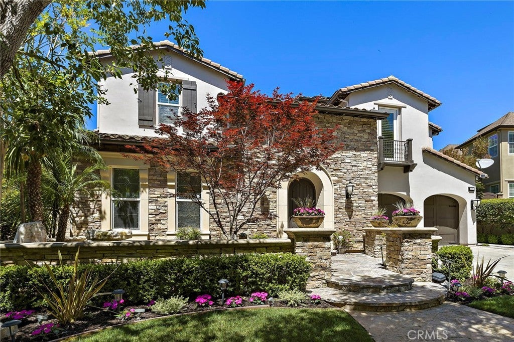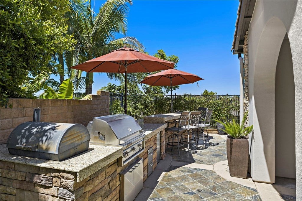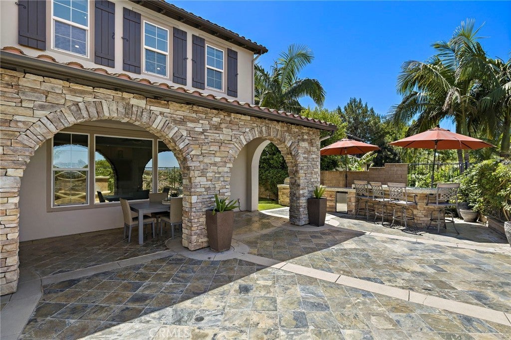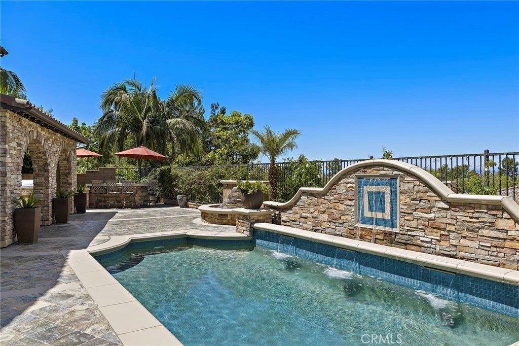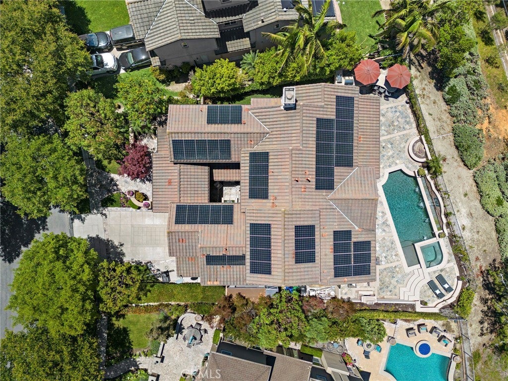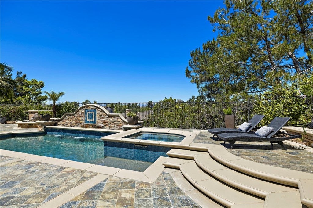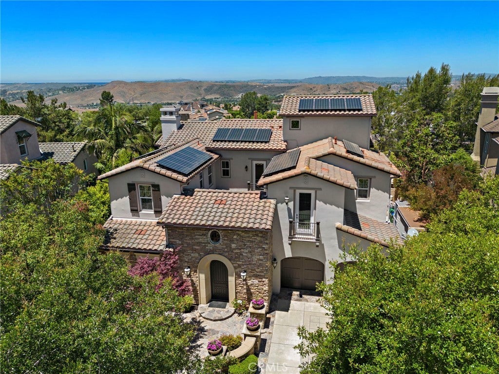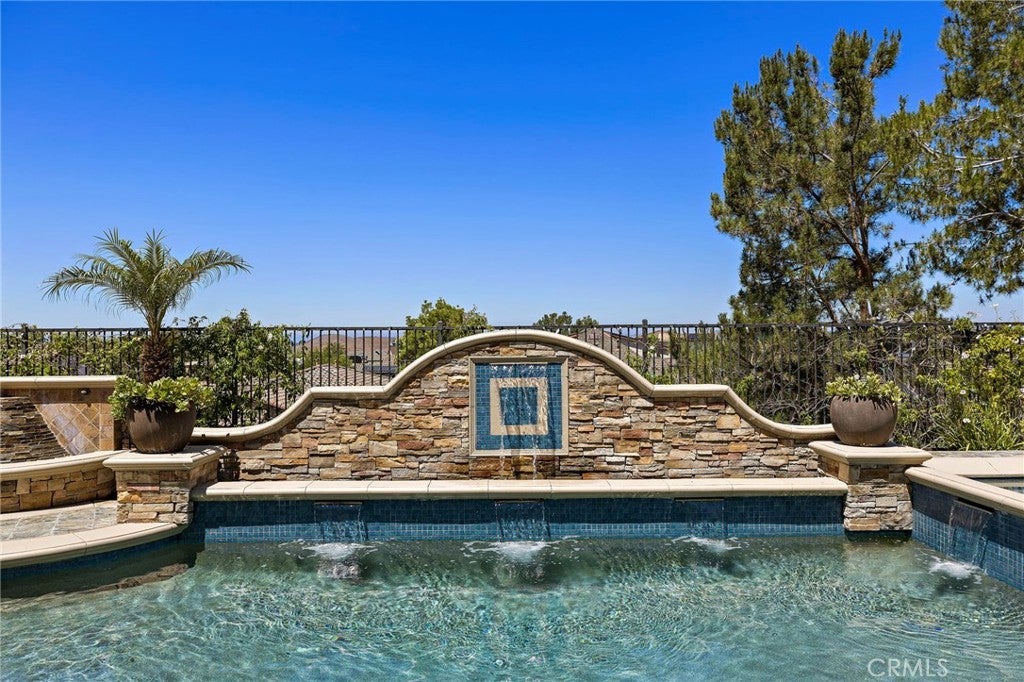 Luxurious Entertainer’s Dream Home with Panoramic Sunset Views! Located on one of the most coveted single-loaded cul-de-sac streets, this custom 5-bedroom, 5.5-bathroom estate spans nearly 5,000 square feet of thoughtfully designed living space on a 9,126 square foot lot. Enjoy the ultimate in privacy, elegance, and functionality with formal and casual living spaces that seamlessly flow indoors and out. Upon entry, you'll be welcomed by a sunlit foyer with lofty ceilings and views to a central courtyard. The heart of the home is the remodeled chef’s kitchen, complete with quartz countertops, Sub-Zero and Thermador appliances, wine fridge, new trash compactor, and custom cabinetry reaching to the ceiling. A spacious walk-in pantry, a custom hood and several picture windows complete this stunning space. Multiple living areas feature newer flooring throughout, custom built-ins, fresh paint inside, crown molding, LED recessed lighting and stunning views. Step outside into an entertainer’s paradise featuring a built-in barbecue island with seating, covered outdoor living space, a custom fireplace, water feature, pool and spa and an expansive side yard w/ synthetic turf— all set against jaw-dropping sunset and canyon views. Additional highlights include a serene interior courtyard with a custom fountain, a versatile third-level loft perfect for an in-home office or teen room and a three-car tandem garage outfitted with custom cabinetry, storage racks, and a tankless water heater. Upstairs, find four generous en-suite bedrooms and a spectacular primary suite with a private retreat, balcony, built-out cedar closet and a spa-inspired marble and stone bathroom. This exceptional home is further enhanced by fully OWNED SOLAR, whole-house epoxy repipe, dual-pane glass windows and plantation shutters. Every inch of this residence is designed for luxurious living and effortless entertaining in the premier South Orange County location of Covenant Hills.