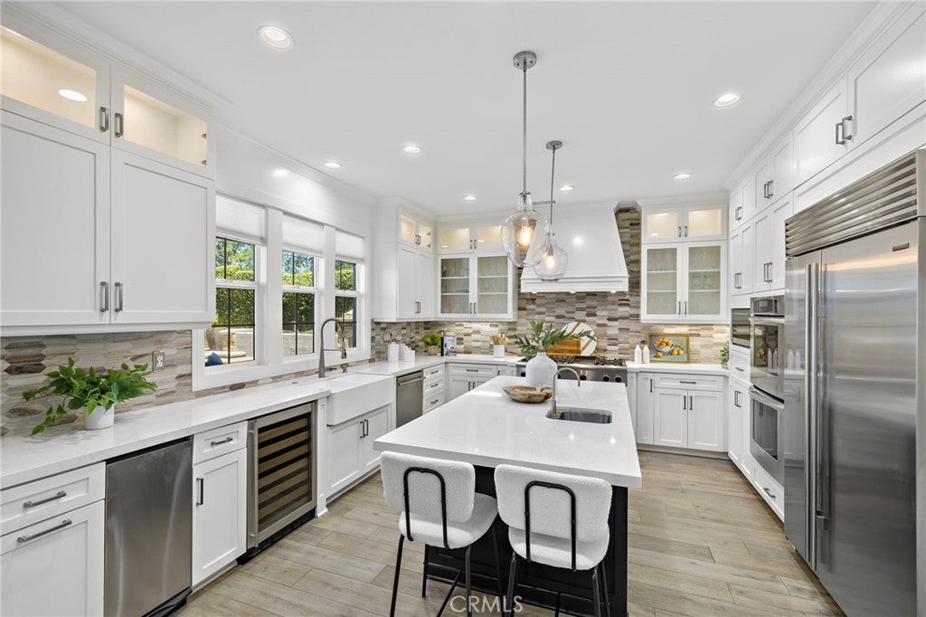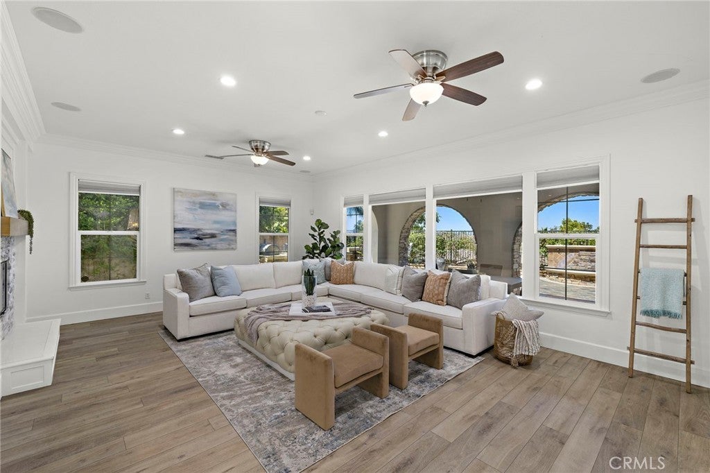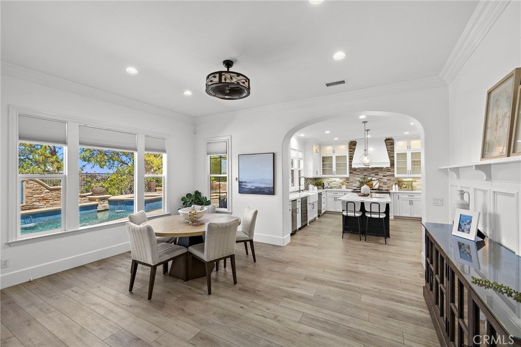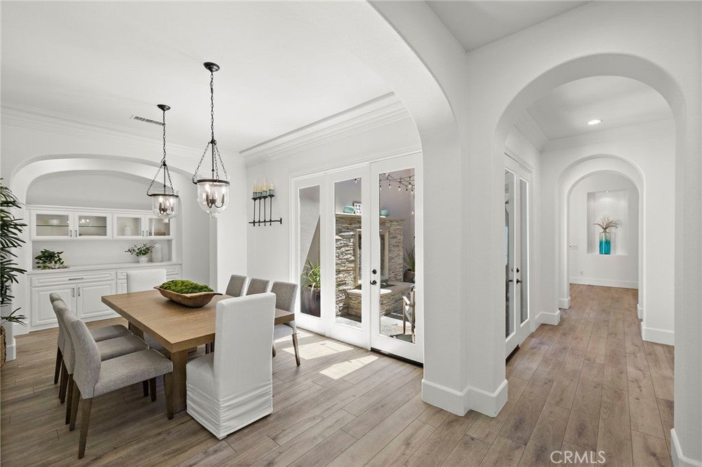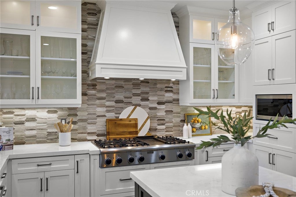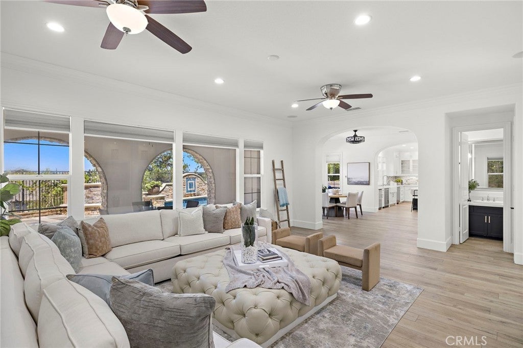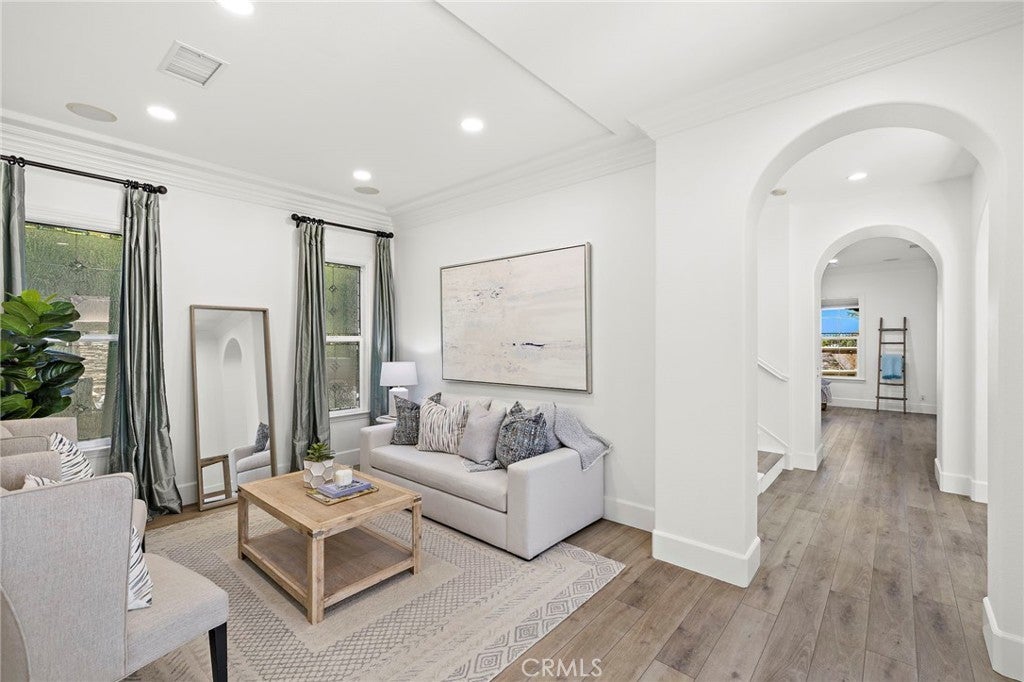 Luxurious Entertainer’s Dream Home with Panoramic Sunset Views! Located on one of the most coveted single-loaded cul-de-sac streets, this custom 5-bedroom, 5.5-bathroom estate spans nearly 5,000 square feet of thoughtfully designed living space on a 9,126 square foot lot. Enjoy the ultimate in privacy, elegance, and functionality with formal and casual living spaces that seamlessly flow indoors and out. Upon entry, you'll be welcomed by a sunlit foyer with lofty ceilings and views to a central courtyard. The heart of the home is the remodeled chef’s kitchen, complete with quartz countertops, Sub-Zero and Thermador appliances, wine fridge, new trash compactor, and custom cabinetry reaching to the ceiling. A spacious walk-in pantry, a custom hood and several picture windows complete this stunning space. Multiple living areas feature newer flooring throughout, custom built-ins, fresh paint inside, crown molding, LED recessed lighting and stunning views. Step outside into an entertainer’s paradise featuring a built-in barbecue island with seating, covered outdoor living space, a custom fireplace, water feature, pool and spa and an expansive side yard w/ synthetic turf— all set against jaw-dropping sunset and canyon views. Additional highlights include a serene interior courtyard with a custom fountain, a versatile third-level loft perfect for an in-home office or teen room and a three-car tandem garage outfitted with custom cabinetry, storage racks, and a tankless water heater. Upstairs, find four generous en-suite bedrooms and a spectacular primary suite with a private retreat, balcony, built-out cedar closet and a spa-inspired marble and stone bathroom. This exceptional home is further enhanced by fully OWNED SOLAR, whole-house epoxy repipe, dual-pane glass windows and plantation shutters. Every inch of this residence is designed for luxurious living and effortless entertaining in the premier South Orange County location of Covenant Hills.