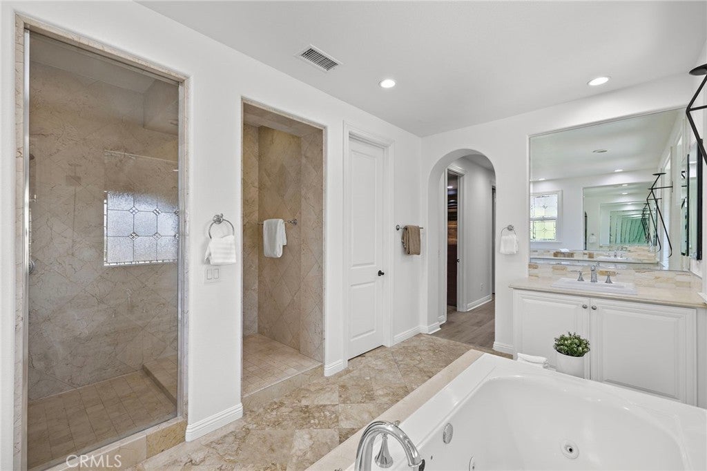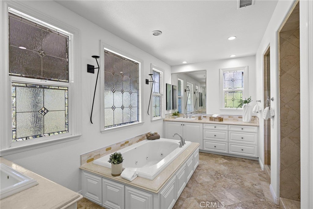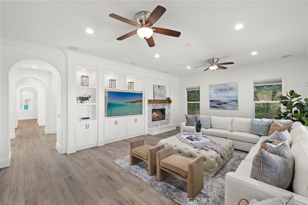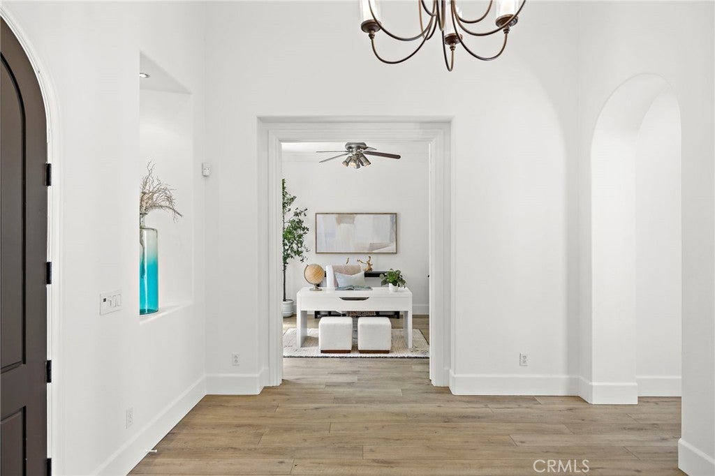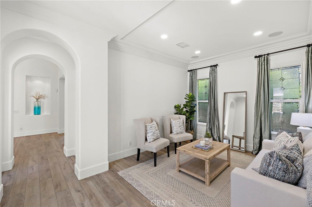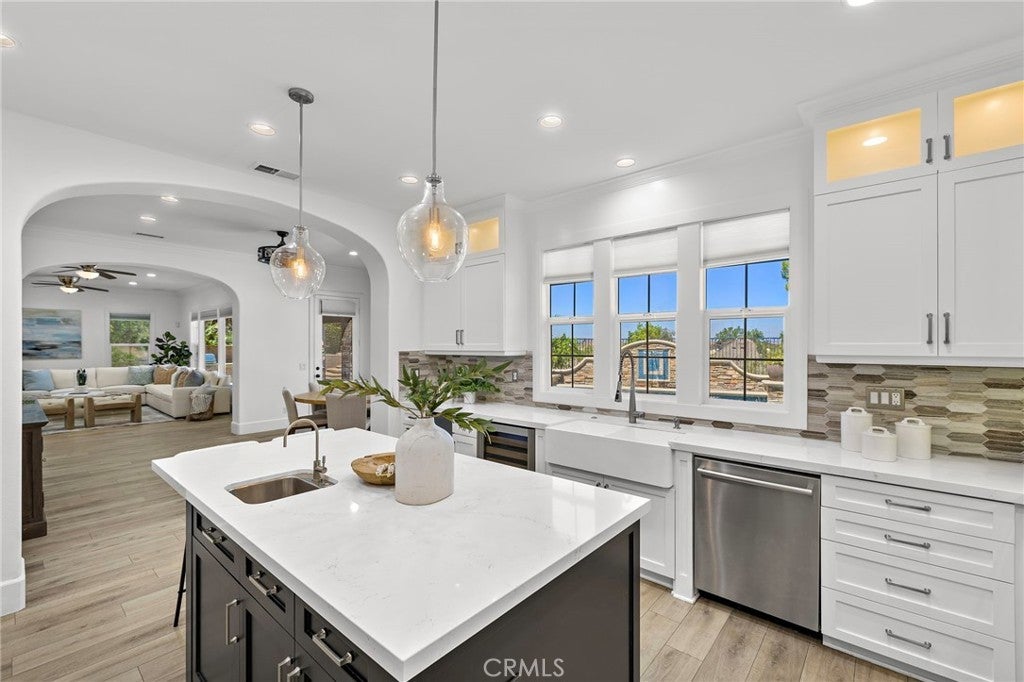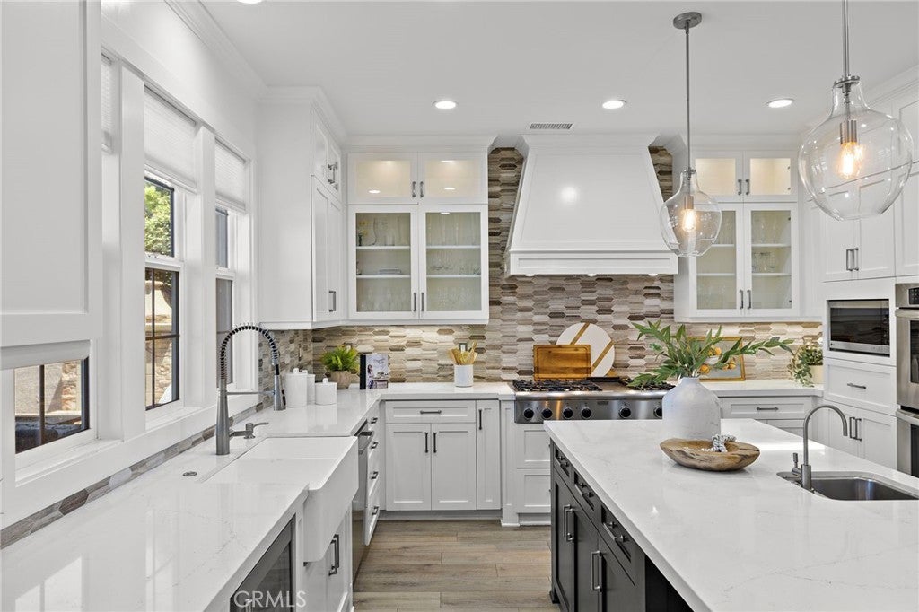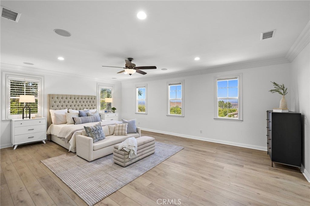 Luxurious Entertainer’s Dream Home with Panoramic Sunset Views! Located on one of the most coveted single-loaded cul-de-sac streets, this custom 5-bedroom, 5.5-bathroom estate spans nearly 5,000 square feet of thoughtfully designed living space on a 9,126 square foot lot. Enjoy the ultimate in privacy, elegance, and functionality with formal and casual living spaces that seamlessly flow indoors and out. Upon entry, you'll be welcomed by a sunlit foyer with lofty ceilings and views to a central courtyard. The heart of the home is the remodeled chef’s kitchen, complete with quartz countertops, Sub-Zero and Thermador appliances, wine fridge, new trash compactor, and custom cabinetry reaching to the ceiling. A spacious walk-in pantry, a custom hood and several picture windows complete this stunning space. Multiple living areas feature newer flooring throughout, custom built-ins, fresh paint inside, crown molding, LED recessed lighting and stunning views. Step outside into an entertainer’s paradise featuring a built-in barbecue island with seating, covered outdoor living space, a custom fireplace, water feature, pool and spa and an expansive side yard w/ synthetic turf— all set against jaw-dropping sunset and canyon views. Additional highlights include a serene interior courtyard with a custom fountain, a versatile third-level loft perfect for an in-home office or teen room and a three-car tandem garage outfitted with custom cabinetry, storage racks, and a tankless water heater. Upstairs, find four generous en-suite bedrooms and a spectacular primary suite with a private retreat, balcony, built-out cedar closet and a spa-inspired marble and stone bathroom. This exceptional home is further enhanced by fully OWNED SOLAR, whole-house epoxy repipe, dual-pane glass windows and plantation shutters. Every inch of this residence is designed for luxurious living and effortless entertaining in the premier South Orange County location of Covenant Hills.