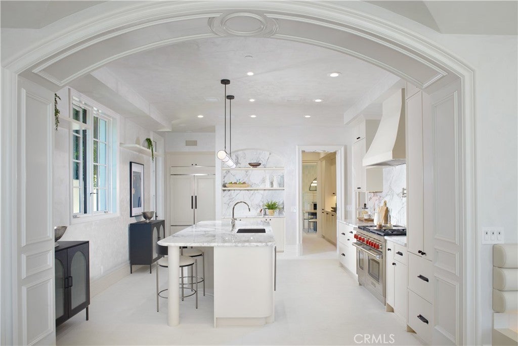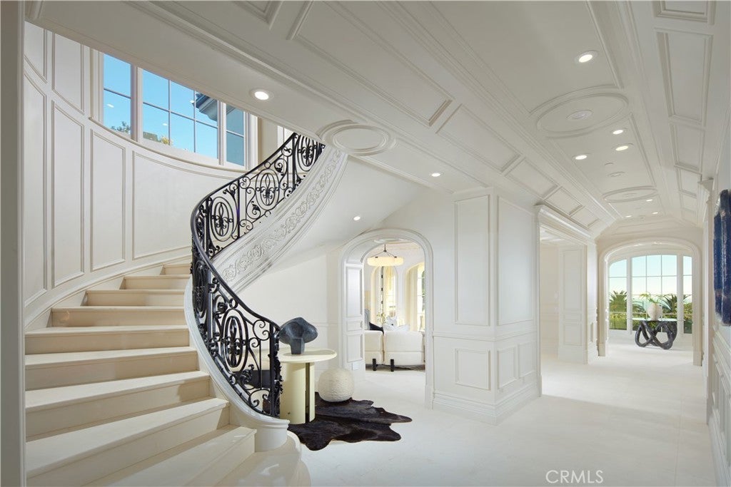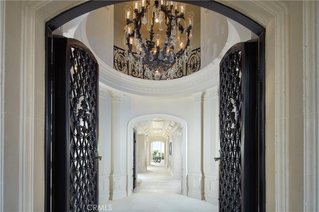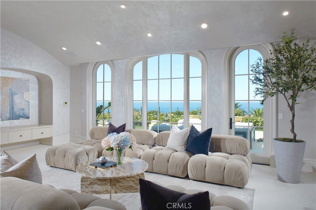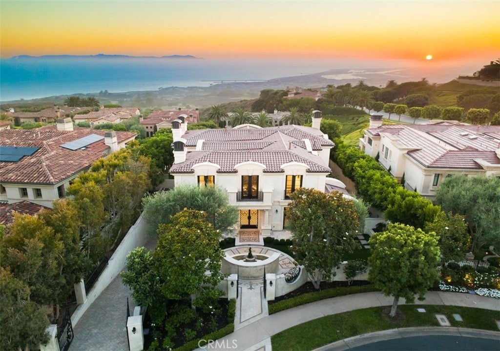 Exquisitely reimagined in 2025, this French palatial manor pairs timeless European elegance with fresh, modern sophistication. Set on a 13,155± sq. ft. parcel in the prestigious guard-gated enclave of Pelican Crest, the 8,367± sq. ft. residence commands sweeping views of the Pacific Ocean, Catalina Island, Newport Harbor, and the famed Pelican Hill Golf Course. Behind its stately façade, every detail has been elevated with the finest materials and craftsmanship: natural limestone and white oak herringbone floors, hand-brushed Venetian plaster, Moka Creme honed stone in all wet areas, and bespoke solid brass hardware in oil-rubbed bronze or polished nickel. The two-story foyer with antique chandelier leads to a grand staircase, gracious formal living and dining rooms with custom fireplaces, a richly appointed wood-paneled library, and a sun-filled family room with fireplace that adjoins the gourmet kitchen. A culinary showpiece, the kitchen featuring Calacatta Vagli marble surfaces, custom cabinetry, dual refrigerators, professional-grade appliance, and a built-in upholstered ocean-view banquette with custom breakfast table. The opulent primary suite offers a fireplace, spa-inspired bath with an ocean-view soaking tub, architectural glass-block accents for natural light, and a custom-designed closet. Additional amenities include five secondary suites, a tiered theater room, activity/fitness spaces, sauna, steam room, and a subterranean 7-car garage. Additional upgrades include a new roof, new HVAC system, all new plumbing connectors and two new water heaters. Outdoors, new stucco and roofing frame lush entertaining areas with a saltwater pool/spa and BBQ/kitchen with natural stone countertops — all set against a backdrop of endless coastal beauty. This is Newport Coast living at its most refined — where architectural artistry meets modern luxury in a rare, view-rich estate.