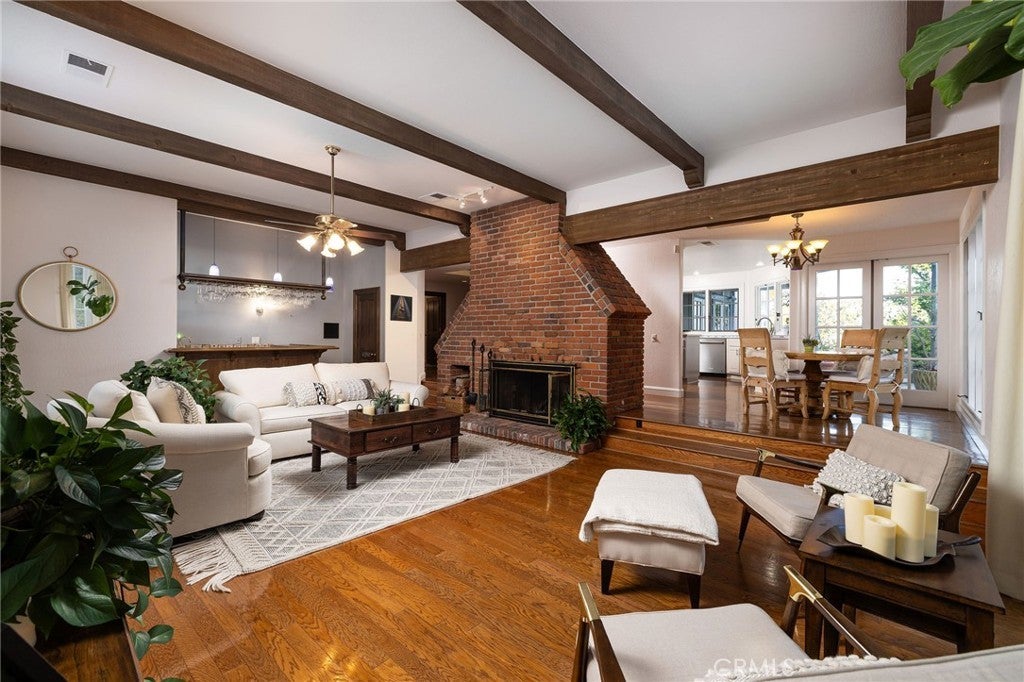 Beamed Ceilings, Breakfast Bar, Built-in Features, Ceiling Fan(s), Cathedral Ceiling(s), Separate/Formal Dining Room, High Ceilings, Pantry, Recessed Lighting, Storage, Sunken Living Room, Two Story Ceilings, Bar, Attic, Bedroom on Main Level, Entrance Foyer, Primary Suite, Walk-In Pantry, Walk-In Closet(s)